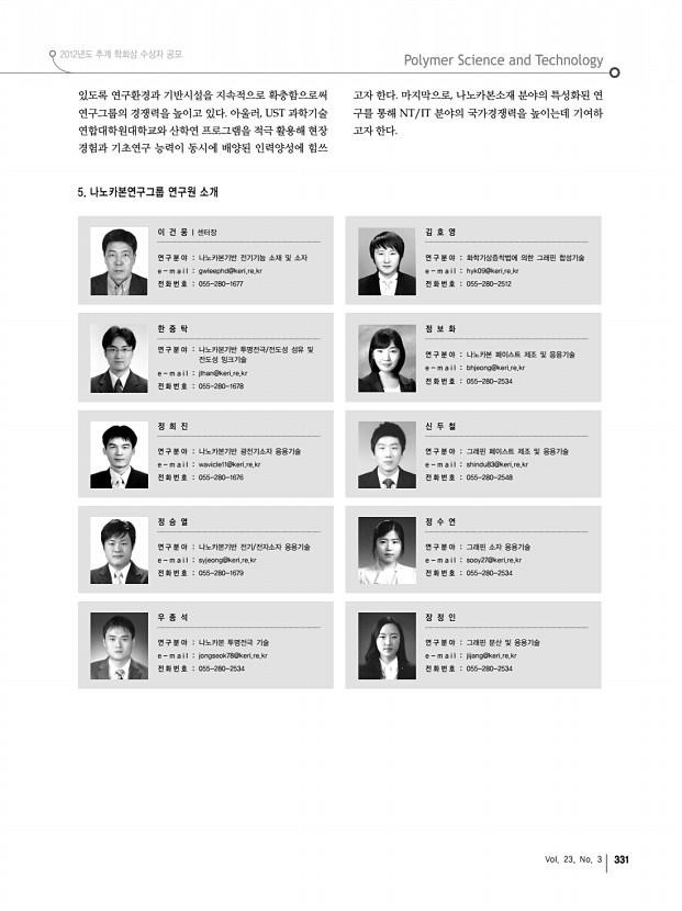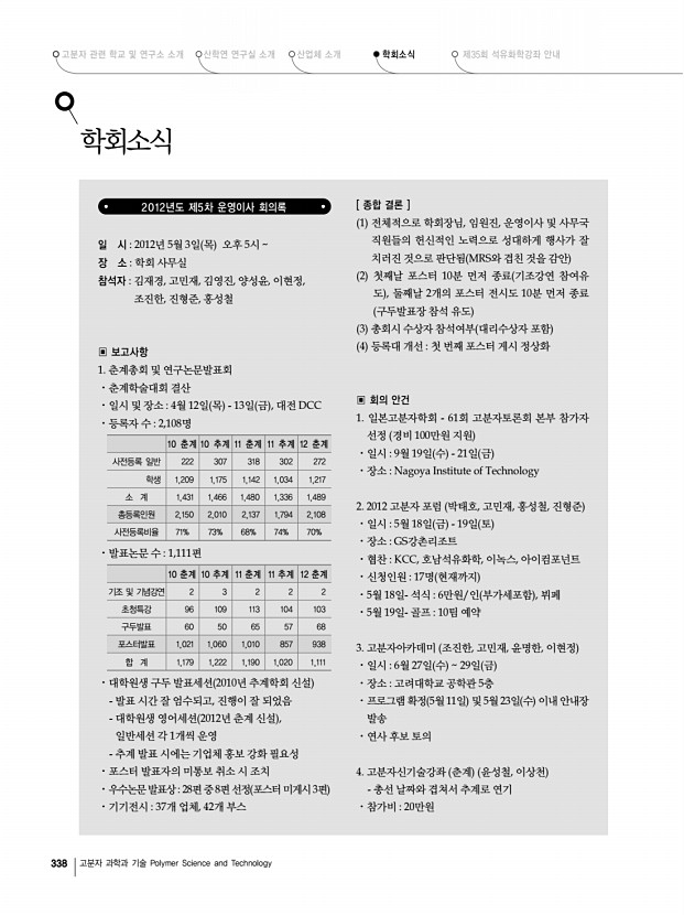 고분자 관련 학교 및 연구소 소개 산학연 연구실 소개 산업체 소개 학회소식 제35회 석유화학강좌 안내 338 고분자 과학과 기술 Polymer Science and Technology 학회소식 2012년도 제5차 운영이사 회의록 일 시 2012년 5월 3일 목 오후 5시 장 소 학회 사무실 참석자 김재경, 고민재, 김영진, 양성윤, 이현정, 조진한, 진형준, 홍성철 ▣ 보고사항 1. 춘계총회 및 연구논문발표회 ⋅춘계학술대회 결산 ⋅일시 및 장소 4월 12일 목 13일 금 , 대전 DCC ⋅등록자 수 2,108명 10 춘계 10 추계 11 춘계 11 추계 12 춘계 사전등록 일반 222 307 318 302 272 학생 1,209 1,175 1,142 1,034 1,217 소 계 1,431 1,466 1,480 1,336 1,489 총등록인원 2,150 2,010 2,137 1,794 2,108 사전등록비율 71% 73% 68% 74% 70% ⋅발표논문 수 1,111편 10 춘계 10 추계 11 춘계 11 추계 12 춘계 기조 및 기념강연 2 3 2 2 2 초청특강 96 109 113 104 103 구두발표 6...