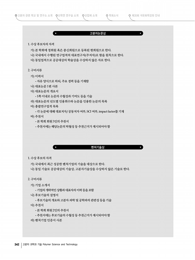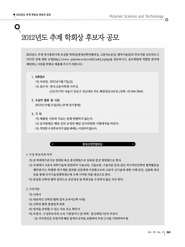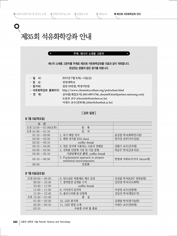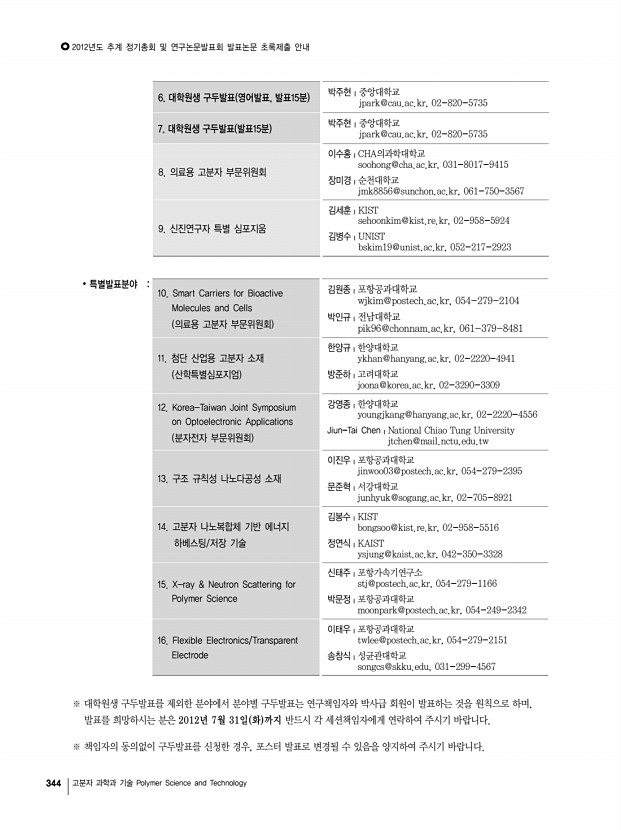 2012년도 추계 정기총회 및 연구논문발표회 발표논문 초록제출 안내 344 고분자 과학과 기술 Polymer Science and Technology 6. 대학원생 구두발표 영어발표, 발표15분 박주현╷중앙대학교 jpark@cau.ac.kr, 02-820-5735 7. 대학원생 구두발표 발표15분 박주현╷중앙대학교 jpark@cau.ac.kr, 02-820-5735 8. 의료용 고분자 부문위원회 이수홍╷CHA의과학대학교 soohong@cha.ac.kr, 031-8017-9415 장미경╷순천대학교 jmk8856@sunchon.ac.kr, 061-750-3567 9. 신진연구자 특별 심포지움 김세훈╷KIST sehoonkim@kist.re.kr, 02-958-5924 김병수╷UNIST bskim19@unist.ac.kr, 052-217-2923 ∙ 특별발표분야 10. Smart Carriers for Bioactive Molecules and Cells 의료용 고분자 부문위원회 김원종╷포항공과대학교 wjkim@postech.ac.kr, 054-279-2104 박인규╷전남대학교 pik96@chonnam.ac.kr, 061-379-8481 11. 첨단 산업용 고분자 소재 산학특별심포지엄 한양규╷한양대...
