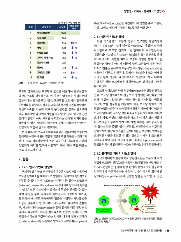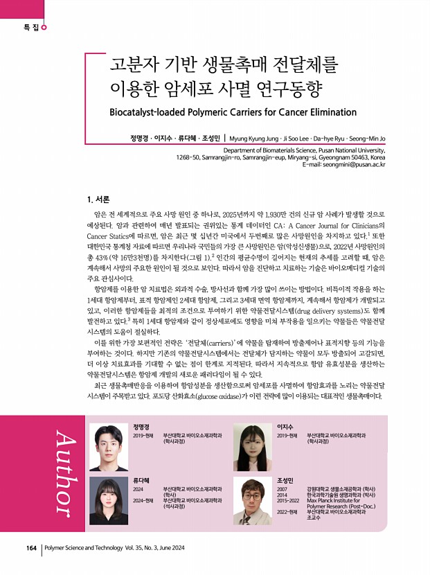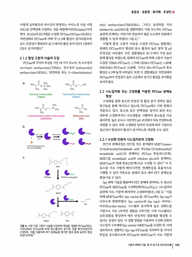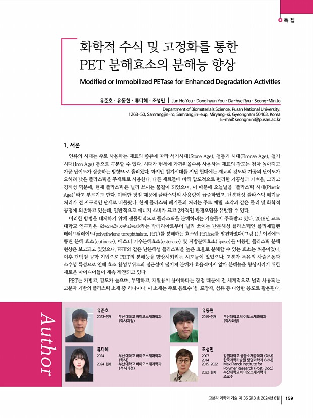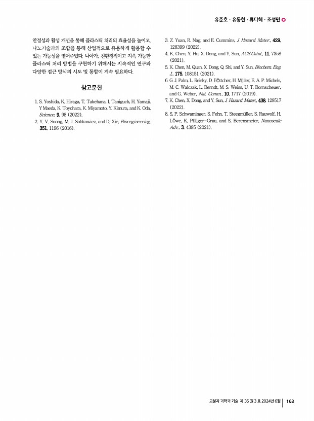 유준호ㆍ유동현ㆍ류다혜ㆍ조성민 고분자 과학과 기술 제 35 권 3 호 2024년 6월 163 안정성과 활성 개선을 통해 플라스틱 처리의 효율성을 높이고, 나노기술과의 조합을 통해 산업적으로 유용하게 활용할 수 있는 가능성을 열어주었다. 나아가, 친환경적이고 지속 가능한 플라스틱 처리 방법을 구현하기 위해서는 지속적인 연구와 다양한 접근 방식의 시도 및 통합이 계속 필요하다. 참고문헌 1. S. Yoshida, K. Hiraga, T. Takehana, I. Taniguch, H. Yamaji, Y Maeda, K. Toyohara, K. Miyamoto, Y. Kimura, and K. Oda, Science, 9, 98 2022 2. Y. V. Soong, M. J. Sobkowicz, and D. Xie, Bioengineering, 351, 1196 2016 3. Z. Yuan, R. Nag, and E. Cummins, J. Hazard. Mater., 429, 128399 2022 4. K. Chen, Y. Hu, X. Dong, and Y. Sun, ACS Catal., 11, 7358 2021 5. K. Chen, M. Quan, X. Dong, Q. Shi, and Y. Sun, Biochem. Eng. J., 175, 108151 2021 6. G. J. Palm, L. Reisky, D. B ttcher, H. M l...