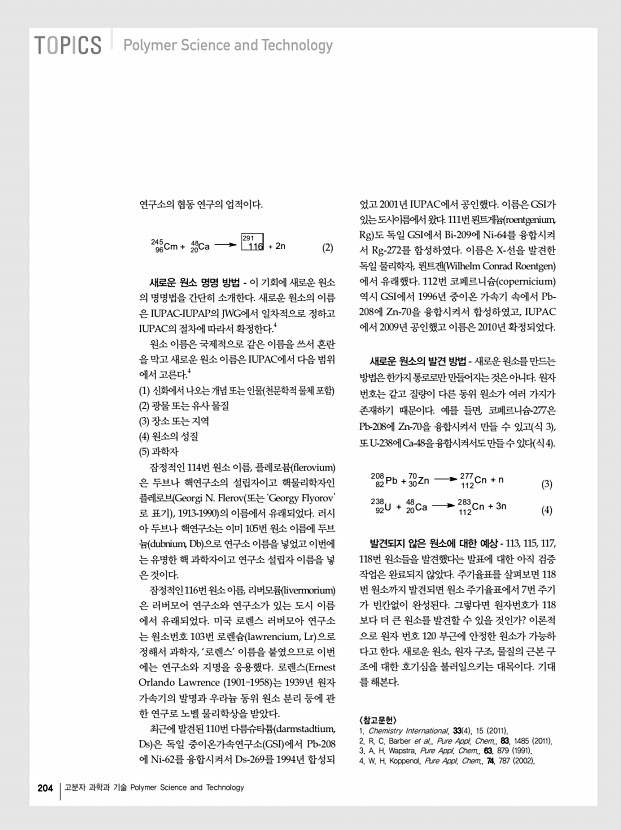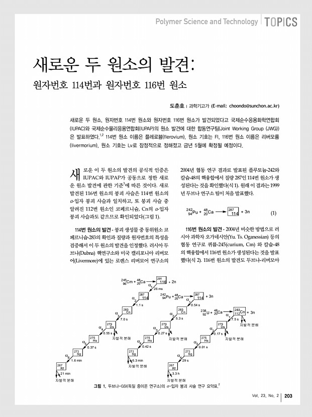 ...발적 분해 자발적 분해 자발적 분해 자발적 분해 1.1 s 7.0 s 0.55 s 0.37 s 1.6 min 21 min 287 114 α α α α 1 2 3 4 283 Cn Ds 279 Hs 275 Sg 271 자발적 분해 0.54 s 5.3 s 0.27 s 0.42 s 6.3 min 242 Pu + 48Ca + 3n α α α 1 2 3 283 Cn Ds 279 Hs 275 Sg 271 자발적 분해 7.5 s 0.17 s 0.01 s 238 U + 48Ca + 3n α4 Rf 267 자발적 분해 29 s 3.3 h 96 20 94 20 92 20 112 그림 1. 두브나-GSI 독일 중이온 연구소 의 α-입자 붕괴 사슬 연구 요약표.2 도춘호 과학기고가 E-mailchoondo@sunchon.ac.kr 새로운 두 원소, 원자번호 114번 원소와 원자번호 116번 원소가 발견되었다고 국제순수응용화학연합회 IUPAC 와 국제순수물리응용연합회 IUPAP 의 원소 발견에 대한 합동연구팀 Joint Working Group JWG 은 발표하였다.1,2 114번 원소 이름은 플레로븀 flerovium , 원소 기호는 Fl, 116번 원소 이름은 리버모륨 livermorium , 원소 기호는 Lv로 잠정적으로 정해졌고 금년 ...