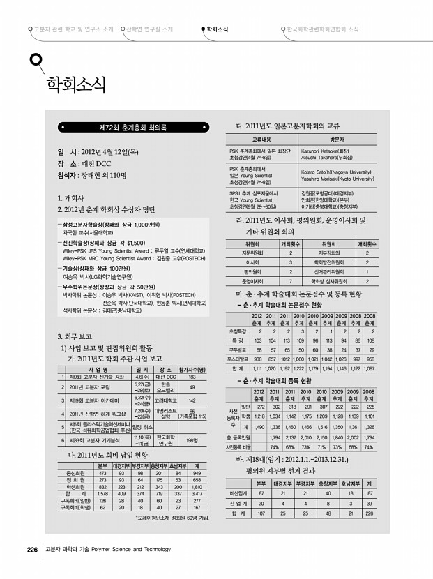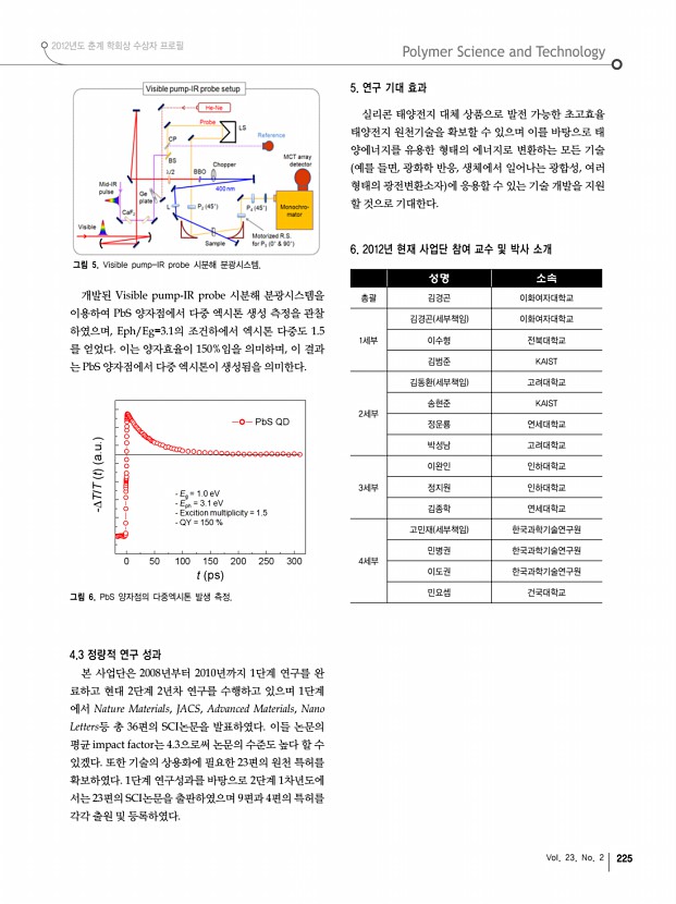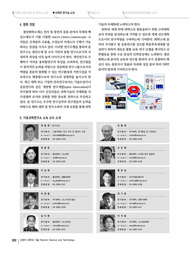 고분자 관련 학교 및 연구소 소개 산학연 연구실 소개 학회소식 한국화학관련학회연합회 소식 222 고분자 과학과 기술 Polymer Science and Technology 5. 기초과학연구소 소속 교수 소개 최 동 훈 | 연구소장 조 봉 래 연 구 분 야 e m a i l 전 화 번 호 고분자화학, 유기 전자 및 광전자 소재 dhchoi8803@korea.ac.kr 02-3290-3140 연 구 분 야 e m a i l 전 화 번 호 유기화학, 유기합성 및 구조분석 chobr@korea.ac.kr 02-3290-3129 최 종 호 조 민 행 연 구 분 야 e m a i l 전 화 번 호 물리화학, 나노화학 jhc@korea.ac.kr 02-3290-3135 연 구 분 야 e m a i l 전 화 번 호 물리화학, 다차원 분자 분광학 mcho@korea.ac.kr 02-3290-3133 이 상 원 홍 창 섭 연 구 분 야 e m a i l 전 화 번 호 물리화학, 생물리화학 sw_lee@korea.ac.kr 02-3290-3137 연 구 분 야 e m a i l 전 화 번 호 무기/재료/에너지 cshong@korea.ac.kr 02-3290-3138 이 광 렬 최 기...