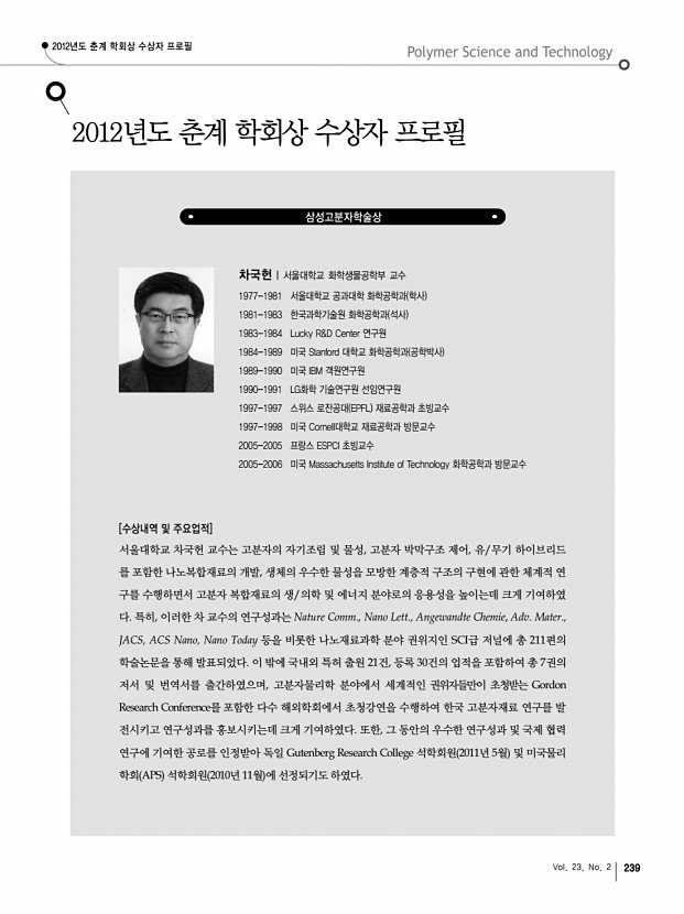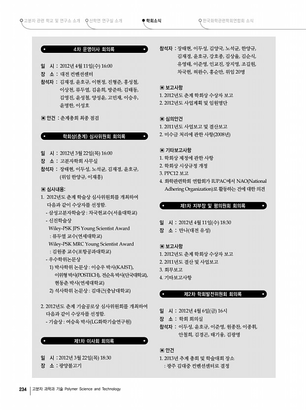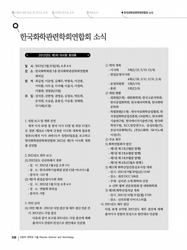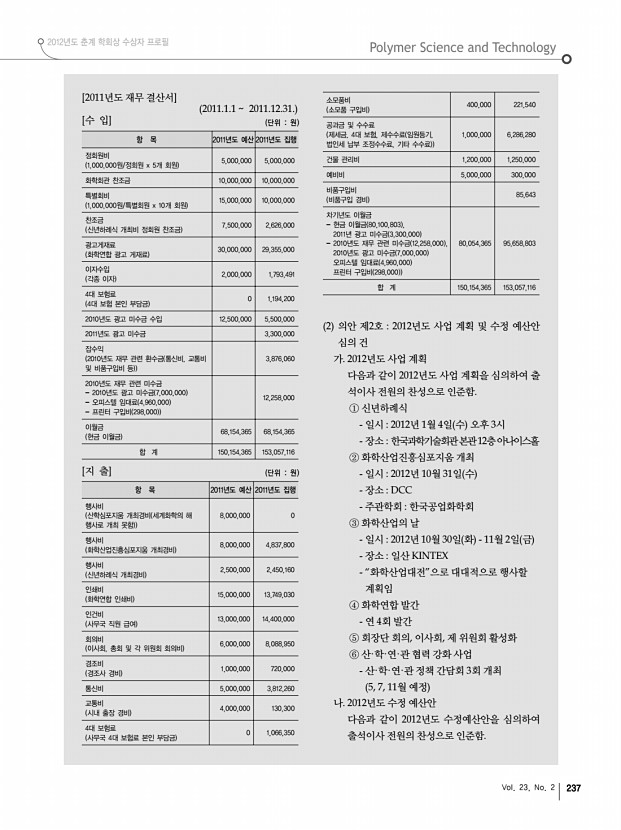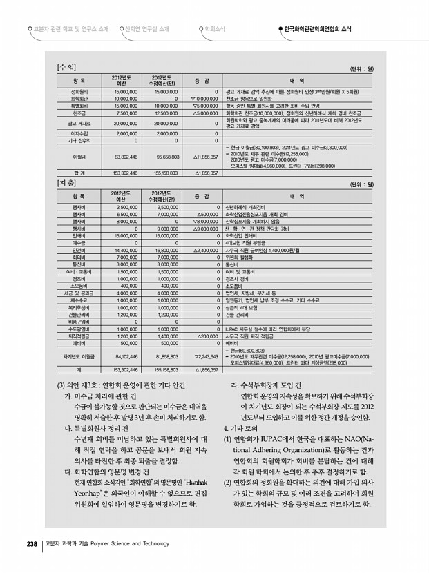 고분자 관련 학교 및 연구소 소개 산학연 연구실 소개 학회소식 한국화학관련학회연합회 소식 238 고분자 과학과 기술 Polymer Science and Technology [수 입] 항 목 2012년도 예산 2012년도 수정예산 안 증 감 내 역 정회원비 15,000,000 15,000,000 0 광고 게재료 감액 추진에 따른 정회원비 인상 3백만원/회원 X 5회원 화학회관 10,000,000 0 ▽10,000,000 찬조금 항목으로 일원화 특별회비 15,000,000 10,000,000 ▽5,000,000 활동 중인 특별 회원사를 고려한 회비 수입 반영 찬조금 7,500,000 12,500,000 △5,000,000 화학회관 찬조금 10,000,000 , 정회원의 신년하례식 개최 경비 찬조금 광고 게재료 20,000,000 20,000,000 0 회원학회와 광고 중복게재의 어려움에 따라 2011년도에 비해 2012년도 광고 게재료 감액 이자수입 2,000,000 2,000,000 0 기타 잡수익 0 0 0 이월금 83,802,446 95,658,803 △11,856,357 현금 이월금 80,100,803...