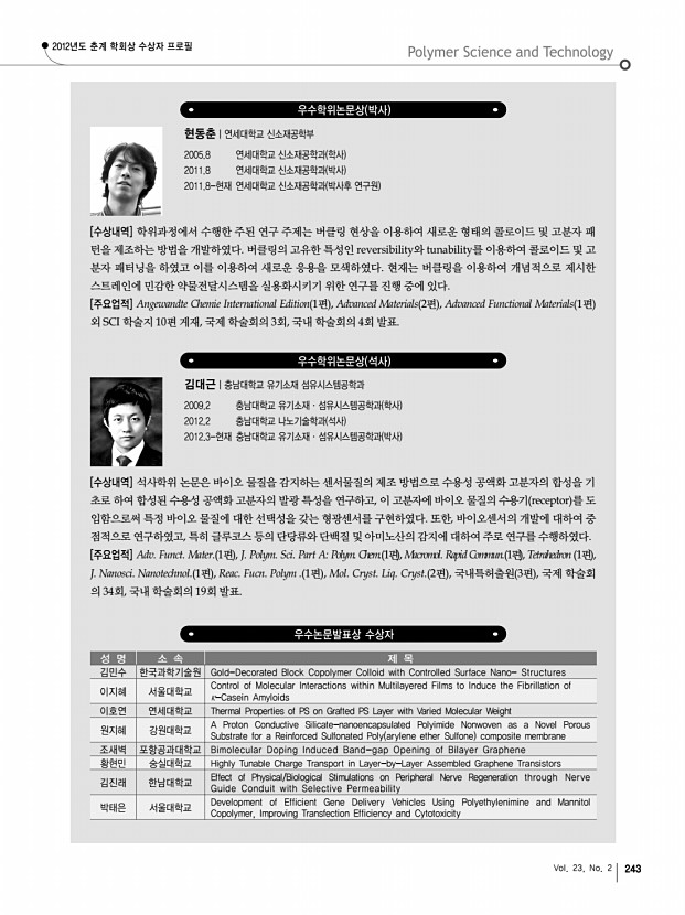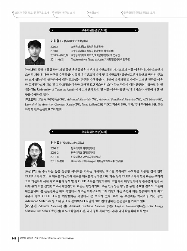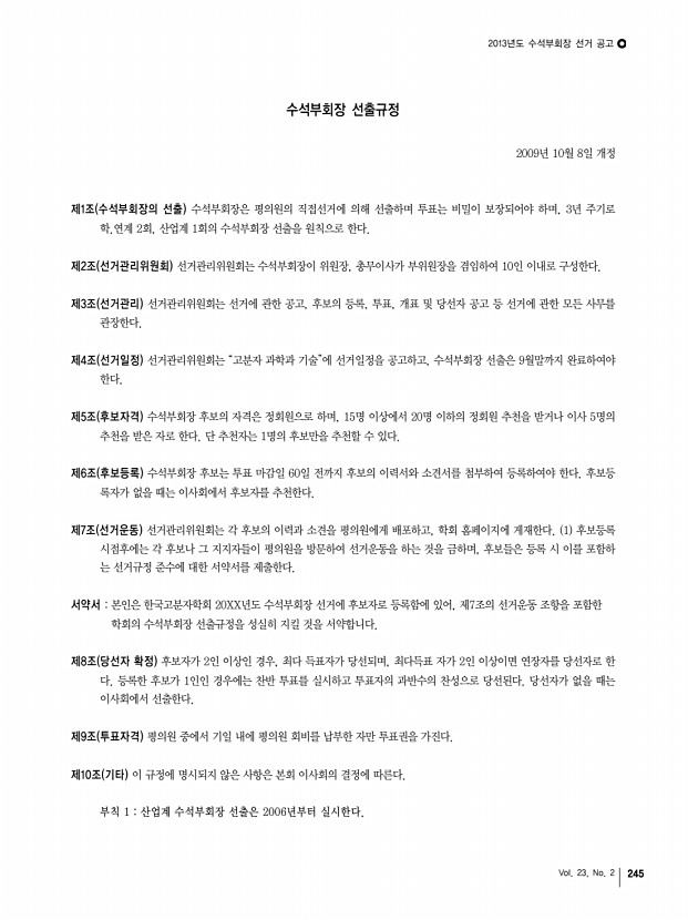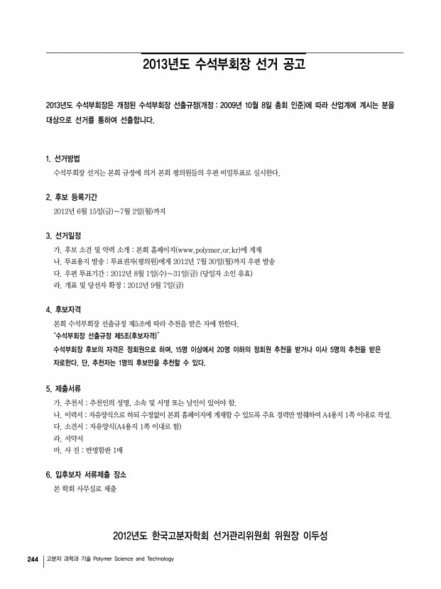 ...며, 3년 주기로 학.연계 2회, 산업계 1회의 수석부회장 선출을 원칙으로 한다. 제2조 선거관리위원회 선거관리위원회는 수석부회장이 위원장, 총무이사가 부위원장을 겸임하여 10인 이내로 구성한다. 제3조 선거관리 선거관리위원회는 선거에 관한 공고, 후보의 등록, 투표, 개표 및 당선자 공고 등 선거에 관한 모든 사무를 관장한다. 제4조 선거일정 선거관리위원회는 “고분자 과학과 기술”에 선거일정을 공고하고, 수석부회장 선출은 9월말까지 완료하여야 한다. 제5조 후보자격 수석부회장 후보의 자격은 정회원으로 하며, 15명 이상에서 20명 이하의 정회원 추천을 받거나 이사 5명의 추천을 받은 자로 한다. 단 추천자는 1명의 후보만을 추천할 수 있다. 제6조 후보등록 수석부회장 후보는 투표 마감일 60일 전까지 후보의 이력서와 소견서를 첨부하여 ...
