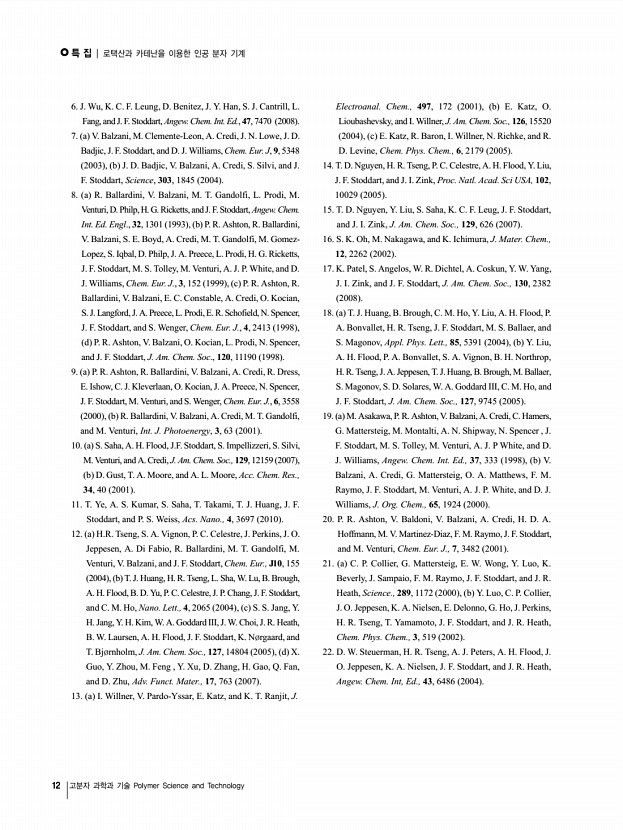 특 집 | 로택산과 카테난을 이용한 인공 분자 기계 12 고분자 과학과 기술 Polymer Science and Technology 6. J. Wu, K. C. F. Leung, D. Benitez, J. Y. Han, S. J. Cantrill, L. Fang, and J. F. Stoddart, Angew. Chem. Int. Ed., 47, 7470 2008 7. a V. Balzani, M. Clemente-Leon, A. Credi, J. N. Lowe, J. D. Badjic, J. F. Stoddart, and D. J. Williams, Chem. Eur. J, 9, 5348 2003 , b J. D. Badjic, V. Balzani, A. Credi, S. Silvi, and J. F. Stoddart, Science, 303, 1845 2004 8. a R. Ballardini, V. Balzani, M. T. Gandolfi, L. Prodi, M. Venturi, D. Philp, H. G. Ricketts, and J. F. Stoddart, Angew. Chem. Int. Ed. Engl., 32, 1301 1993 , b P. R. Ashton, R. Ballardini, V. Balzani, S. E. Boyd, A. Credi, M. T. Gandolfi, M. GomezLopez, S. Iqbal, D. Philp, J. A. Preece, L. Prodi, H. G. Ricketts, J. F. Stoddart, M. S. Tolley, M. Venturi, A. J. P. White, and D. J. Williams, Chem. Eur. J., 3, 152 1999 , c P. R. Ashton, R. Ballardini, V. Balzani, E. C. Constable, A. Credi, O. Kocian, S. J. La...