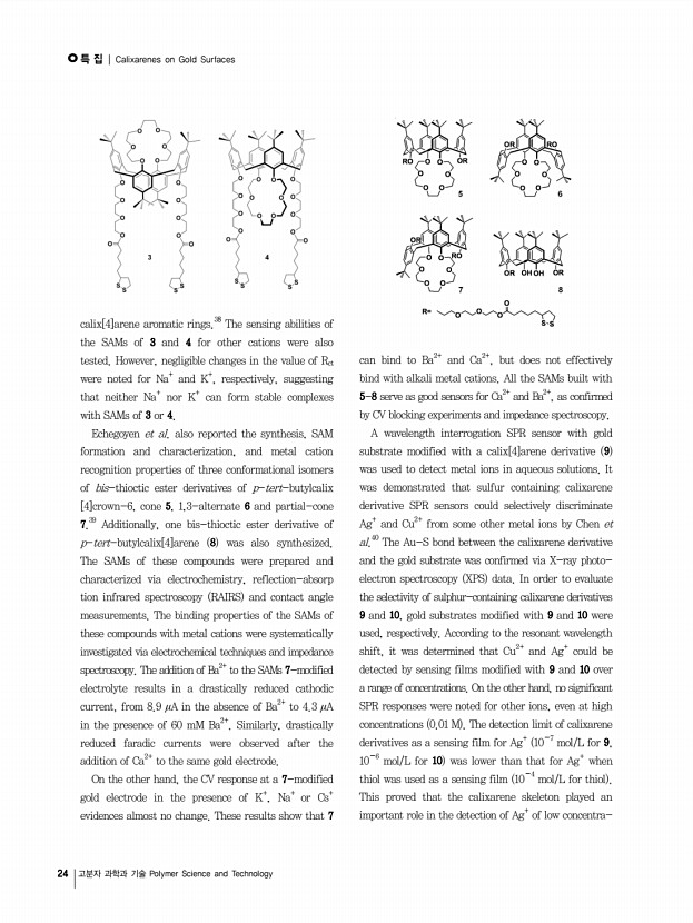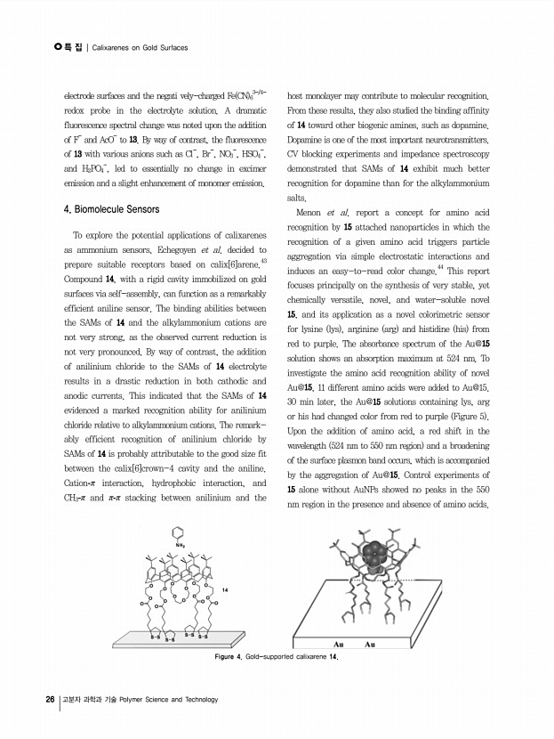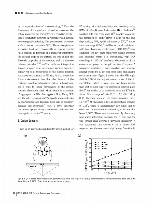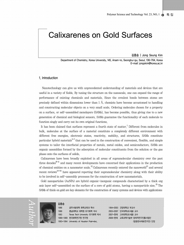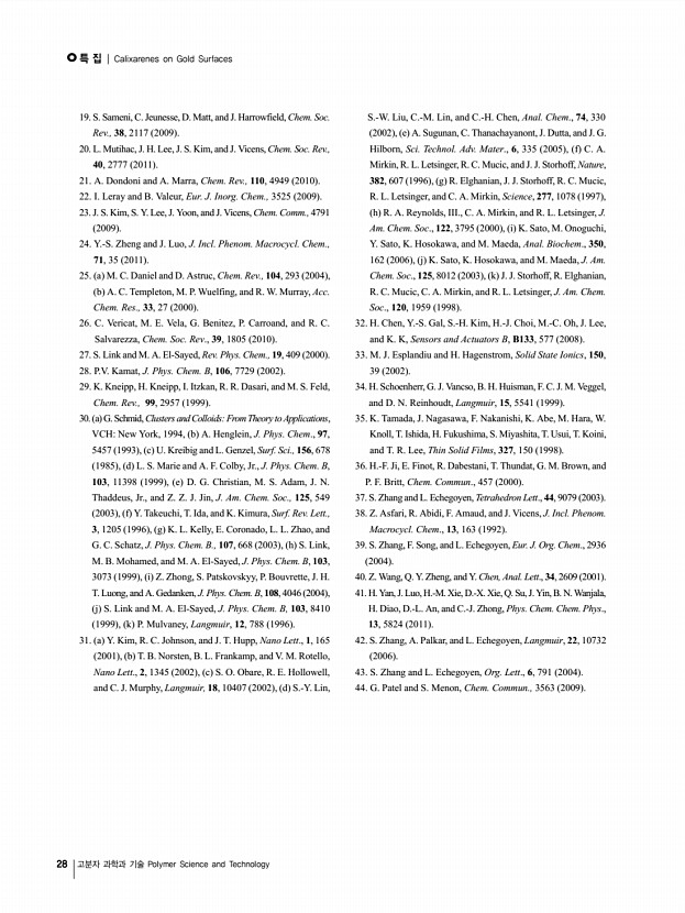 특 집 | Calixarenes on Gold Surfaces 28 고분자 과학과 기술 Polymer Science and Technology 19. S. Sameni, C. Jeunesse, D. Matt, and J. Harrowfield, Chem. Soc. Rev., 38, 2117 2009 20. L. Mutihac, J. H. Lee, J. S. Kim, and J. Vicens, Chem. Soc. Rev., 40, 2777 2011 21. A. Dondoni and A. Marra, Chem. Rev., 110, 4949 2010 22. I. Leray and B. Valeur, Eur. J. Inorg. Chem., 3525 2009 23. J. S. Kim, S. Y. Lee, J. Yoon, and J. Vicens, Chem. Comm., 4791 2009 24. Y.-S. Zheng and J. Luo, J. Incl. Phenom. Macrocycl. Chem., 71, 35 2011 25. a M. C. Daniel and D. Astruc, Chem. Rev., 104, 293 2004 , b A. C. Templeton, M. P. Wuelfing, and R. W. Murray, Acc. Chem. Res., 33, 27 2000 26. C. Vericat, M. E. Vela, G. Benitez, P. Carroand, and R. C. Salvarezza, Chem. Soc. Rev., 39, 1805 2010 27. S. Link and M. A. El-Sayed, Rev. Phys. Chem., 19, 409 2000 28. P.V. Kamat, J. Phys. Chem. B, 106, 7729 2002 29. K. Kneipp, H. Kneipp, I. Itzkan, R. R. Dasari, and M. S. Feld, Chem. Rev., 99, 2957 1999 30. a G. ...
