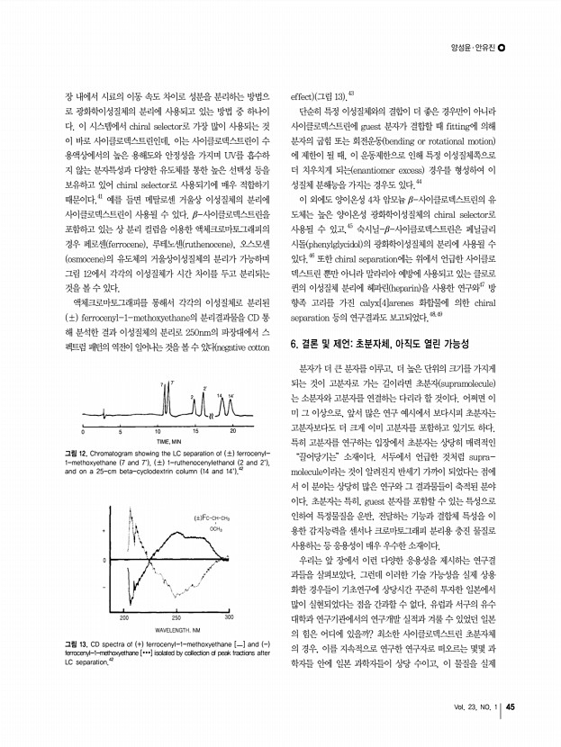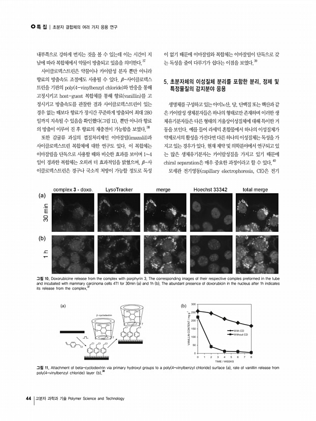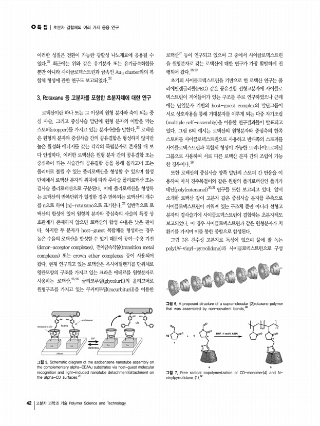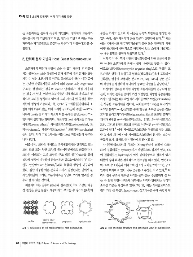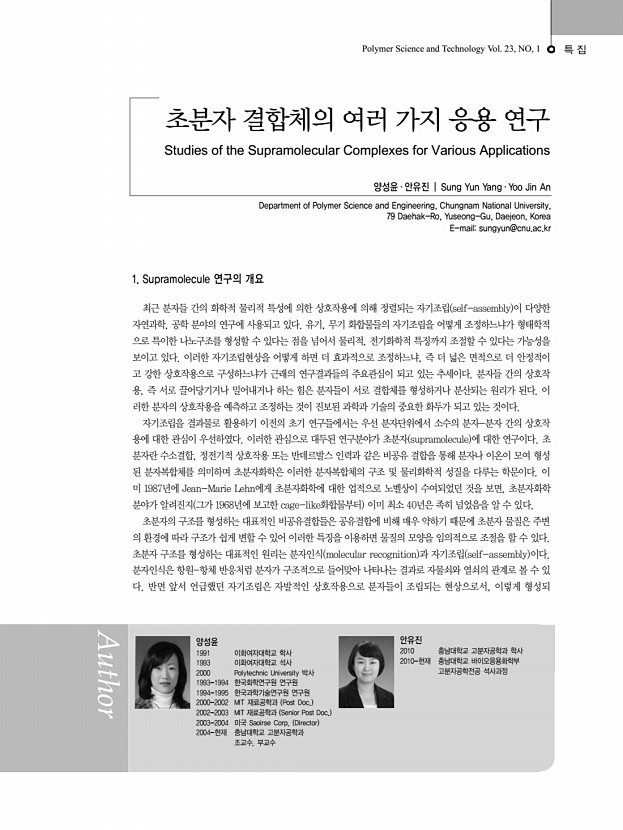 ..., NO, 1 특 집 초분자 결합체의 여러 가지 응용 연구 Studies of the Supramolecular Complexes for Various Applications 양성윤 ․ 안유진 | Sung Yun Yang ․ Yoo Jin An Department of Polymer Science and Engineering, Chungnam National University, 79 Daehak-Ro, Yuseong-Gu, Daejeon, Korea E-mailsungyun@cnu.ac.kr 양성윤 1991 이화여자대학교 학사 1993 이화여자대학교 석사 2000 Polytechnic University 박사 1993-1994 한국화학연구원 연구원 1994-1995 한국과학기술연구원 연구원 2000-2002 MIT 재료공학과 Post Doc. 2002-2003 MIT 재료공학과 Senior Post Doc. 2003-2004 미국 Saoirse Corp. Director 2004-현재 충남대학교 고분자공학과 조교수, 부교수 안유진 2010 충남대학교 고분자공학과 학사 2010-현재 충남대학교 바이오응용화학부 고분자공학전공 석사과정 1. Supramolecule 연구의 개요 최근 분자들 간의 화학적 물리적 특성에 의한 상호작용에 의해 정렬되...