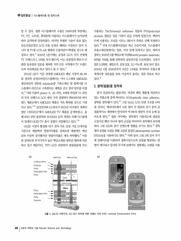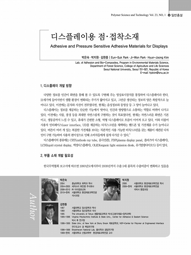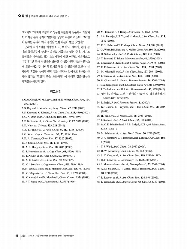 특 집 | 초분자 결합체의 여러 가지 응용 연구 46 고분자 과학과 기술 Polymer Science and Technology 크로마토그래피에 적용하고 상용한 제품들이 일본에서 개발되 어 카이랄 분리 정제기기분야를 상당히 독점하고 있다. 그러면 이 분야는 우리가 아직 경쟁할 만한 부분이 없는 것인가? 근래에 자기조립을 이용한 나노, 바이오, 에너지, 환경 분 야의 국내연구가 상당한 발전을 거듭하고 있는 중에, 자기조 립현상을 기반으로 하는 초분자체에 대한 연구도 지속적으로 이루어지면 국가 경쟁력을 강화할 수 있는 원천기술과 원천소 재 개발이라는 두 마리의 토끼를 잡을 수 있을지도 모른다. 분 자들의 혼합물 속에서 원치 않는 분자는 밀어내고 원하는 분 자를 당기는 ‘밀당의 고수, 초분자체’ 에 우리도 깊은 관심을 가져봄은 어떨까 한다. 참고문헌 1. G.W. Gokel, W. ...