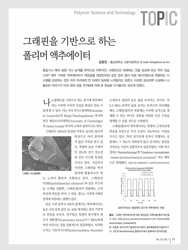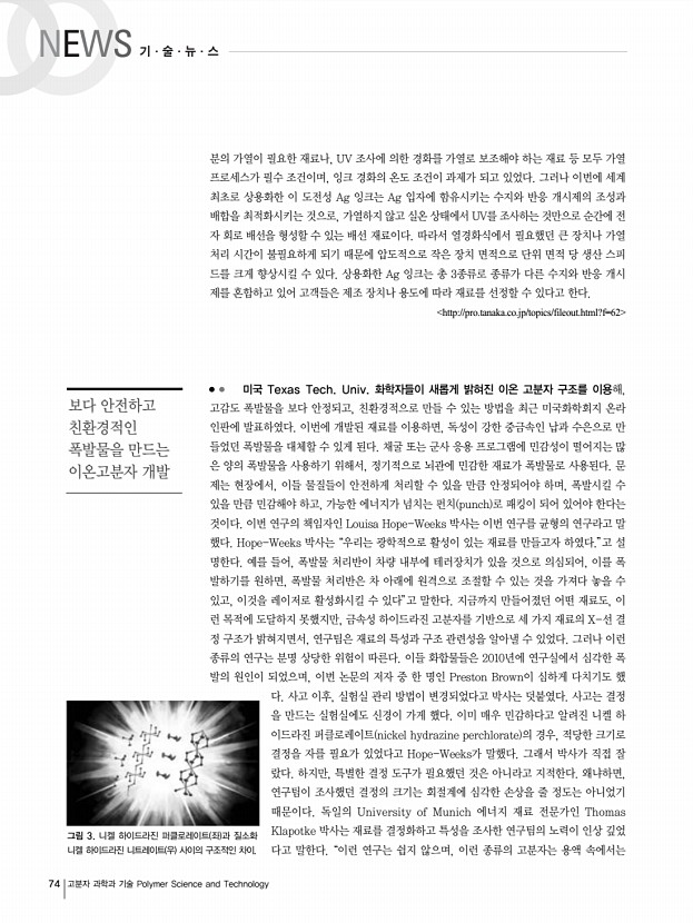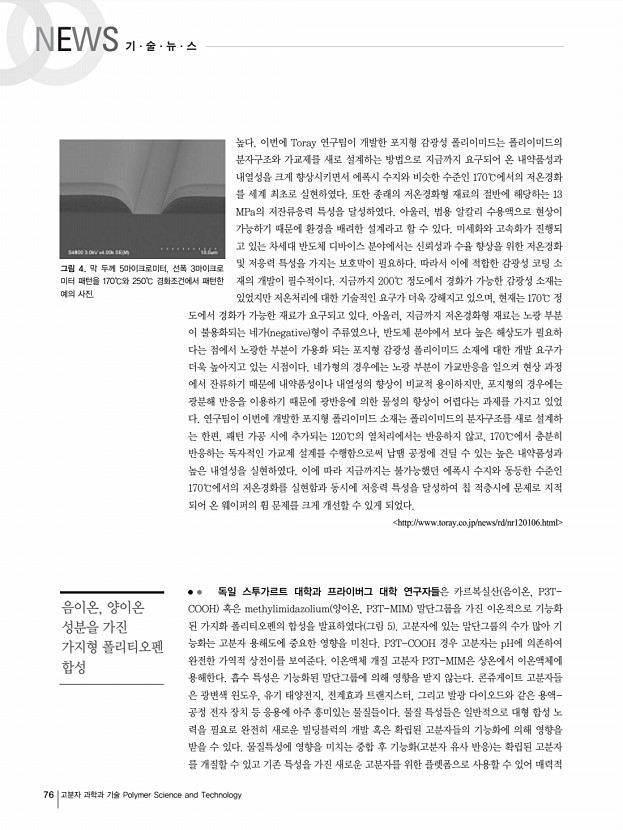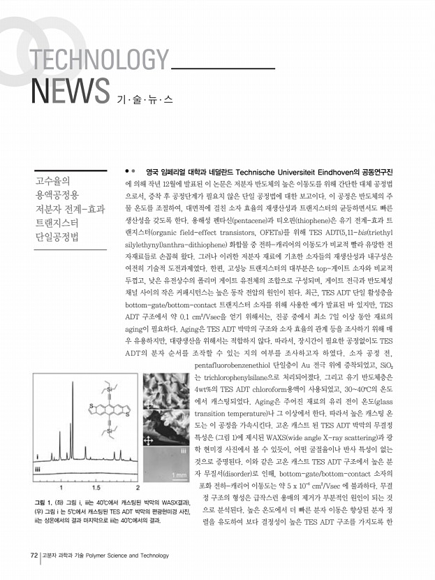 72 고분자 과학과 기술 Polymer Science and Technology 영국 임페리얼 대학과 네덜란드 Technische Universiteit Eindhoven의 공동연구진 에 의해 작년 12월에 발표된 이 논문은 저분자 반도체의 높은 이동도를 위해 간단한 대체 공정법 으로서, 증착 후 공정단계가 필요치 않은 단일 공정법에 대한 보고이다. 이 공정은 반도체의 주 물 온도를 조절하여, 대면적에 걸친 소자 효율의 재생산성과 트랜지스터의 균등하면서도 빠른 생산성을 갖도록 한다. 용해성 펜타신 pentacene 과 티오핀 thiophene 은 유기 전계-효과 트 랜지스터 organic field-effect transistors, OFETs 를 위해 TES ADT 5,11-bis triethyl silylethynyl anthra-dithiophene 화합물 중 전하-캐리어의 이동도가 비교적 빨라 유망한 전 자재료들로 손꼽혀 왔다. 그러나 이러한 저분자 재료에 기초한 소자들의 재생산성과 내구성은 여전히 기술적 ...