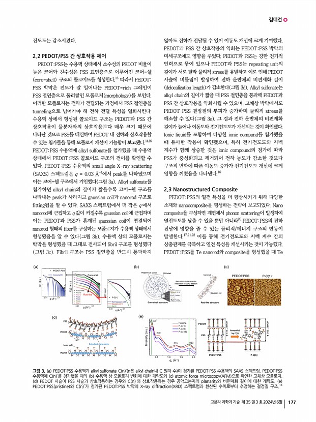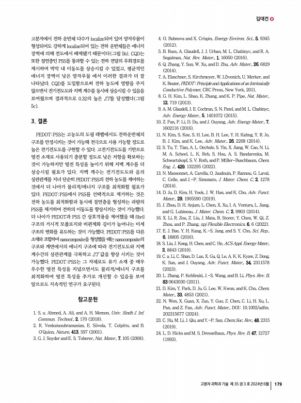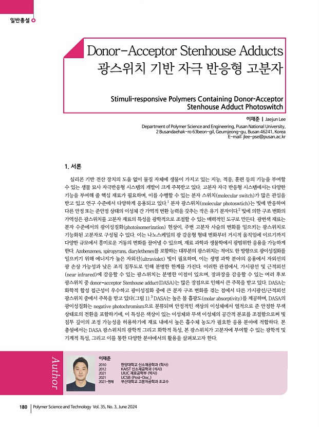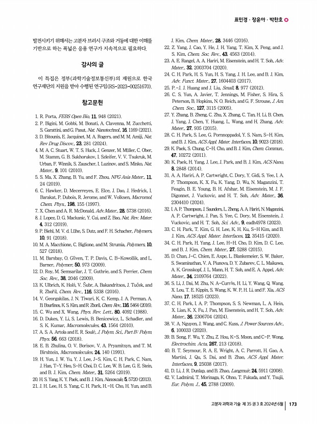 표민경ㆍ장윤아ㆍ박찬호 고분자 과학과 기술 제 35 권 3 호 2024년 6월 173 발전시키기 위해서는 고분자 브러시 구조와 거동에 대한 이해를 기반으로 하는 폭넓은 응용 연구가 지속적으로 필요하다. 감사의 글 이 특집은 정부 과학기술정보통신부 의 재원으로 한국 연구재단의 지원을 받아 수행된 연구임 RS-2023-00251670 참고문헌 1. R. Porta, FEBS Open Bio, 11, 948 2021 2. P. Bigini, M. Gobbi, M. Bonati, A. Clavenna, M. Zucchetti, S. Garattini, and G. Pasut, Nat. Nanotechnol., 16, 1169 2021 3. D. Bitounis, E. Jacquinet, M. A. Rogers, and M. M. Amiji, Nat. Rev Drug Discov., 23, 281 2024 4. M. A. C. Stuart, W. T. S. Huck, J. Genzer, M. M ller, C. Ober, M. Stamm, G. B. Sukhorukov, I. Szleifer, V. V. Tsukruk, M. Urban, F. Winnik, S. Zauscher, I. Luzinov, and S. Minko, Nat. Mater., 9, 101 2010 5. S. Ma, X. Zhang, B. Yu, and F. Zhou, NPG Asia Mater., 11, 24 2019 6. C. Hawker, D. Mecerreyes, E. Elc...