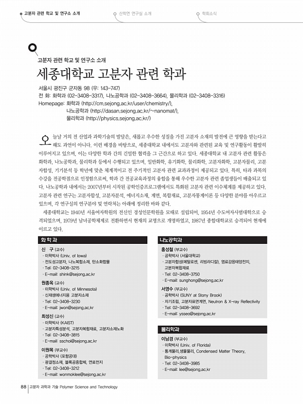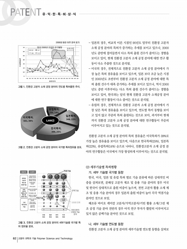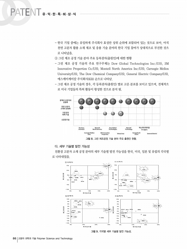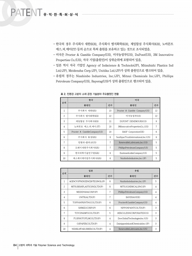 한국의 경우 주식회사 새한 KR , 주식회사 엘지화학 KR , 제일합섬 주식회사 KR , 노바몬트 에스.피.에이 IT 등의 순으로 특허 출원을 보유하고 있는 것으로 조사되었음. 미국은 Procter & Gamble Company US , 미국농림부 US , DuPont US , 3M Innovative Properties Co. US , 자국 기업 출원인 이 상위순위에 포함되어 있음. 일본 역시 자국 기업인 Agency of Indscience & Technolo JP , Mitsubishi Plastics Ind Ltd. JP , Meidensha Corp. JP , Unitika Ltd. JP 가 상위 출원인으로 랭크되어 있음. 유럽의 경우는 Nisshinbo Industries, Inc. JP , Mitsui Chemicals Inc. JP , Phillips Petroleum Company US , Bayerag US 가 상위 출원인으로 랭크되어 있음. PATENT 유∙익∙한∙특∙허∙상∙식 84 고분자 과학과 기술 Polymer Science and Technology 표 2. 친환경 고분자 소재 공정 기술분야 주요출원인현황