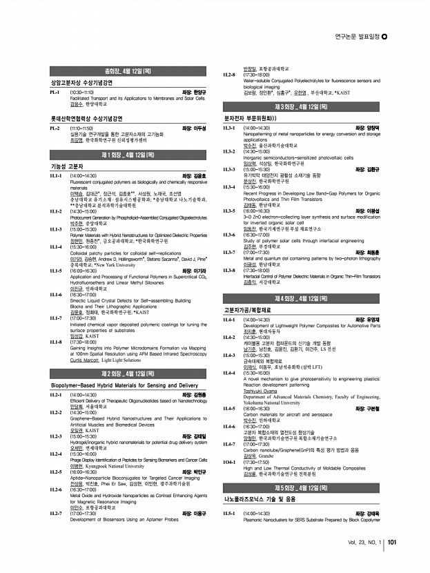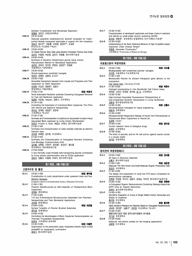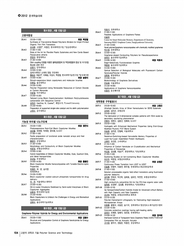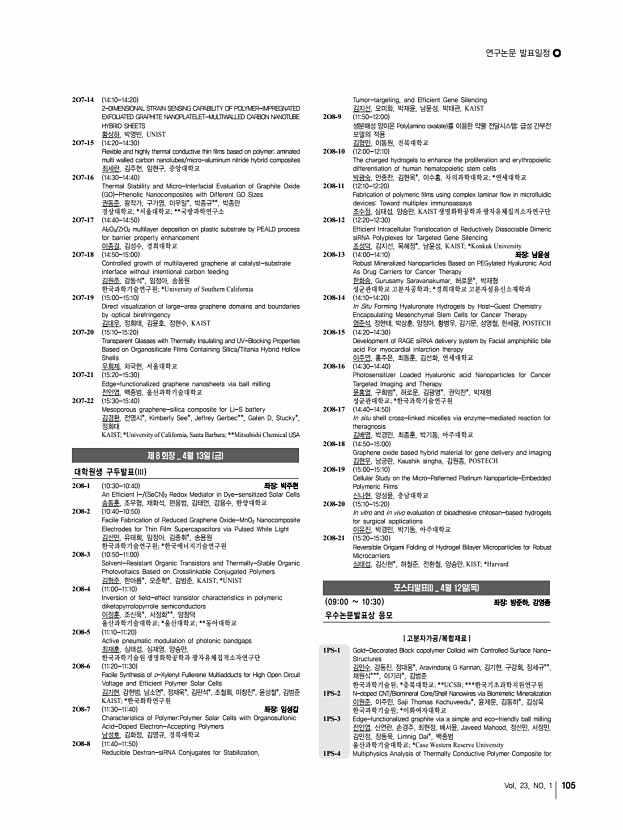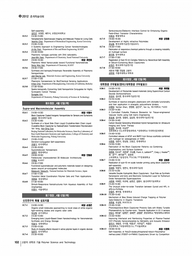 ...1 103 between Crystallization and Microphase Separation 문홍철, 김진곤, 포항공과대학교 1O8-14 1610-1620 Reduced graphene oxide/poly vinyl alcohol composite for inkjetprinted flexible transparent electrodes in organic thin film transistors 강보석, 임수진*, 곽동훈, 이위형, 임정아**, 조길원 POSTECH; *LG화학; **KIST 1O8-15 1620-1630 Air Stable Polymer Solar Cells using Solution Processed Titanium Sub Oxide 김근진, 이광희, 박순희, 김진구, 이종훈, 광주과학기술원 1O8-16 1630-1640 Synthesis of Dendritic Poly ethylene glycol Using Anionic Polymerization Method for Biomedical Applications 김주은, 강정규, 정지헌, 변영로, 김정안*, 안철희 서울대학교; *경희대학교 1O8-17 1640-1650 Stimuli-responsive core/shell nanogels 박찬우, 양희만, 김종득, KAIST 1O8-18 1650-1700 Reversible Interactions between Ionic Liquids and Propylene and Their Application for Olefin Separation 이정현, 이성진, 원종옥*, 강용수 ...