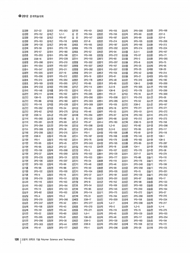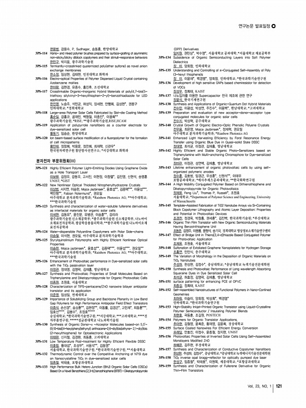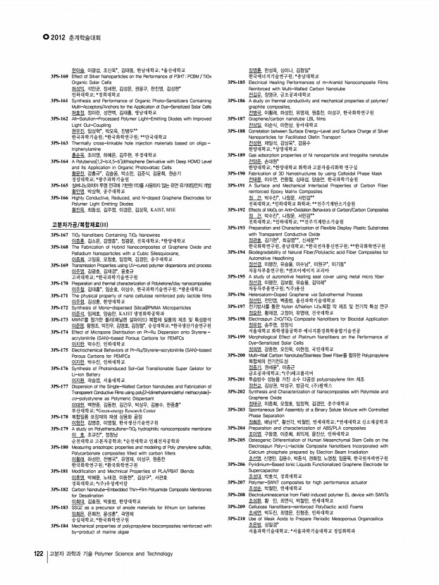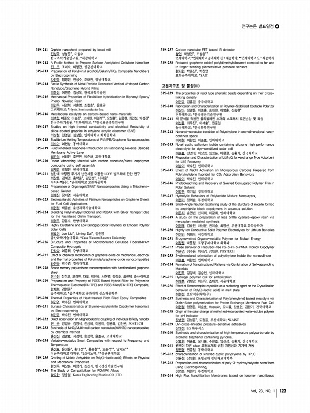 연구논문 발표일정 Vol. 23, NO. 1 123 3PS-211 Grphite nanosheet prepared by bead mill 진성국, 성봉준*, 이상수 한국과학기술연구원; *서강대학교 3PS-212 A Facile Method to Prepare Surface Acetylated Cellulose Nanofiber 진 초, 조미숙, 이영관, 성균관대학교 3PS-213 Preparation of Poly vinyl alcohol /Gelatin/TiO2 Composite Nanofibers by Electrospinning 차진욱, 임영민, 한성수, 오태환, 영남대학교 3PS-214 Facile Synthesis of Metal Particle Decorated Vertical N-doped Carbon Nanotube/Graphene Hybrid Films 최동성, 이원준, 김상욱, 한국과학기술원 3PS-215 Mechanical Properties of Flexibilizer hybridization in Biphenyl Epoxy/ Phenol Novolac Resin 최민우, 서경혁, 서흔영, 조철호*, 윤호규 고려대학교; *Hynix Semiconductor Inc. 3PS-216 Metallocene catalysts on carbon-based nano-materials 최백합, 이준오, 이승준*, 고재현, 이경석**, 오정훈*, 김용현, 최인성, 박성진* 한국과학기술원; ...