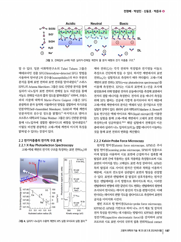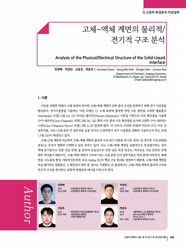 고분자 특성분석 지상강좌 고분자 과학과 기술 제 35 권 3 호 2024년 6월 185 고체-액체 계면의 물리적/ 전기적 구조 분석 Analysis of the Physical/Electrical Structure of the Solid-Liquid Interface 전현배ㆍ박성민ㆍ신동호ㆍ박준우 | Hyunbae CheonㆍSeong Min ParkㆍDongho ShinㆍJunwoo Park Department of Chemistry, Sogang University, 35 Baekbeom-ro, Mapo-gu, Seoul 04107, Korea Emailparkjw@sogang.ac.kr 1. 서론 이온을 포함한 액체가 고체 표면과 만나면 고체-액체 계면의 전하 중성 조건을 만족하기 위해 전기 이중층을 형성한다. 전기이중층을 기술하는 이론 모델은 i 고체 표면에 흡착한 단일 이온 층만을 고려한 헬름홀츠 Helmholtz 모델 그림 1a , ii 푸아송-볼츠만 PoissonBoltzmann 이론을 기반으로 이온 확산층을 기술한 구이-채프먼 Gouy-Chapman 모델 그림 1b , iii 흡착 이온 층과 이온 확산층을 동시에 고려한 구이-채프먼...