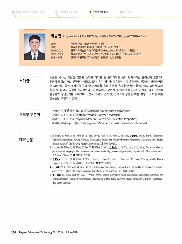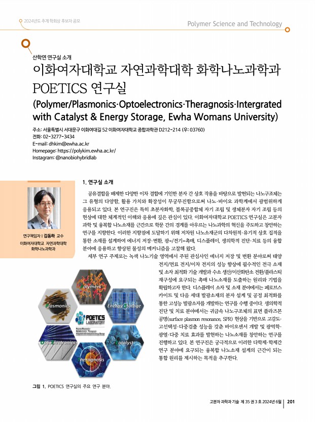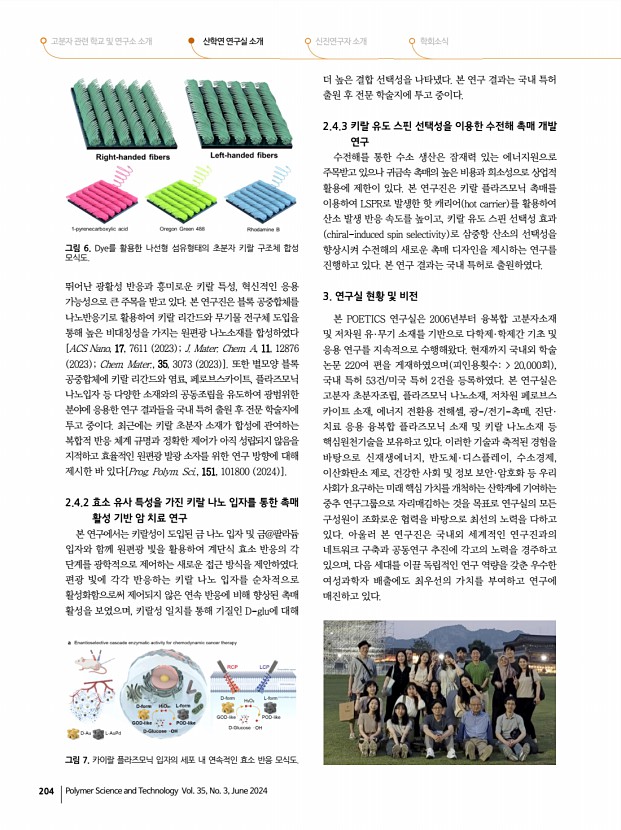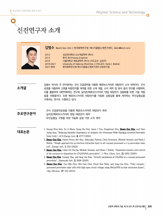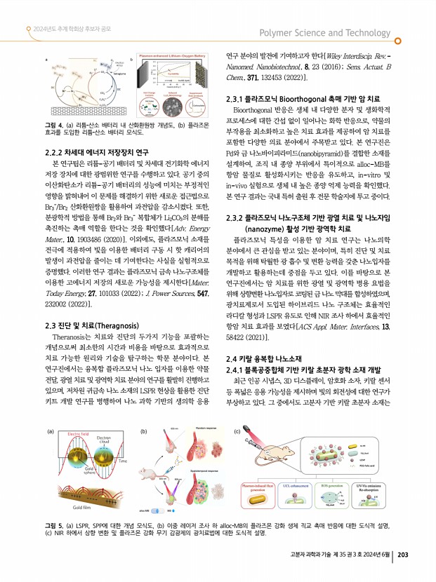 2024년도 추계 학회상 후보자 공모 고분자 과학과 기술 제 35 권 3 호 2024년 6월 203 2.2.2 차세대 에너지 저장장치 연구 본 연구팀은 리튬-공기 배터리 및 차세대 전기화학 에너지 저장 장치에 대한 광범위한 연구를 수행하고 있다. 공기 중의 이산화탄소가 리튬-공기 배터리의 성능에 미치는 부정적인 영향을 밝혀내어 이 문제를 해결하기 위한 새로운 접근법으로 Br3-/Br2 산화환원쌍을 활용하여 과전압을 감소시켰다. 또한, 분광학적 방법을 통해 Br2와 Br3- 복합체가 Li2CO3의 분해를 촉진하는 촉매 역할을 한다는 것을 확인했다[Adv. Energy Mater., 10, 1903486 2020 ]. 이외에도, 플라즈모닉 소재를 전극에 적용하여 빛을 이용한 배터리 구동 시 핫 캐리어의 발생이 과전압을 줄이는 데 기여한다는 사실을 실험적으로 증명했다. 이러한 연구 결과는 플라즈모닉 금속 나노구...