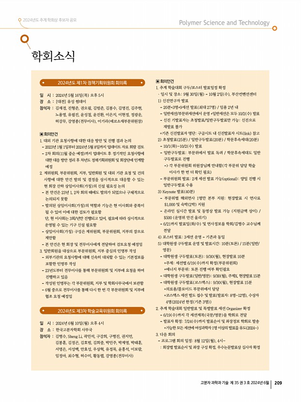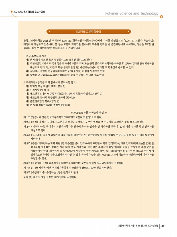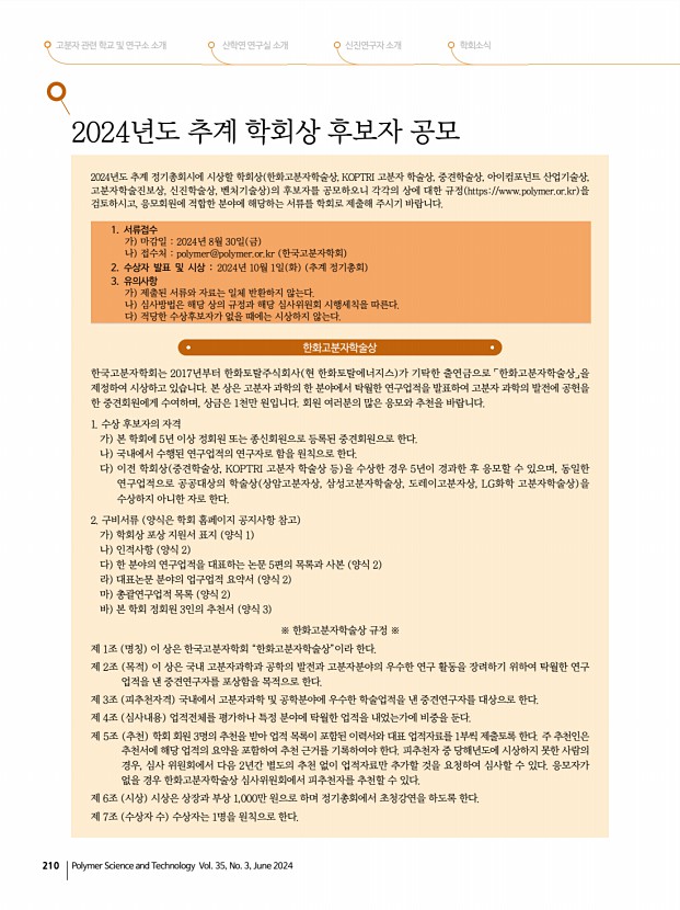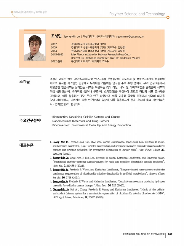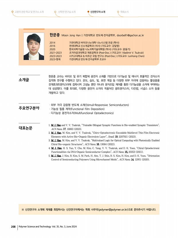 고분자 관련 학교 및 연구소 소개 산학연 연구실 소개 신진연구자 소개 학회소식 208 Polymer Science and Technology Vol. 35, No. 3, June 2024 한문종 Moon Jong Han | 가천대학교 반도체·전자공학부, doorbell1@gachon.ac.kr 2014 가천대학교 바이오나노대학 나노시스템 전공 학사 2016 연세대학교 신소재공학과 석사 지도교수강달영 2020 한국과학기술원 나노과학기술대학원 박사 지도교수윤동기 2021-2023 조지아공과대학교 재료공학과 Post-Doc. 지도교수Vladimir V. Tsukruk 2023-2023 시카고대학교 & 아르곤 국립 연구소 Post-Doc. 지도교수Junhong Chen 2023-현재 가천대학교 반도체·전자공학부 조교수 한문종 교수는 바이오 및 유기 복합체 광전자 소재를 기반으로 다기능성 및 에너지 효율적인 전자소자 집적화 연구를 수행하고 있다. 온도, 습도, 빛, 표면 계질 등 다양한 외부 자극에 감응하는 활...