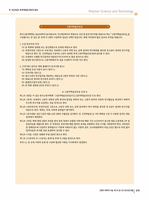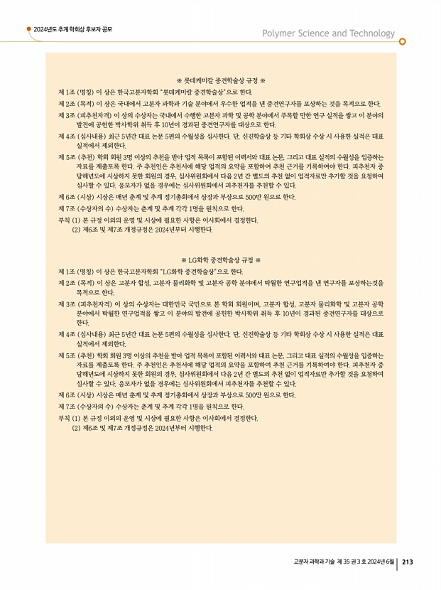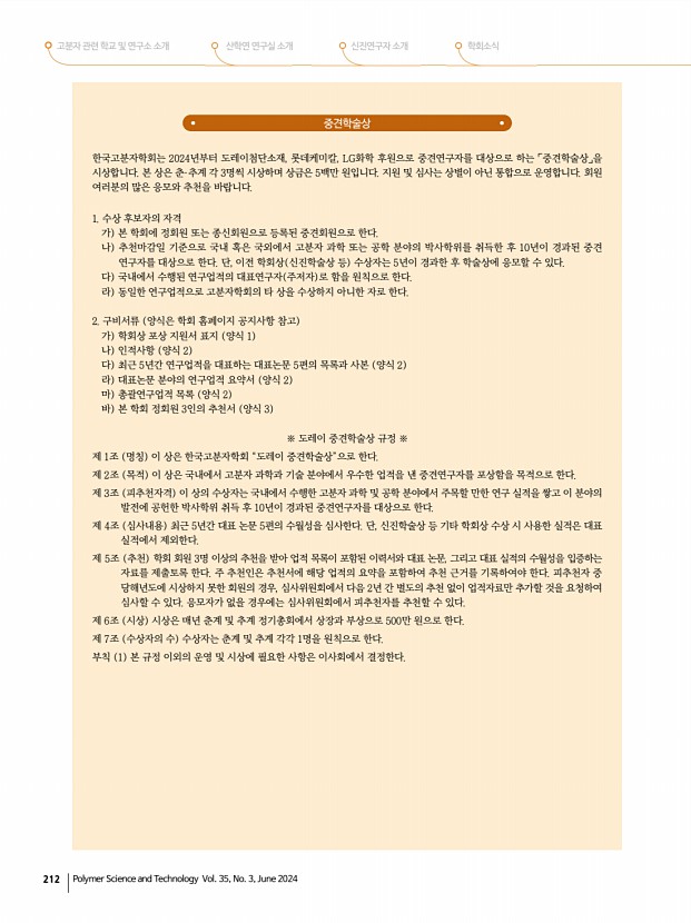 고분자 관련 학교 및 연구소 소개 산학연 연구실 소개 신진연구자 소개 학회소식 214 Polymer Science and Technology Vol. 35, No. 3, June 2024 아이컴포넌트 산업기술상 한국고분자학회는 2021년 추계부터 아이컴포넌트에서 기탁한 출연금으로 「아이컴포넌트 산업기술상」을 제정하여 시상하고 있습니다. 본 상은 고분자 과학기술 분야에서 우수한 기술을 개발한 산업계 회원에게 수여하며, 상금은 5백만 원입니다. 회원 여러분의 많은 응모와 추천을 기다립니다. 1. 수상 후보자의 자격 가 본 학회에 정회원 혹은 종신회원으로 등록된 회원으로 한다. 나 추천마감일 기준으로 국내에서 최근 우수한 기술을 개발한 중견 및 중소기업 소속을 대상으로 한다. 다 국내에서 수행된 연구업적을 원칙으로 한다. 라 동일한 연구업적으로 고분자학회의 타 상을 수상하지 아니한 ...