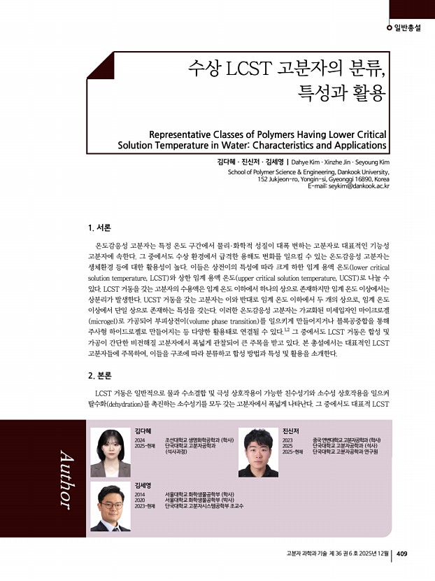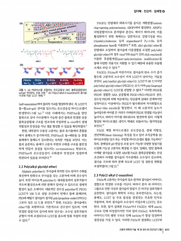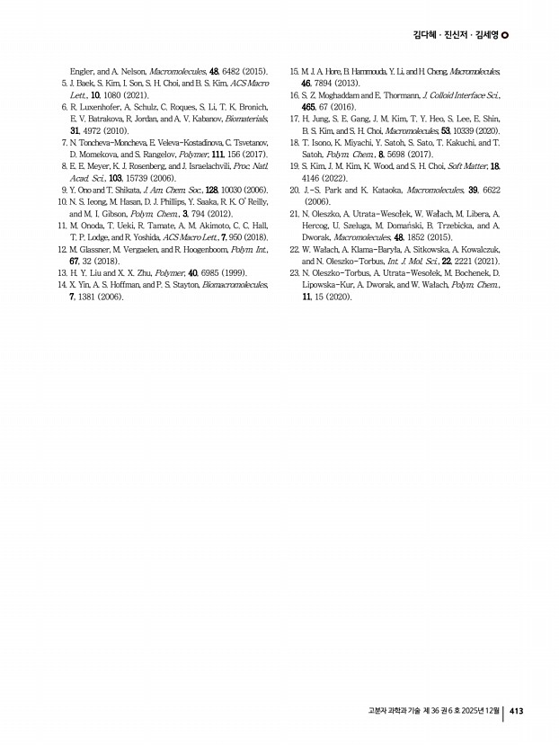 김다혜ㆍ진신저ㆍ김세영 고분자 과학과 기술 제 36 권 6 호 2025년 12월 413 Engler, and A. Nelson, Macromolecules, 48, 6482 2015 5. J. Baek, S. Kim, I. Son, S. H. Choi, and B. S. Kim, ACS Macro Lett., 10, 1080 2021 6. R. Luxenhofer, A. Schulz, C. Roques, S. Li, T. K. Bronich, E. V. Batrakova, R. Jordan, and A. V. Kabanov, Biomaterials, 31, 4972 2010 7. N. Toncheva-Moncheva, E. Veleva-Kostadinova, C. Tsvetanov, D. Momekova, and S. Rangelov, Polymer, 111, 156 2017 8. E. E. Meyer, K. J. Rosenberg, and J. Israelachvili, Proc. Natl. Acad. Sci., 103, 15739 2006 9. Y. Ono and T. Shikata, J. Am. Chem. Soc., 128, 10030 2006 10. N. S. Ieong, M. Hasan, D. J. Phillips, Y. Saaka, R. K. O’Reilly, and M. I. Gibson, Polym. Chem., 3, 794 2012 11. M. Onoda, T. Ueki, R. Tamate, A. M. Akimoto, C. C. Hall, T. P. Lodge, and R. Yoshida, ACS Macro Lett., 7, 950 2018 12. M. Glassner, M. Vergaelen, and R. Hoogenboom, Polym. Int., 67, 32 2018 13. H. Y. Liu and X. X. Zhu, Polymer, 40, 6985 1...