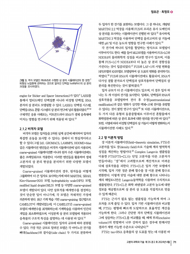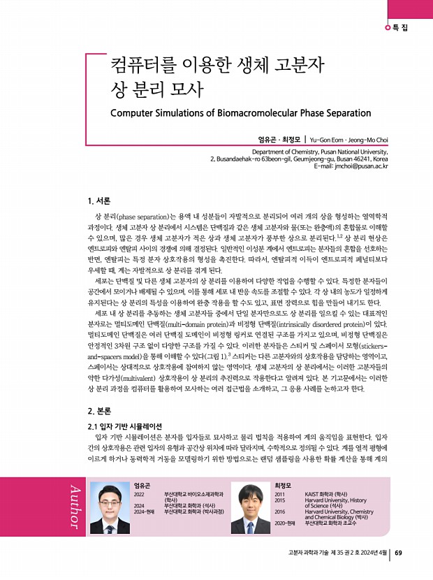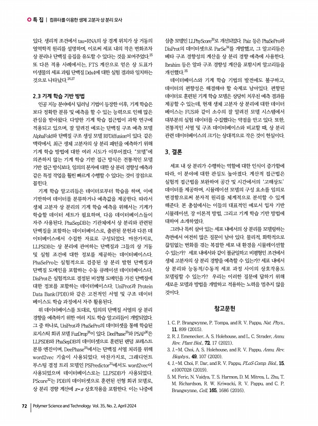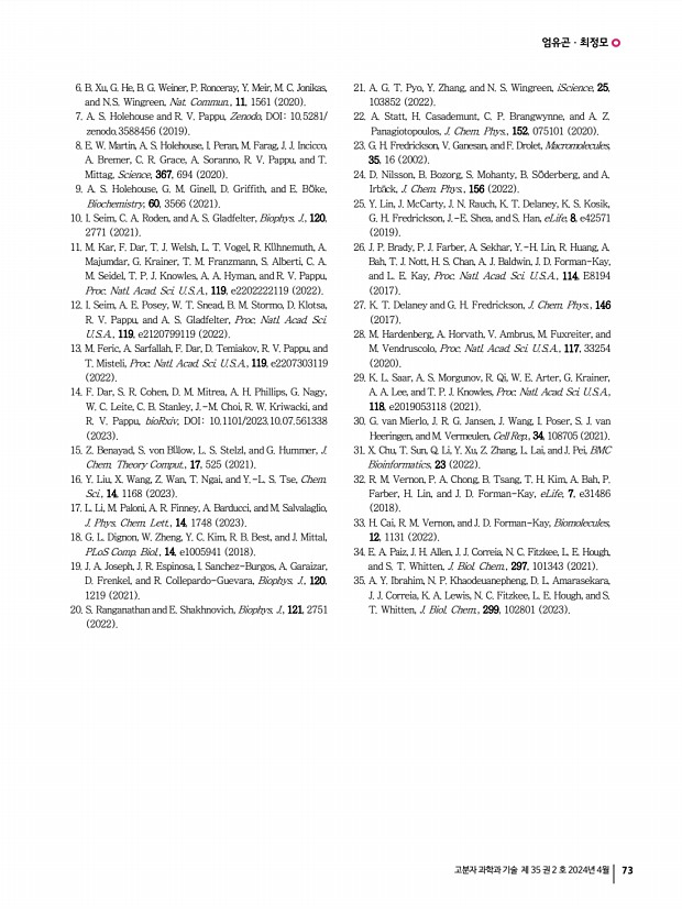 엄유곤ㆍ최정모 고분자 과학과 기술 제 35 권 2 호 2024년 4월 73 6. B. Xu, G. He, B. G. Weiner, P. Ronceray, Y. Meir, M. C. Jonikas, and N.S. Wingreen, Nat. Commun., 11, 1561 2020 7. A. S. Holehouse and R. V. Pappu, Zenodo, DOI10.5281/ zenodo.3588456 2019 8. E. W. Martin, A. S. Holehouse, I. Peran, M. Farag, J. J. Incicco, A. Bremer, C. R. Grace, A. Soranno, R. V. Pappu, and T. Mittag, Science, 367, 694 2020 9. A. S. Holehouse, G. M. Ginell, D. Griffith, and E. B ke, Biochemistry, 60, 3566 2021 10. I. Seim, C. A. Roden, and A. S. Gladfelter, Biophys. J., 120, 2771 2021 11. M. Kar, F. Dar, T. J. Welsh, L. T. Vogel, R. K hnemuth, A. Majumdar, G. Krainer, T. M. Franzmann, S. Alberti, C. A. M. Seidel, T. P. J. Knowles, A. A. Hyman, and R. V. Pappu, Proc. Natl. Acad. Sci. U.S.A., 119, e2202222119 2022 12. I. Seim, A. E. Posey, W. T. Snead, B. M. Stormo, D. Klotsa, R. V. Pappu, and A. S. Gladfelter, Proc. Natl. Acad. Sci. U.S.A., 119, e2120799119 2022 13. M. Feric, A. Sarfal...