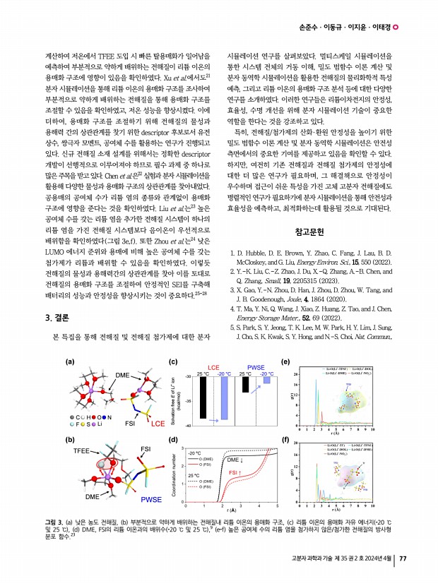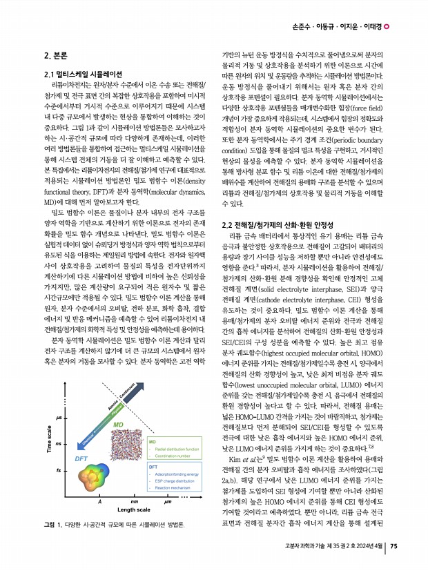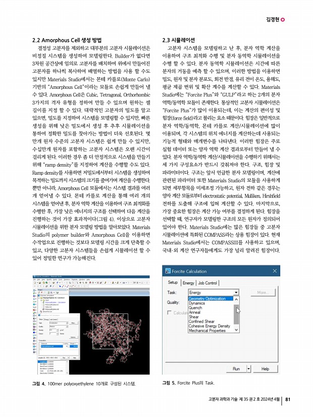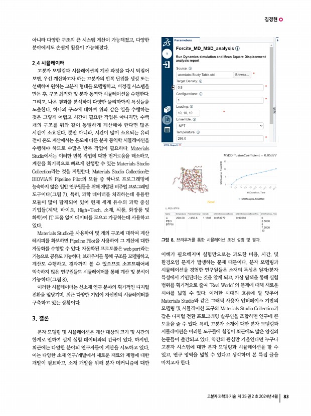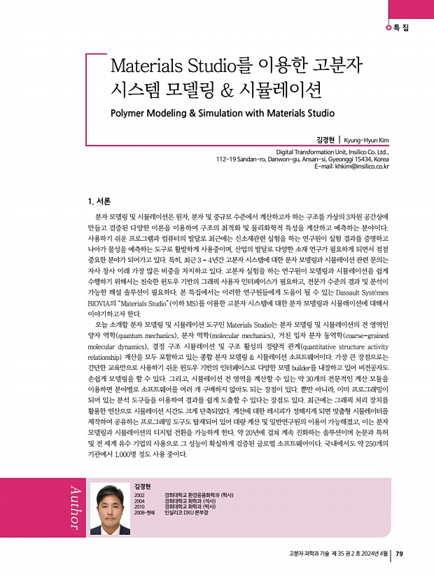 김경현 고분자 과학과 기술 제 35 권 2 호 2024년 4월 83 아니라 다양한 구조의 큰 시스템 계산이 가능해졌고, 다양한 분야에서도 손쉽게 활용이 가능해졌다. 2.4 시뮬레이터 고분자 모델링과 시뮬레이션의 계산 과정을 다시 되짚어 보면, 우선 계산하고자 하는 고분자의 반복 단위를 생성 또는 선택하여 원하는 고분자 형태를 모델링하고, 비정질 시스템을 만든 후, 구조 최적화 및 분자 동역학 시뮬레이션을 수행한다. 그리고, 나온 결과를 분석하여 다양한 물리화학적 특성들을 도출한다. 하나의 구조에 대하여 위와 같은 일을 수행하는 것은 그렇게 어렵고 시간이 필요한 작업은 아니지만, 수백 개의 구조를 위와 같이 동일하게 계산해야 한다면 많은 시간이 소요된다. 뿐만 아니라, 시간이 많이 소요되는 유리 전이 온도 계산에서는 온도에 따른 분자 동역학...