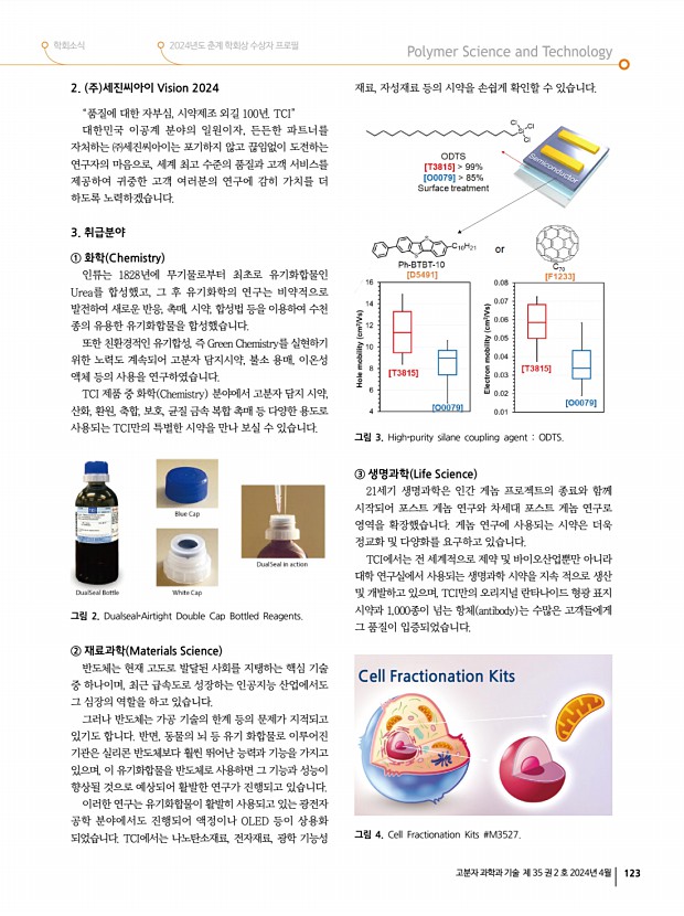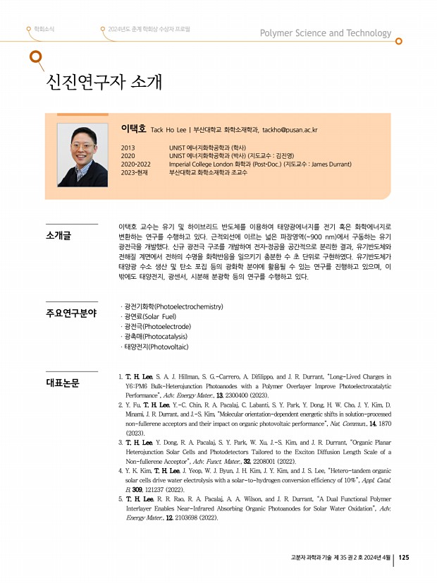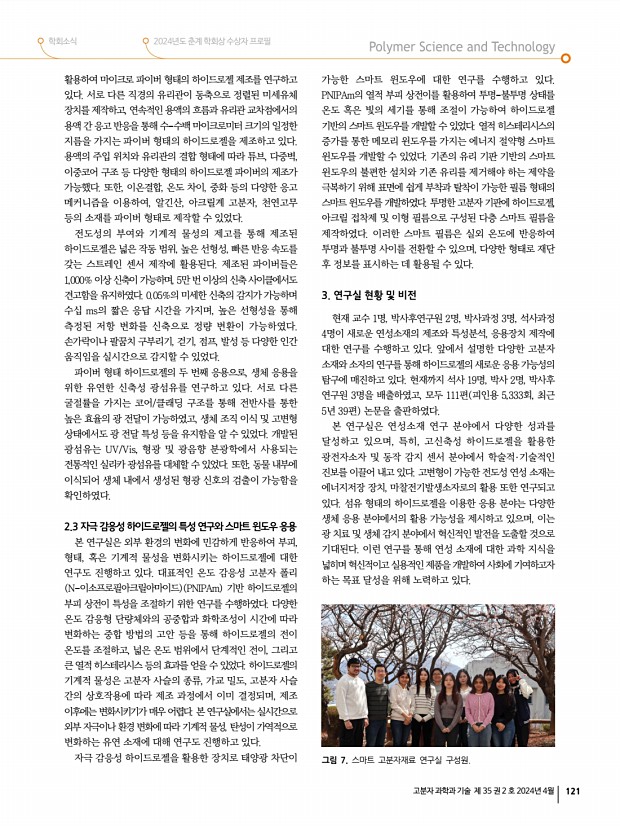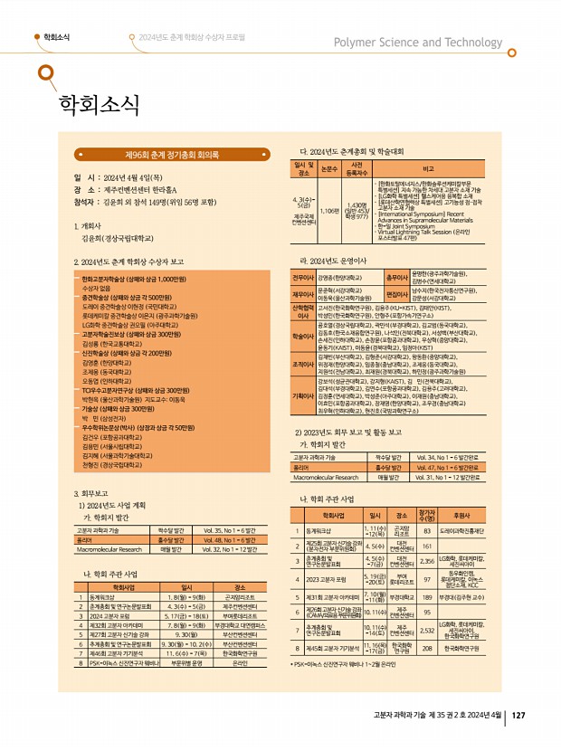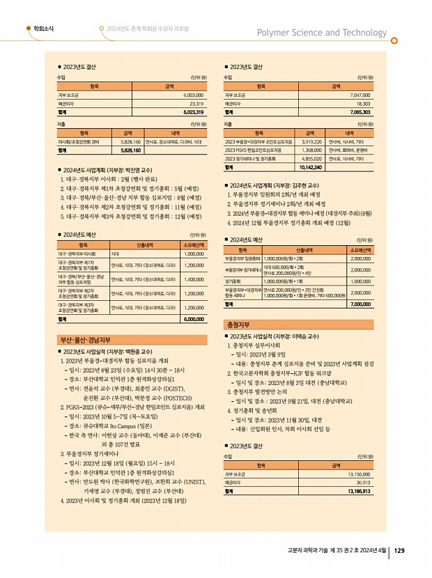 학회소식 2024년도 춘계 학회상 수상자 프로필 고분자 과학과 기술 제 35 권 2 호 2024년 4월 129 2023년도 결산 수입 단위원 항목 금액 지부 보조금 6,003,000 예금이자 23,319 합계 6,023,319 지출 단위원 항목 금액 내역 이사회/초청강연회 경비 5,828,160 연사료, 장소대여료, 다과비, 식대 합계 5,828,160 2024년도 사업계획 지부장박진영 교수 1. 대구·경북지부 이사회 2월 행사 완료 2. 대구·경북지부 제1차 초청강연회 및 정기총회 5월 예정 3. 대구·경북/부산·울산·경남 지부 합동 심포지엄 8월 예정 4. 대구·경북지부 제2차 초청강연회 및 정기총회 11월 예정 5. 대구·경북지부 제3차 초청강연회 및 정기총회 12월 예정 2024년도 예산 단위원 항목 산출내역 소요예산액 대구·경북지부 이사회 식대 1,000,000 대구·경북지부 제1차 초청강연회 및 정기총회 연사료, 식대, 기타 장...