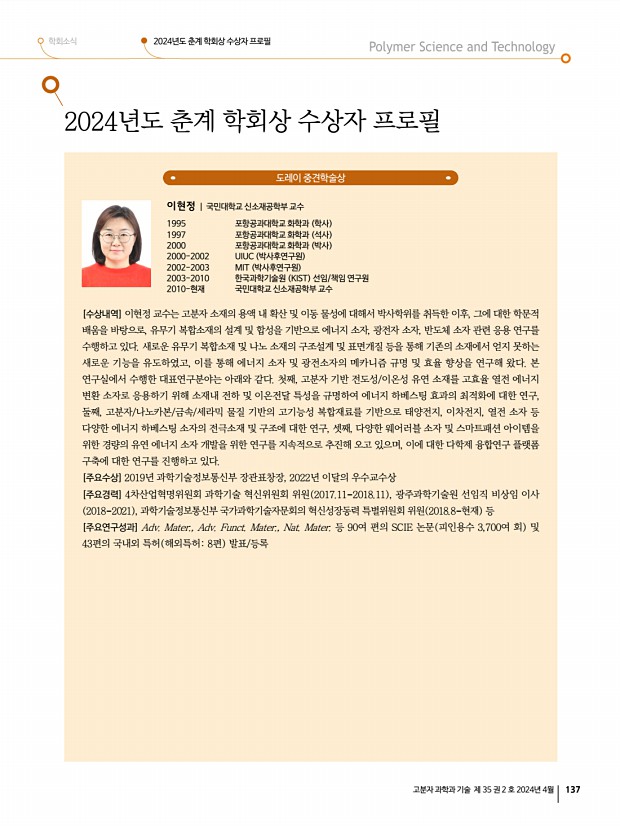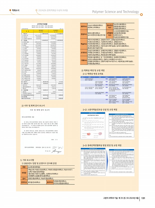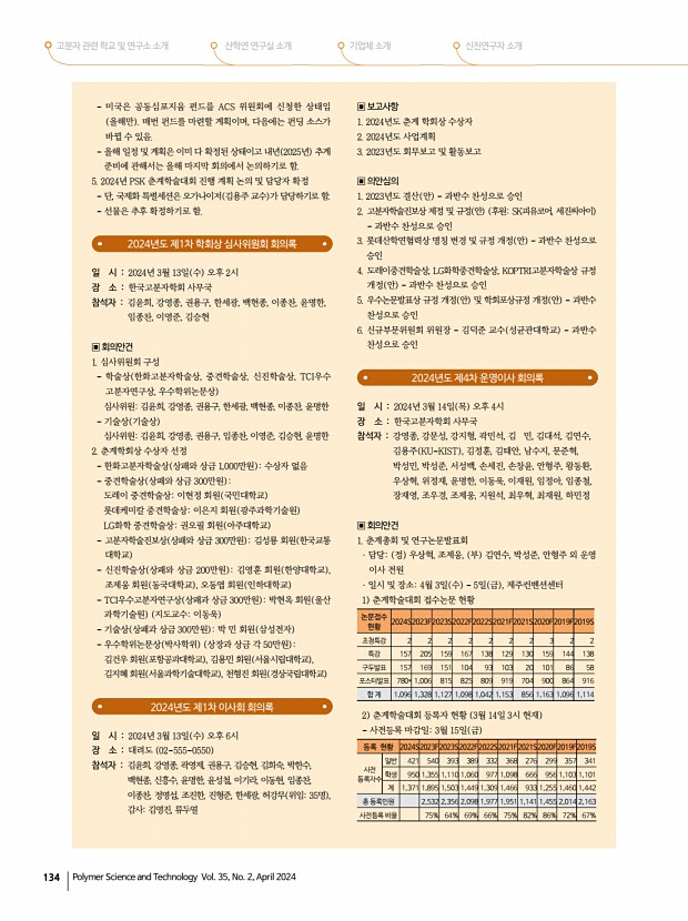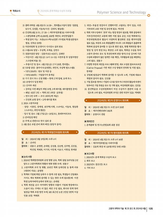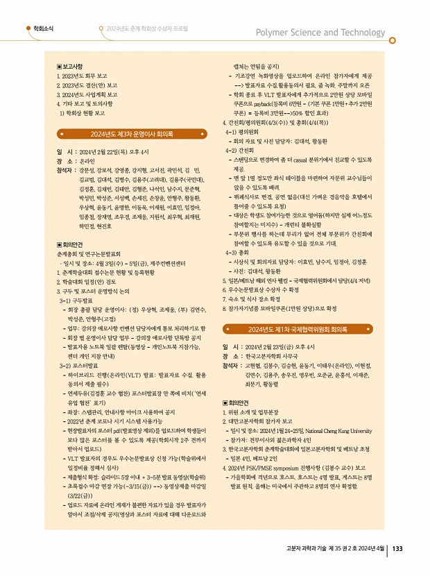 학회소식 2024년도 춘계 학회상 수상자 프로필 고분자 과학과 기술 제 35 권 2 호 2024년 4월 133 ▣ 보고사항 1. 2023년도 회무 보고 2. 2023년도 결산 안 보고 3. 2024년도 사업계획 보고 4. 기타 보고 및 토의사항 1 학회상 현황 보고 2024년도 제3차 운영이사 회의록 일 시 2024년 2월 22일 목 오후 4시 장 소 온라인 참석자 강문성, 강보석, 강영종, 강지형, 고서진, 곽민석, 김 민, 김교범, 김대석, 김병수, 김용주 고려대 , 김용주 국민대 , 김정훈, 김채빈, 김태안, 김형준, 나석인, 남수지, 문준혁, 박성민, 박성준, 서성백, 손세진, 손창윤, 안형주, 왕동환, 우상혁, 윤동기, 윤명한, 이동욱, 이재원, 이효민, 임정아, 임종철, 장재영, 조우경, 조제웅, 지원석, 최우혁, 최재원, 하민정, 현진호 ▣ 회의안건 춘계총회 및 연구논문발표회 · 일시 및 장소4월 3일 수 5일 금 , 제주컨벤...