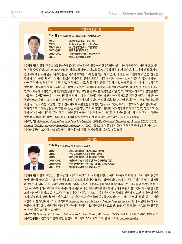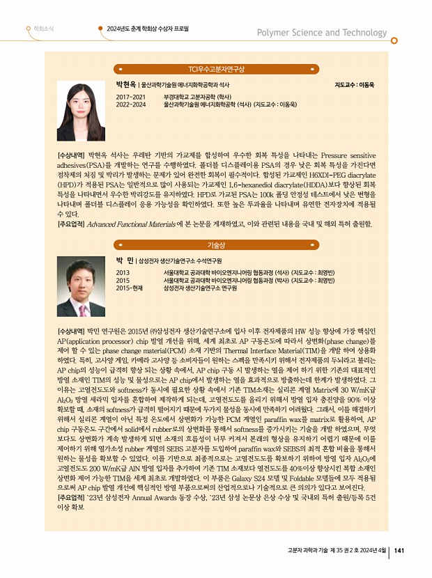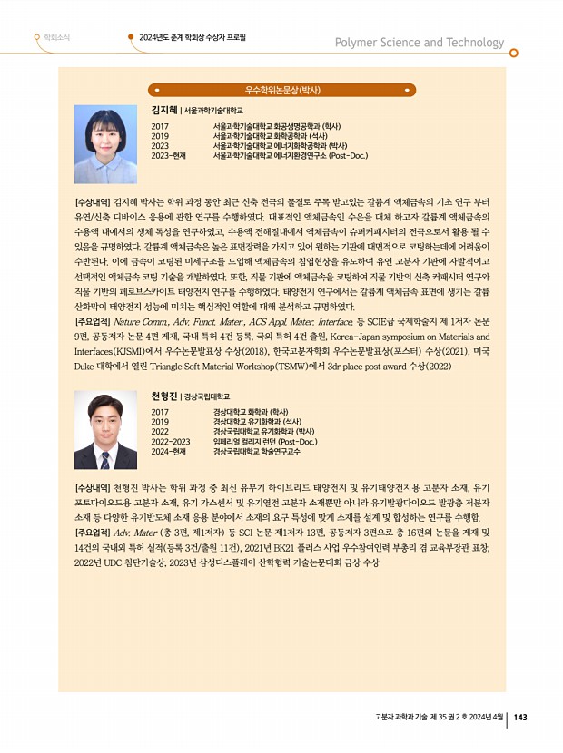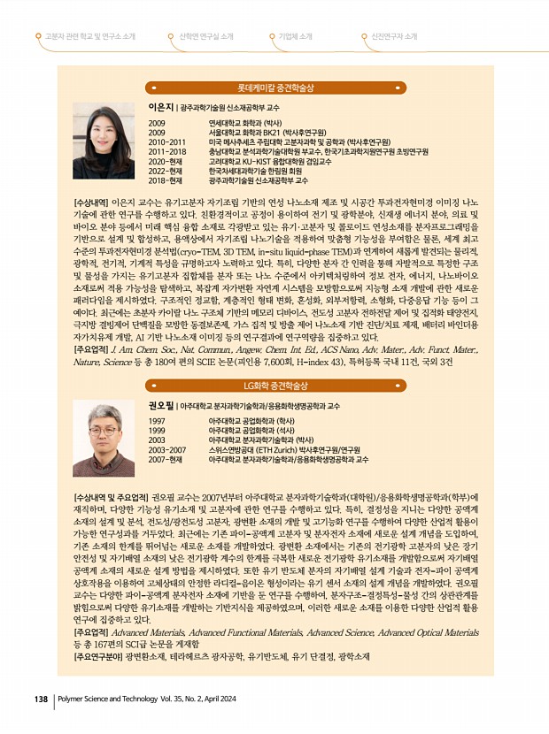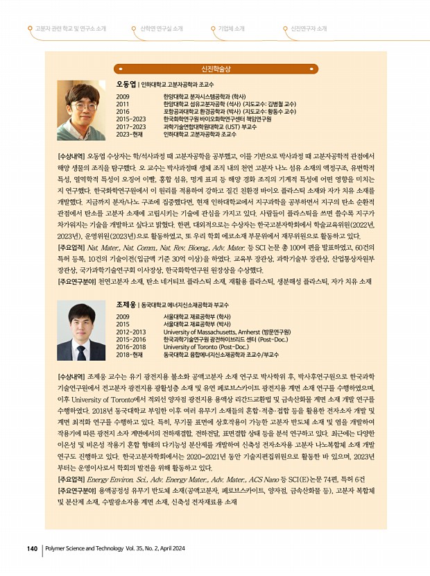 ... 산학연 연구실 소개 기업체 소개 신진연구자 소개 140 Polymer Science and Technology Vol. 35, No. 2, April 2024 신진학술상 오동엽|인하대학교 고분자공학과 조교수 2009 한양대학교 분자시스템공학과 학사 2011 한양대학교 섬유고분자공학 석사 지도교수김병철 교수 2016 포항공과대학교 환경공학과 박사 지도교수황동수 교수 2015-2023 한국화학연구원 바이오화학연구센터 책임연구원 2017-2023 과학기술연합대학원대학교 UST 부교수 2023-현재 인하대학교 고분자공학과 조교수 [수상내역] 오동엽 수상자는 학/석사과정 때 고분자공학을 공부했고, 이를 기반으로 박사과정 때 고분자공학적 관점에서 해양 생물의 조직을 탐구했다. 오 교수는 박사과정때 생체 조직 내의 천연 고분자 나노 섬유 소재의 액정구조, 유변학적 특성, 열역학적 특성이 오징어 이빨, 홍합 섬유, 멍게 ...