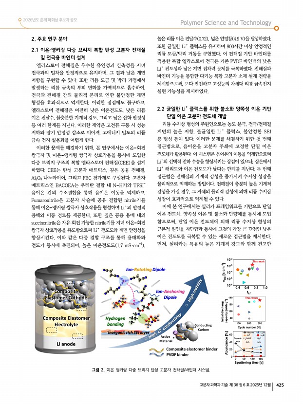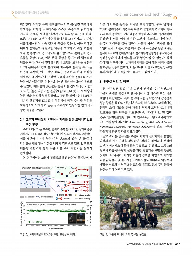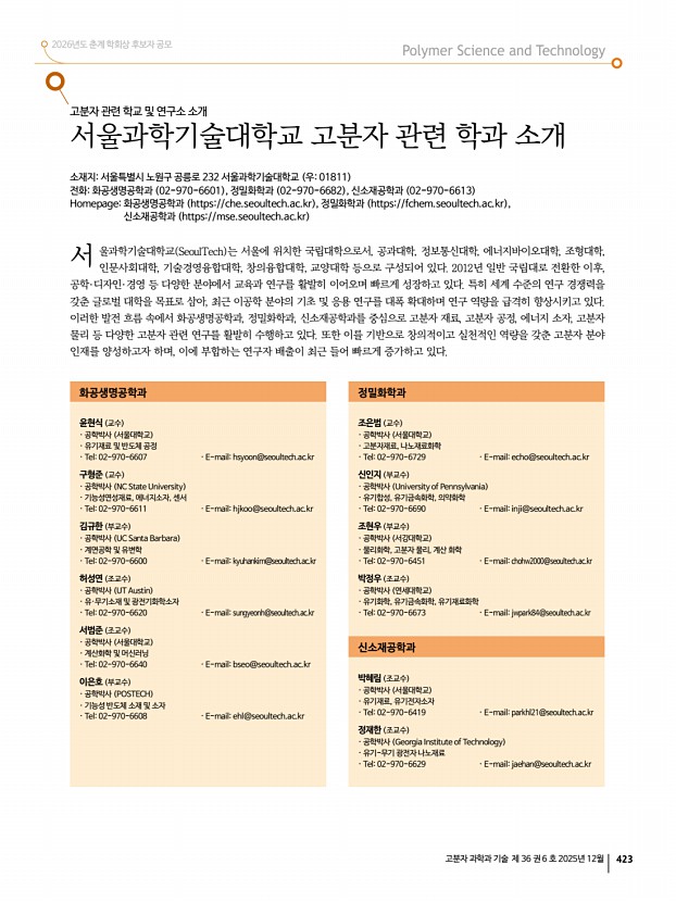 2026년도 춘계 학회상 후보자 공모 고분자 과학과 기술 제 36 권 6 호 2025년 12월 423 고분자 관련 학교 및 연구소 소개 서울과학기술대학교 고분자 관련 학과 소개 소재지서울특별시 노원구 공릉로 232 서울과학기술대학교 우01811 전화화공생명공학과 02-970-6601 , 정밀화학과 02-970-6682 , 신소재공학과 02-970-6613 Homepage화공생명공학과 https//che.seoultech.ac.kr , 정밀화학과 https//fchem.seoultech.ac.kr , 신소재공학과 https//mse.seoultech.ac.kr 울과학기술대학교 SeoulTech 는 서울에 위치한 국립대학으로서, 공과대학, 정보통신대학, 에너지바이오대학, 조형대학, 인문사회대학, 기술경영융합대학, 창의융합대학, 교양대학 등으로 구성되어 있다. 2012년 일반 국립대로 전환한 이후, 공학·디자인·경영 등 다양한 분야에서 교육과 연구를 활발히 이어오며 빠르게 성장하고 있다. 특히 ...