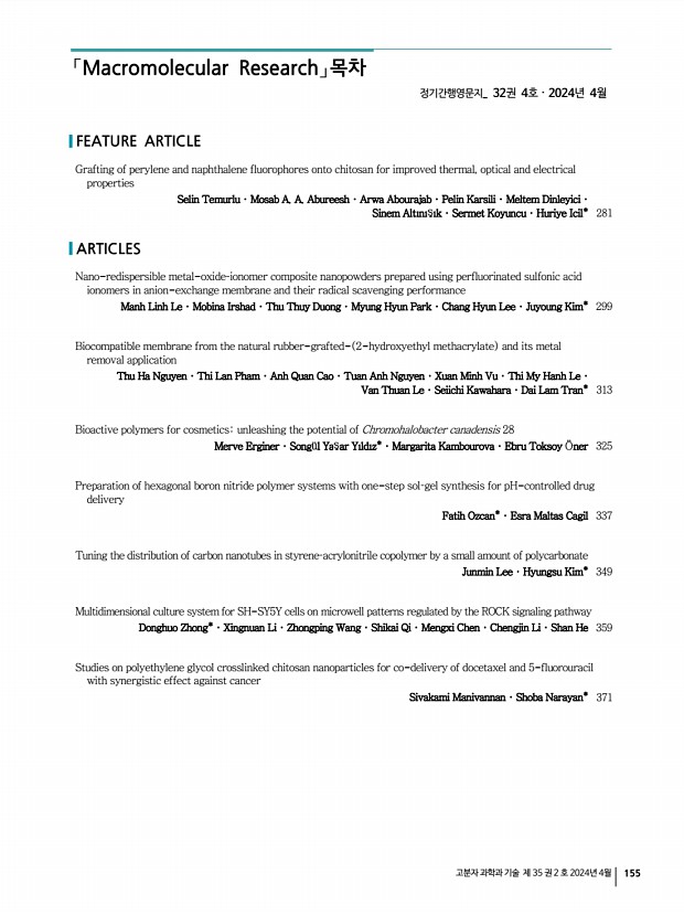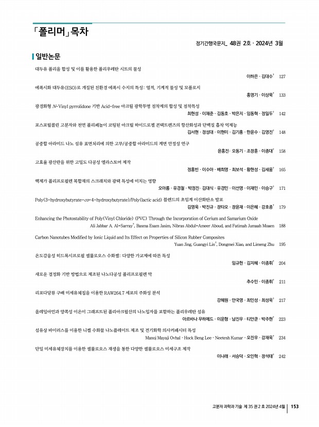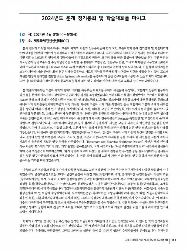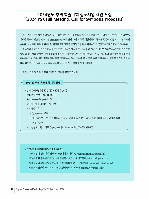 156 Polymer Science and Technology Vol. 35, No. 2, April 2024 우리 한국고분자학회는 그동안 회원들의 적극적인 참여와 협조에 힘입어 해를 더할수록 발전하고 있습니다. 그 동안 본회가 꾸준히 추진해 온 회원 상호간의 친목유대와 과학기술의 학술발전을 위해 보다 내실있는 학회가 되도록 노력하겠습니다. 1. 2024년도 회비납부 및 논문지 구독안내 정 회 비 50,000원 학생회비 학부생, 석·박사과정 30,000원 단체회비 150,000원 종신회비 500,000원 구 독 료_ 정 회 원 40,000원 :폴리머 6회/년 , Macromolecular Research 12회/년 배포 _ 학생회원 10,000원 :폴리머 6회/년 , Macromolecular Research 12회/년 배포 2. 입회안내 본회 입회를 희망하시는 분은 한국고분자학회 홈페이지 www.polymer.or.kr 를 방문하셔서 온라인 등록 안내에 따라 가입신청을 하시고, 회비를 납부해 주십시오. 또한 회원 여러...