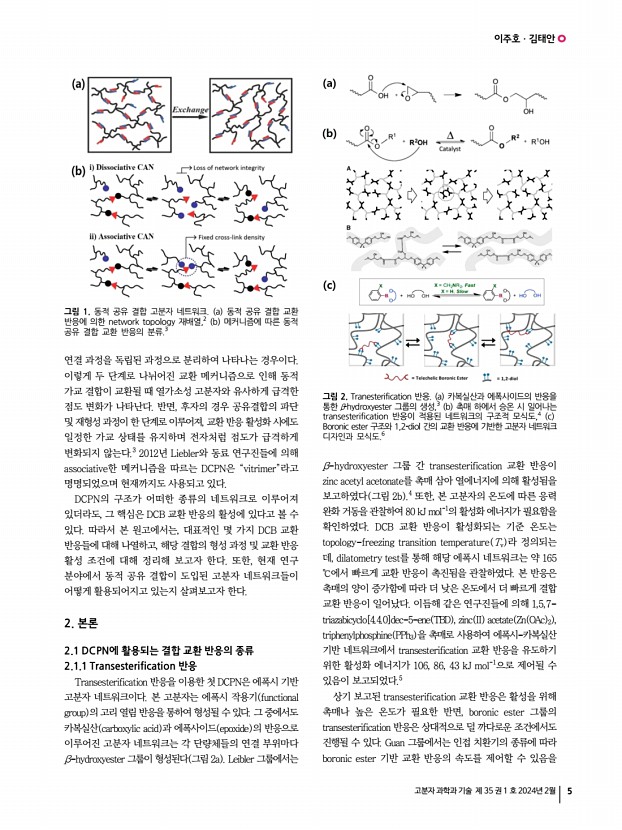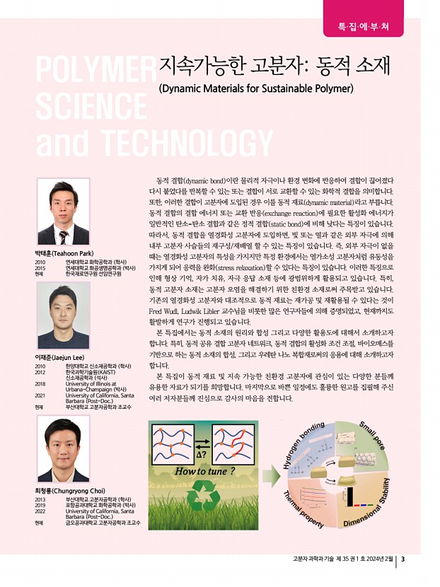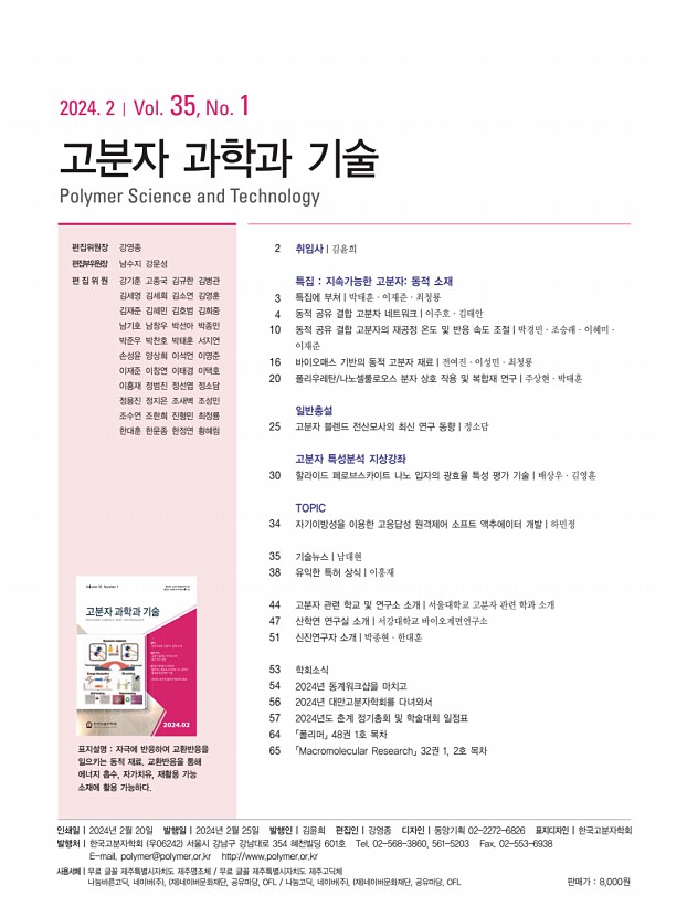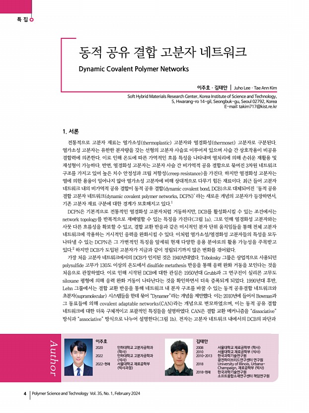...olymer Networks 이주호ㆍ김태안 | Juho LeeㆍTae Ann Kim Soft Hybrid Materials Research Center, Korea Institute of Science and Technology, 5, Hwarang-ro 14-gil, Seongbuk-gu, Seoul 02792, Korea E-mailtakim717@kist.re.kr 이주호 2020 인하대학교 고분자공학과 학사 2022 인하대학교 고분자공학과 석사 2022-현재 서울대학교 재료공학부 박사과정 김태안 2008 서울대학교 재료공학부 학사 2010 서울대학교 재료공학부 석사 2010-2013 한국과학기술연구원 광전하이브리드연구센터 연구원 2018 University of Illinois, UrbanaChampaign, 재료공학부 박사 2018-현재 한국과학기술연구원 소프트융합소재연구센터책임연구원