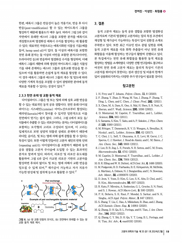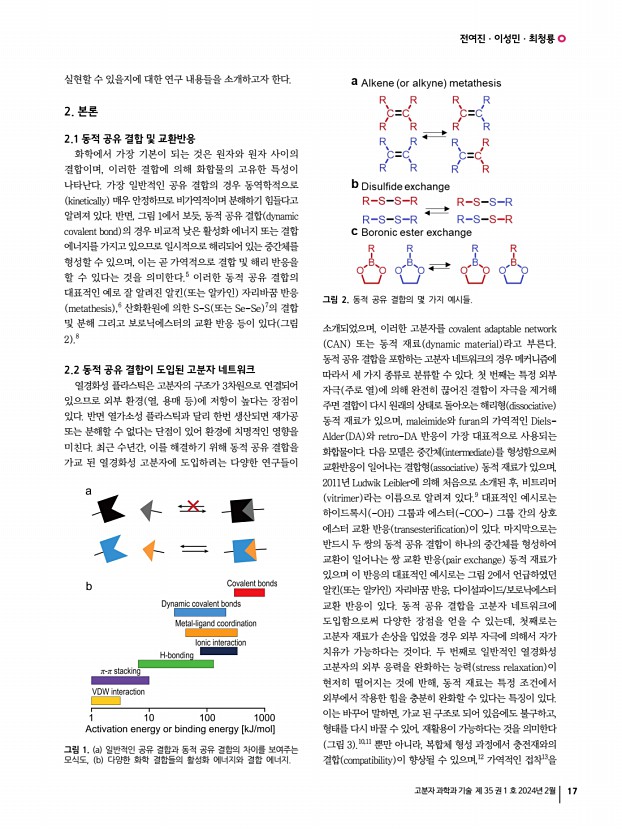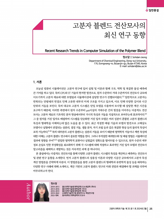 일반총설 고분자 과학과 기술 제 35 권 1 호 2024년 2월 25 고분자 블렌드 전산모사의 최신 연구 동향 Recent Research Trends in Computer Simulation of the Polymer Blend 정소담 | Sohdam Jeong Department of Chemical Engineering, Dong-eui University, 176, Eomgwang-ro, Busanjin-gu, Busan 47340, Korea E-mailsohdam@deu.ac.kr 1. 서론 오늘날 컴퓨터 시뮬레이션은 고분자 연구에 있어 실험 및 이론과 함께 구조, 역학 및 복잡한 물성 예측에 큰 기여를 하고 있다. 특히 CPU와 IT 기술의 현저한 발전으로, 원자 수준부터 거대 수준까지의 전산모사 규모에 이르기까지 고분자 재료에 대한 모델링과 시뮬레이션에 상당한 연구가 진행되어왔다.1,2 일반적으로 고분자는 반복되는 단량체의 연결로 인해 고유한 내부의 미세 구조를 가지고 있으며, 이로 인해 다양한 길이와 시간 단위의 거동을 보인다. 특히 대규모 고분자 시...