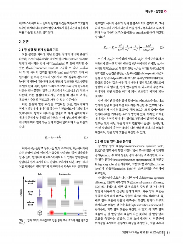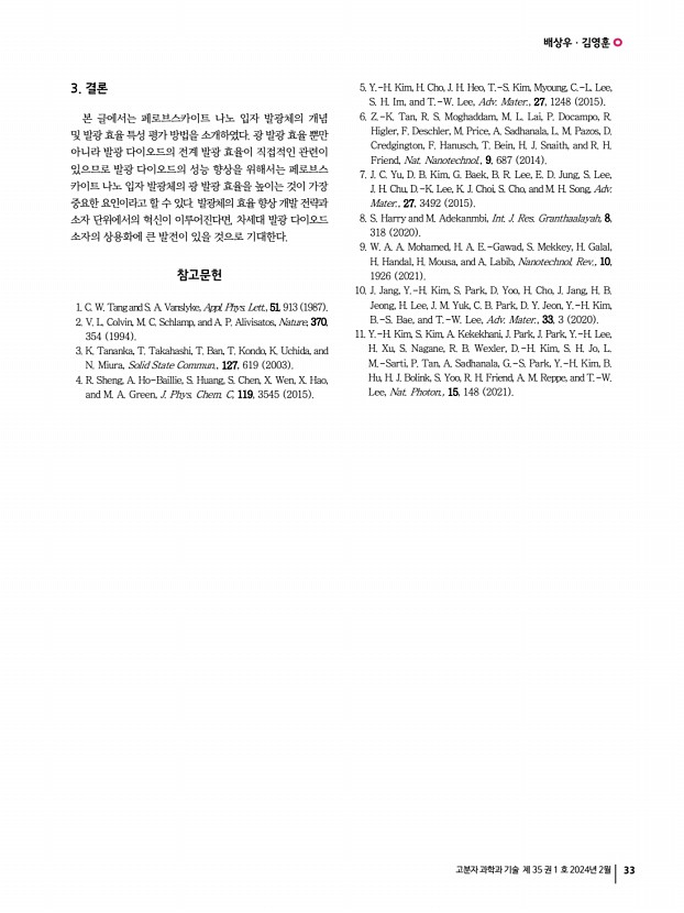 배상우ㆍ김영훈 고분자 과학과 기술 제 35 권 1 호 2024년 2월 33 3. 결론 본 글에서는 페로브스카이트 나노 입자 발광체의 개념 및 발광 효율 특성 평가 방법을 소개하였다. 광 발광 효율 뿐만 아니라 발광 다이오드의 전계 발광 효율이 직접적인 관련이 있으므로 발광 다이오드의 성능 향상을 위해서는 페로브스 카이트 나노 입자 발광체의 광 발광 효율을 높이는 것이 가장 중요한 요인이라고 할 수 있다. 발광체의 효율 향상 개발 전략과 소자 단위에서의 혁신이 이루어진다면, 차세대 발광 다이오드 소자의 상용화에 큰 발전이 있을 것으로 기대한다. 참고문헌 1. C. W. Tang and S. A. Vanslyke, Appl. Phys. Lett., 51, 913 1987 2. V. L. Colvin, M. C. Schlamp, and A. P. Alivisatos, Nature, 370, 354 1994 3. K. Tananka, T. Takahashi, T. Ban, T. Kondo, K. Uchida, and N. Miura, Solid State Commun., 127, 619 2003 4. R. Sheng...