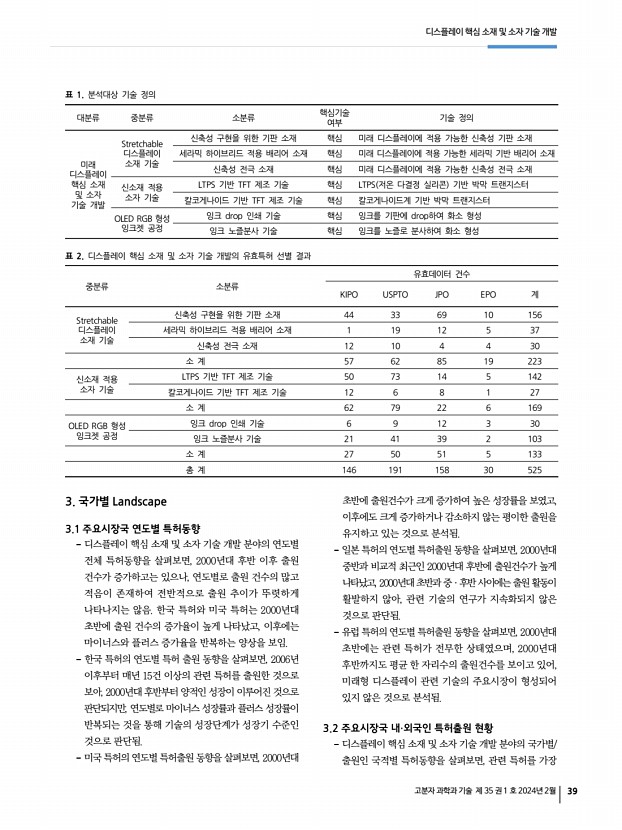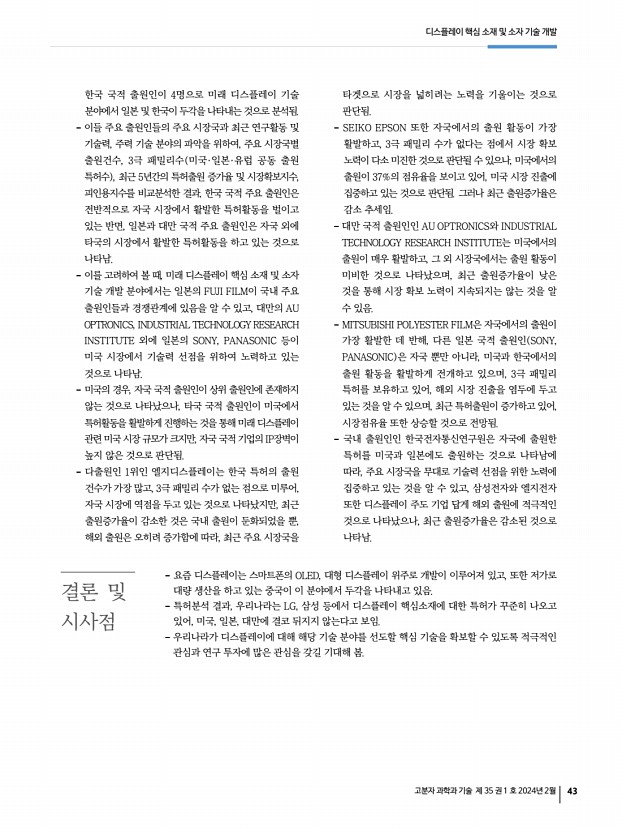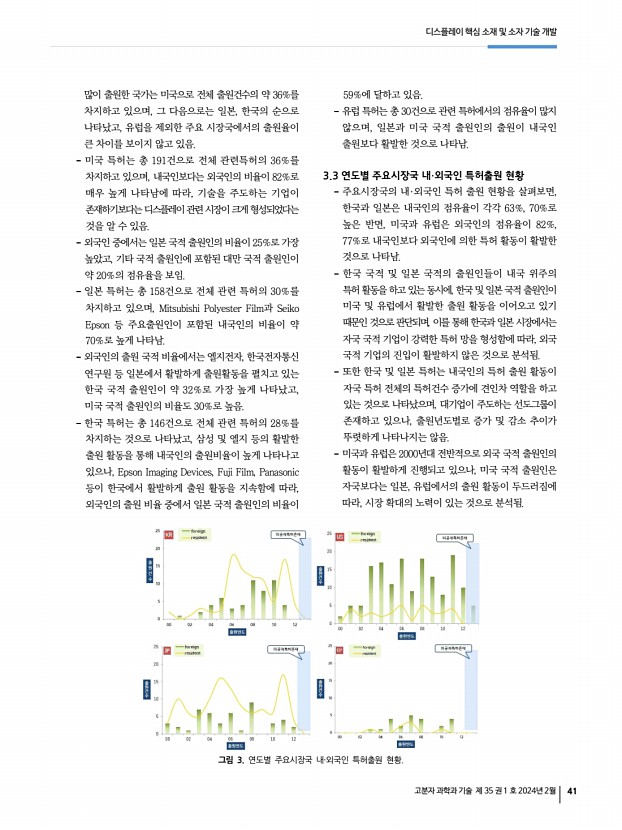 디스플레이 핵심 소재 및 소자 기술 개발 고분자 과학과 기술 제 35 권 1 호 2024년 2월 43 한국 국적 출원인이 4명으로 미래 디스플레이 기술 분야에서 일본 및 한국이 두각을 나타내는 것으로 분석됨. 이들 주요 출원인들의 주요 시장국과 최근 연구활동 및 기술력, 주력 기술 분야의 파악을 위하여, 주요 시장국별 출원건수, 3극 패밀리수 미국·일본·유럽 공동 출원 특허수 , 최근 5년간의 특허출원 증가율 및 시장확보지수, 피인용지수를 비교분석한 결과, 한국 국적 주요 출원인은 전반적으로 자국 시장에서 활발한 특허활동을 벌이고 있는 반면, 일본과 대만 국적 주요 출원인은 자국 외에 타국의 시장에서 활발한 특허활동을 하고 있는 것으로 나타남. 이를 고려하여 볼 때, 미래 디스플레이 핵심 소재 및 소자 기술 개발 분야에서는 일본의 FUJI FILM이 국내 ...