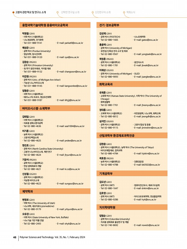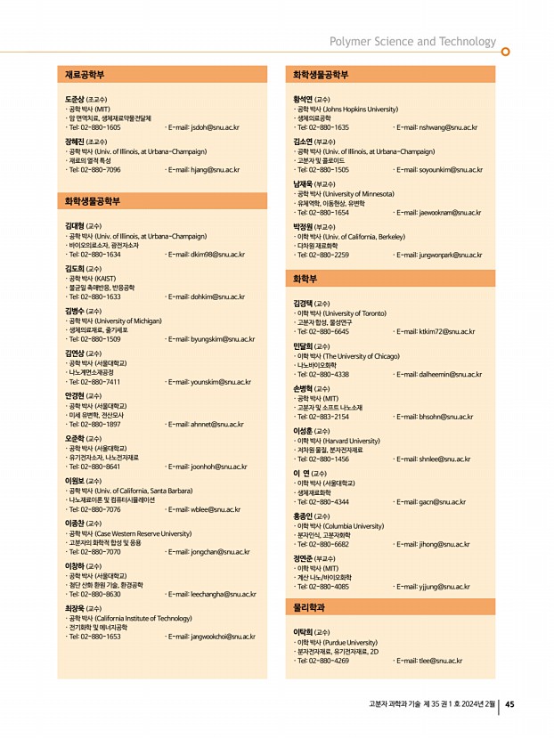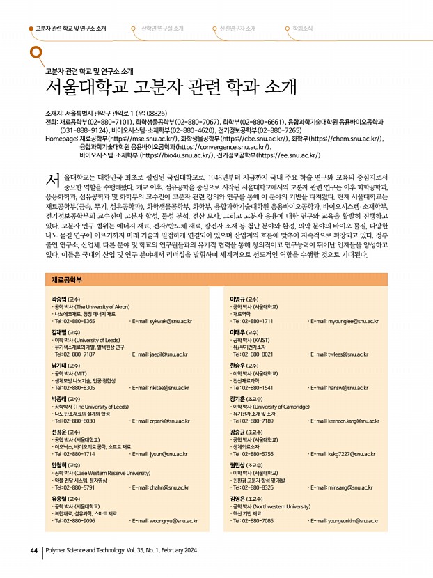 고분자 관련 학교 및 연구소 소개 산학연 연구실 소개 신진연구자 소개 학회소식 44 Polymer Science and Technology Vol. 35, No. 1, February 2024 고분자 관련 학교 및 연구소 소개 서울대학교 고분자 관련 학과 소개 소재지서울특별시 관악구 관악로 1 우08826 전화재료공학부 02-880-7101 , 화학생물공학부 02-880-7067 , 화학부 02-880-6661 , 융합과학기술대학원 응용바이오공학과 031-888-9124 , 바이오시스템·소재학부 02-880-4620 , 전기정보공학부 02-880-7265 Homepage재료공학부 https//mse.snu.ac.kr/ , 화학생물공학부 https//cbe.snu.ac.kr/ , 화학부 https//chem.snu.ac.kr/ , 융합과학기술대학원 응용바이오공학과 https//convergence.snu.ac.kr/ , 바이오시스템·소재학부 https//bio4u.snu.ac.kr/ , 전기정보공학부 https//ee.snu.ac.kr/ 울대학교는 대한민국 최초로 설립된 국립대학교로, 1946년부터 지금까지 국내 주요 학술 ...