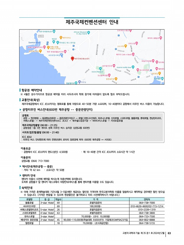 고분자 과학과 기술 제 35 권 1 호 2024년 2월 63 제주국제컨벤션센터 안내 항공권 예약안내 ※ 4월은 성수기이므로 항공권 예약을 미리 서두르시어 학회 참가에 어려움이 없도록 협조 부탁드립니다. 교통안내 육상 제주국제공항에서 ICC JEJU까지는 평화로를 통해 차량으로 4050분 가량 소요되며, 1640분마다 공항에서 리무진 버스 이용이 가능합니다. 공항리무진 버스안내 600번 제주공항 ↔ 중문관광단지 운행표 공항 → 한라병원 → 동광환승정류장 → 중문관광단지입구 → 호텔 그랜드조선제주, 파르나스호텔, 신라호텔, 스위트호텔, 블룸호텔, 롯데호텔, 켄싱턴리조트, 씨에스호텔 → 제주국제컨벤션센터 ICC JEJU → 제주월드컵경기장 → 파라다이스호텔 → 서귀포칼호텔 제주국제공항출발 0600 2125 공항정문 1층 5번 게이트 왼쪽 리무진 버스 승차장 삼영교통 6...