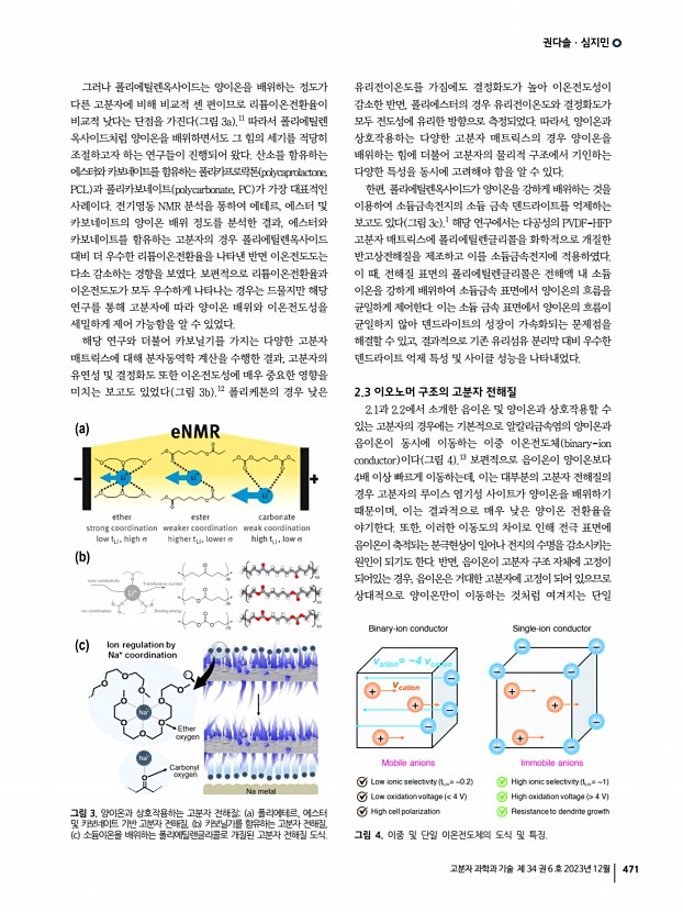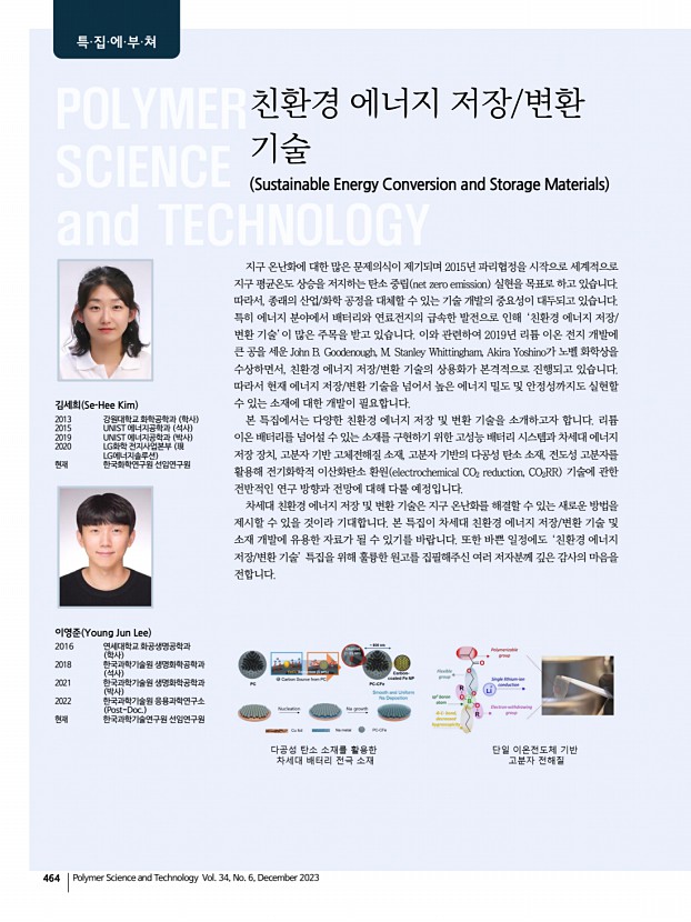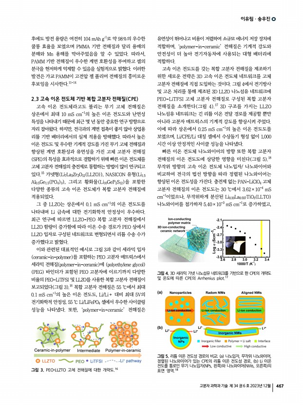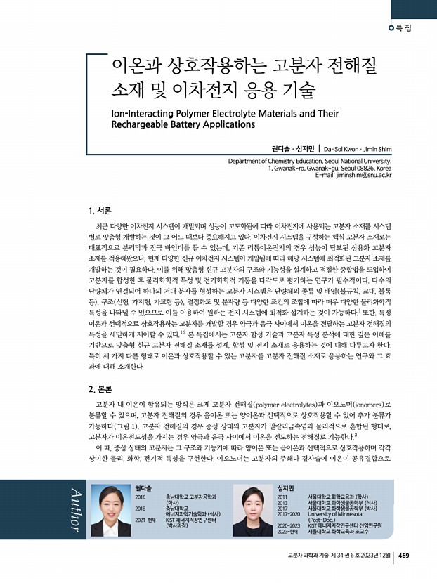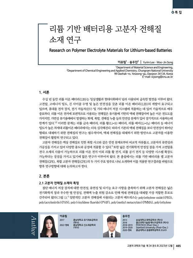 특 집 고분자 과학과 기술 제 34 권 6 호 2023년 12월 465 1. 서론 수십 년 동안 리튬 이온 배터리 LIB 는 일상생활과 현대사회에서 널리 사용되며 급속한 발전을 이루어 왔다. 고전압, 고에너지 밀도, 긴 사이클 수명 및 높은 안전성을 갖춘 리튬 이온 배터리 LIB 의 개발이 요구되고 있으며, 휴대용 전자 장치, 전기 자동차 EV 및 기타 에너지 저장 시스템에 적용하는 데 있어 기술적으로 매우 중요하다. 리튬 이온 전지에 보편적으로 사용되는 전해질은 유기용매 기반의 액체 전해질이며 높은 이온 전도도를 가지지만, 가연성 유기용매에서 발생하는 화재, 폭발, 전해질 누출 등의 안전성 문제가 있어 장기적으로 사용하는데 한계가 있다.1,2 이러한 문제는 리튬 금속 배터리, 리튬 황 Li-S 배터리, 리튬 에어 Li-O2 배터리 등 에너지 밀도가 높은 차세대 리튬이온 배터리...