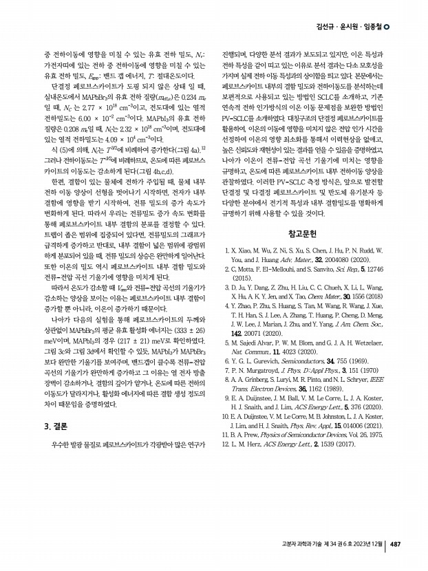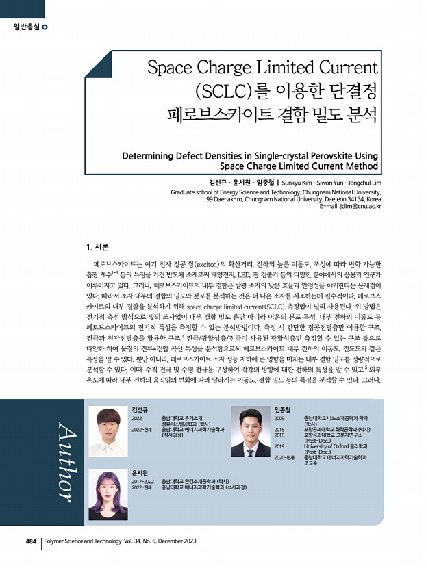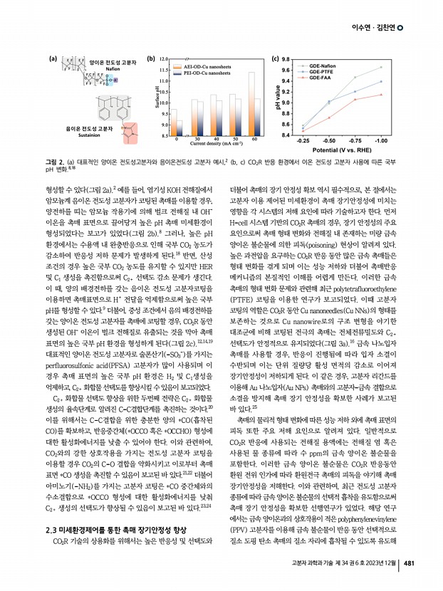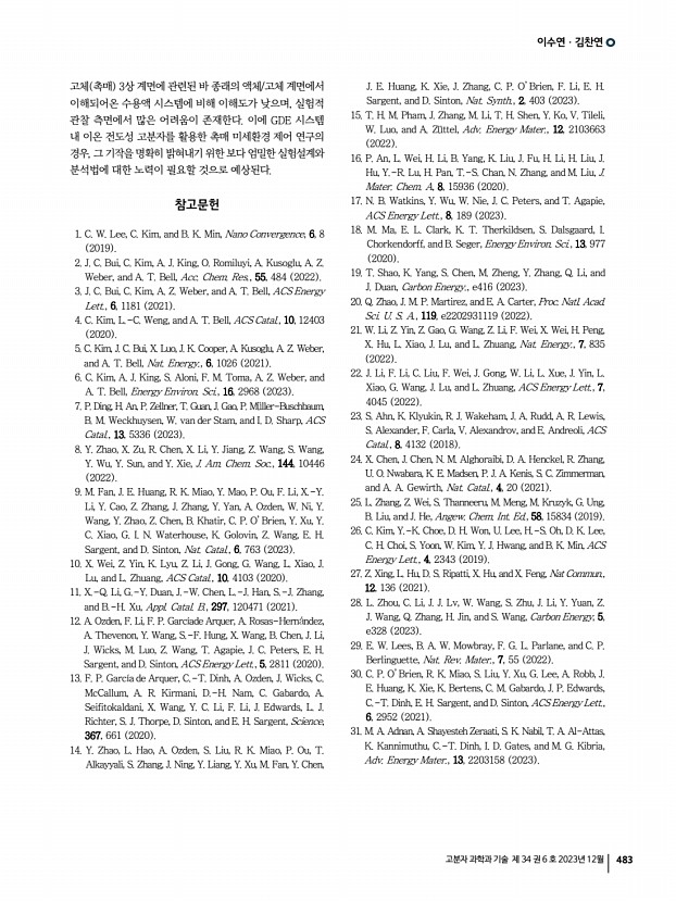 이수연ㆍ김찬연 고분자 과학과 기술 제 34 권 6 호 2023년 12월 483 고체 촉매 3상 계면에 관련된 바 종래의 액체/고체 계면에서 이해되어온 수용액 시스템에 비해 이해도가 낮으며, 실험적 관찰 측면에서 많은 어려움이 존재한다. 이에 GDE 시스템 내 이온 전도성 고분자를 활용한 촉매 미세환경 제어 연구의 경우, 그 기작을 명확히 밝혀내기 위한 보다 엄밀한 실험설계와 분석법에 대한 노력이 필요할 것으로 예상된다. 참고문헌 1. C. W. Lee, C. Kim, and B. K. Min, Nano Convergence, 6, 8 2019 2. J. C. Bui, C. Kim, A. J. King, O. Romiluyi, A. Kusoglu, A. Z. Weber, and A. T. Bell, Acc. Chem. Res., 55, 484 2022 3. J. C. Bui, C. Kim, A. Z. Weber, and A. T. Bell, ACS Energy Lett., 6, 1181 2021 4. C. Kim, L.-C. Weng, and A. T. Bell, ACS Catal., 10, 12403 2020 5. C. Kim, J. C. Bui, X. Luo, J. K. Cooper, A. Kusoglu, A. Z. Weber, and A. T. Bell, Nat. Energy., 6, 1026 ...