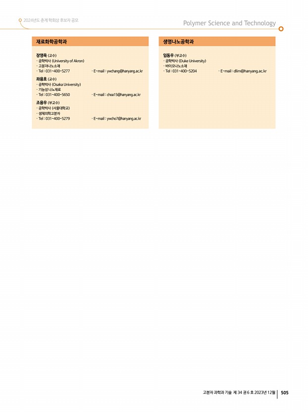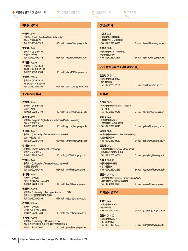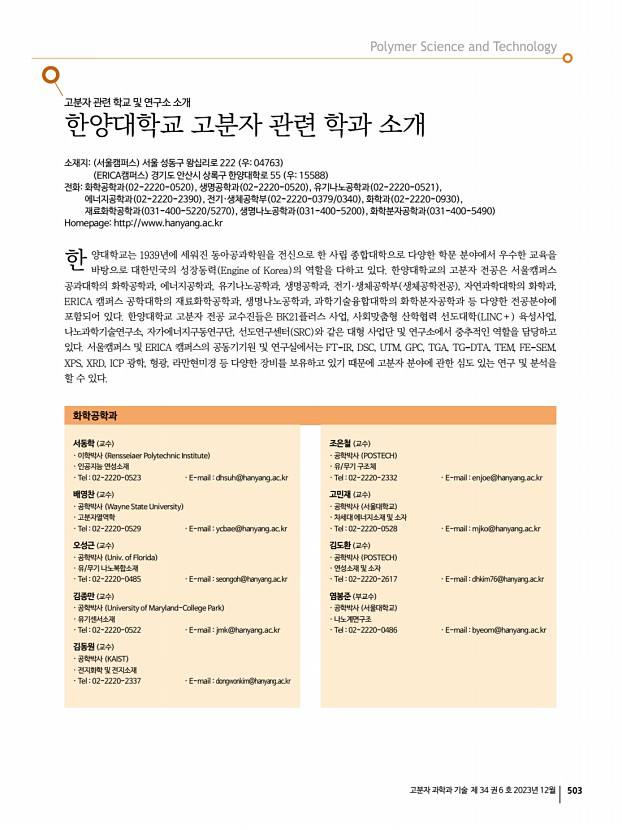 고분자 과학과 기술 제 34 권 6 호 2023년 12월 503 고분자 관련 학교 및 연구소 소개 한양대학교 고분자 관련 학과 소개 소재지서울캠퍼스 서울 성동구 왕십리로 222 우04763 ERICA캠퍼스 경기도 안산시 상록구 한양대학로 55 우15588 전화화학공학과 02-2220-0520 , 생명공학과 02-2220-0520 , 유기나노공학과 02-2220-0521 , 에너지공학과 02-2220-2390 , 전기·생체공학부 02-2220-0379/0340 , 화학과 02-2220-0930 , 재료화학공학과 031-400-5220/5270 , 생명나노공학과 031-400-5200 , 화학분자공학과 031-400-5490 Homepagehttp//www.hanyang.ac.kr 양대학교는 1939년에 세워진 동아공과학원을 전신으로 한 사립 종합대학으로 다양한 학문 분야에서 우수한 교육을 바탕으로 대한민국의 성장동력 Engine of Korea 의 역할을 다하고 있다. 한양대학교의 고분자 전공은 서울캠퍼스 공과대학의 화학공학과, 에너지공학과, ...
