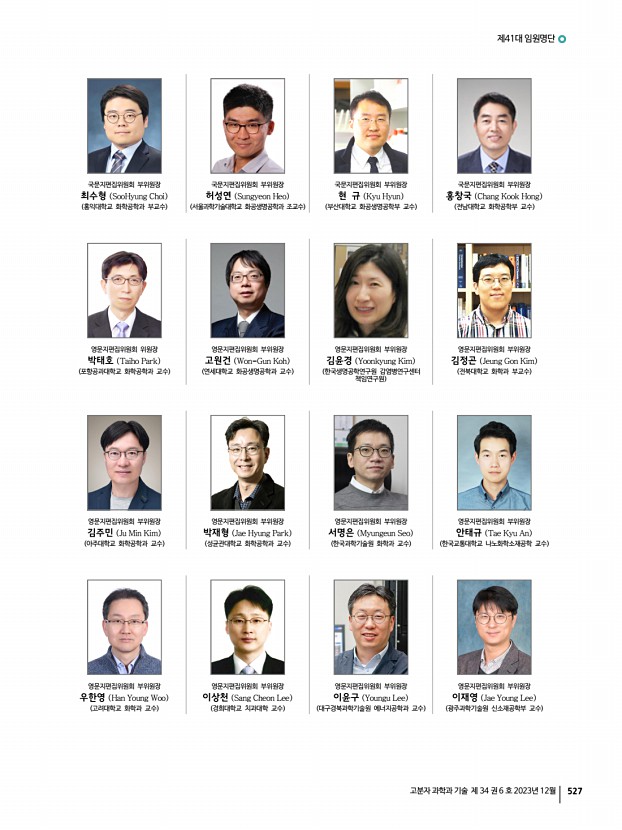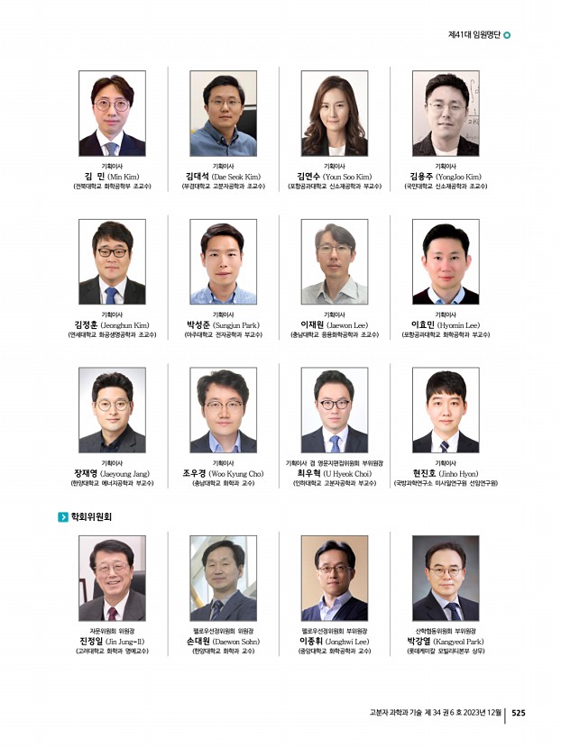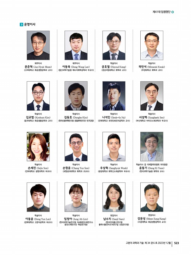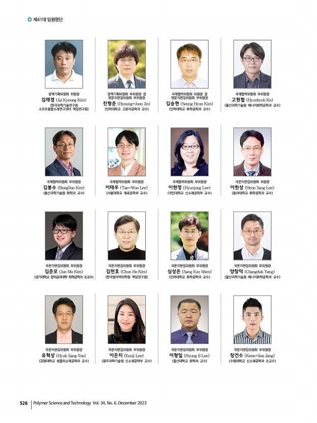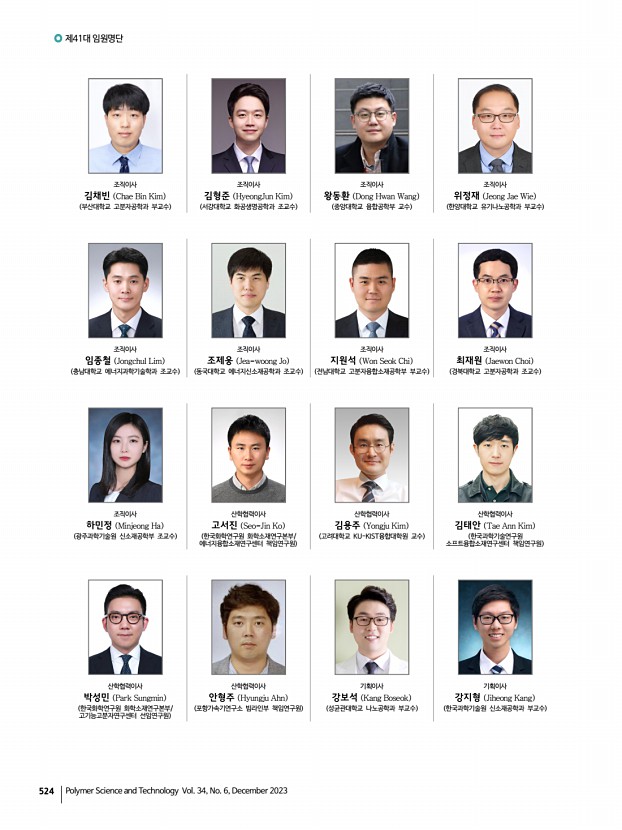 제41대 임원명단 524 Polymer Science and Technology Vol. 34, No. 6, December 2023 조직이사 김채빈 Chae Bin Kim 부산대학교 고분자공학과 부교수 조직이사 김형준 HyeongJun Kim 서강대학교 화공생명공학과 조교수 조직이사 왕동환 Dong Hwan Wang 중앙대학교 융합공학부 교수 조직이사 위정재 Jeong Jae Wie 한양대학교 유기나노공학과 부교수 조직이사 임종철 Jongchul Lim 충남대학교 에너지과학기술학과 조교수 조직이사 조제웅 Jea-woong Jo 동국대학교 에너지신소재공학과 조교수 조직이사 지원석 Won Seok Chi 전남대학교 고분자융합소재공학부 부교수 조직이사 최재원 Jaewon Choi 경북대학교 고분자공학과 조교수 조직이사 하민정 Minjeong Ha 광주과학기술원 신소재공학부 조교수 산학협력이사 고서진 Seo-Jin Ko 한국화학연구원 화학소재연구본부/ 에너지융합소재연구센터 책임연구원 산학...