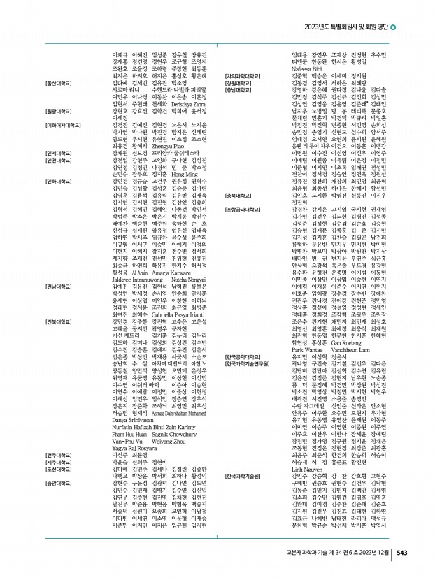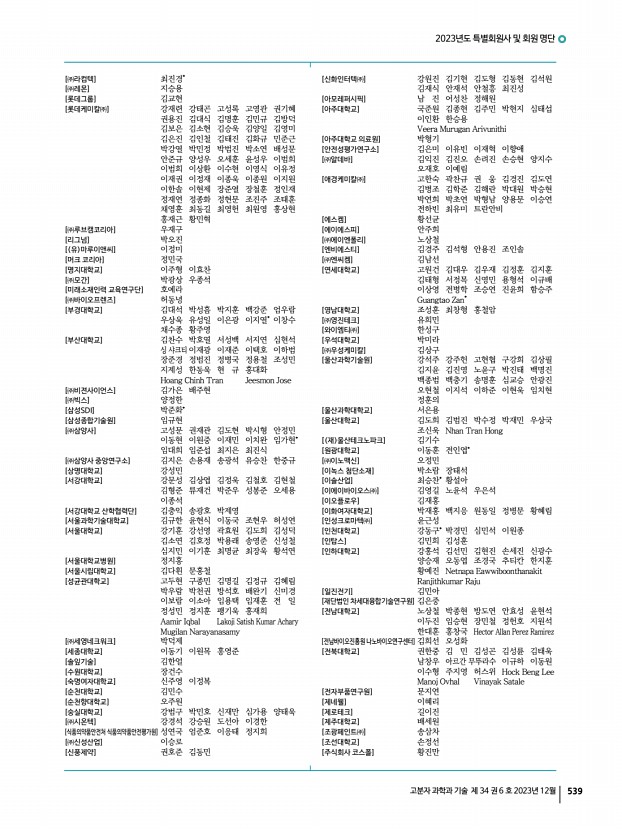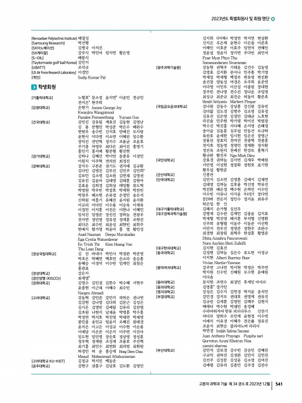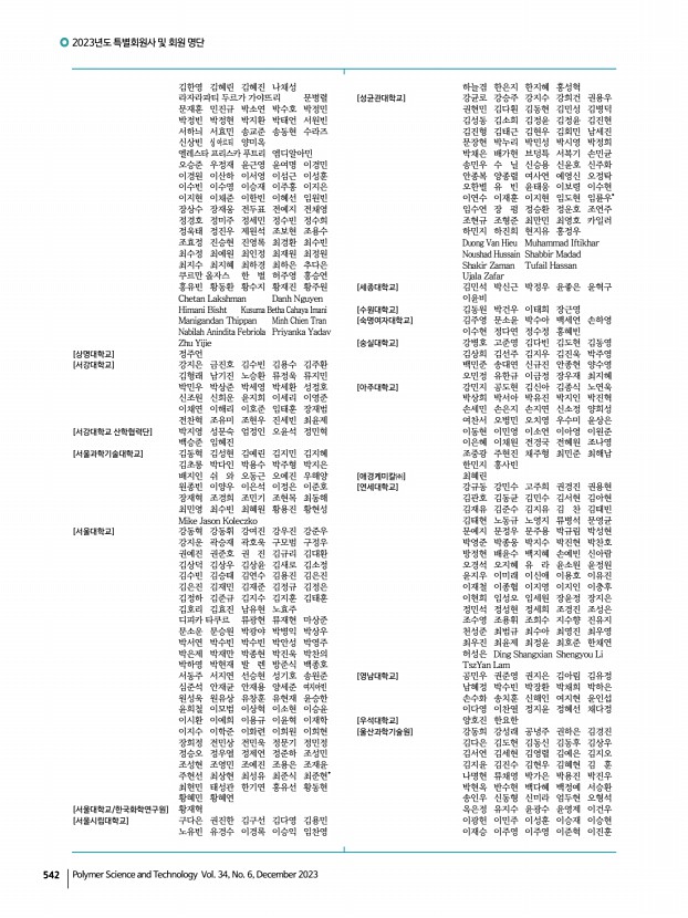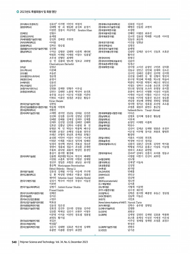 2023년도 특별회원사 및 회원 명단 540 Polymer Science and Technology Vol. 34, No. 6, December 2023 [주식회사 트윈위즈] 김유진* 이가현 이민석 허창석 [중앙대학교] 김태형 양 쇠 왕동환 윤성호 윤정기 이창연 장웅식 차낫차몬 Ibrahim Khan [진에딧] 김법수 [진에딧코리아] 윤세열 [차세대융합기술연구원] 강성호 김예경 주호연 [차의과학대학교] 이아름 [창원대학교] 김하은 양승철 [철원플라즈마산업기술연구원] 강진현 [충남대학교] 구자승 김병관 김태현 나준희 래티튀 박원호 이재범 이재원 이창수 임종철* 조우경 진형민 최재학 [충북대학교] 김 민 김용대 양도현 임보규 조화영 Chantsalnyam Bariashir [코닝] 김영곤 [코스맥스㈜] 이준배 [코오롱] 조동준 [코오롱인더스트리㈜] 정순영 [태경ECO㈜] 윤영서 [㈜테라온] 김윤진 [텍스타일리] 김승우 [포항가속기연구소] 김영용 김제...