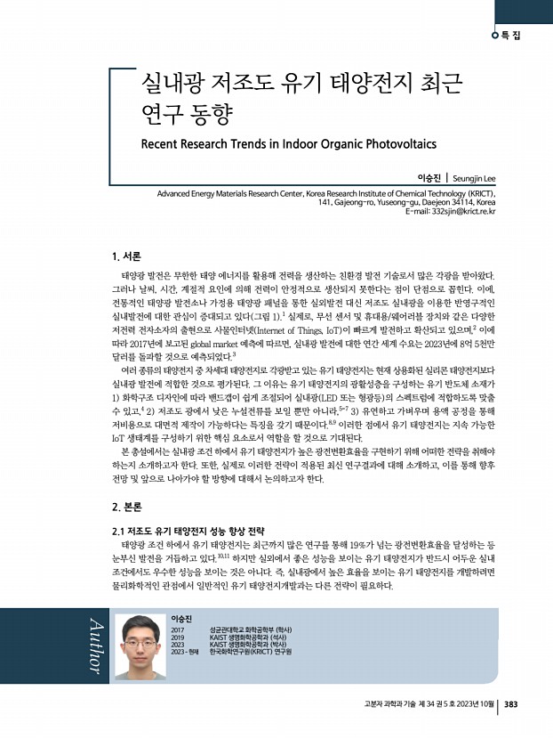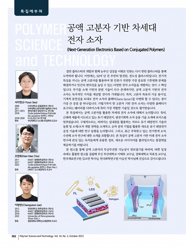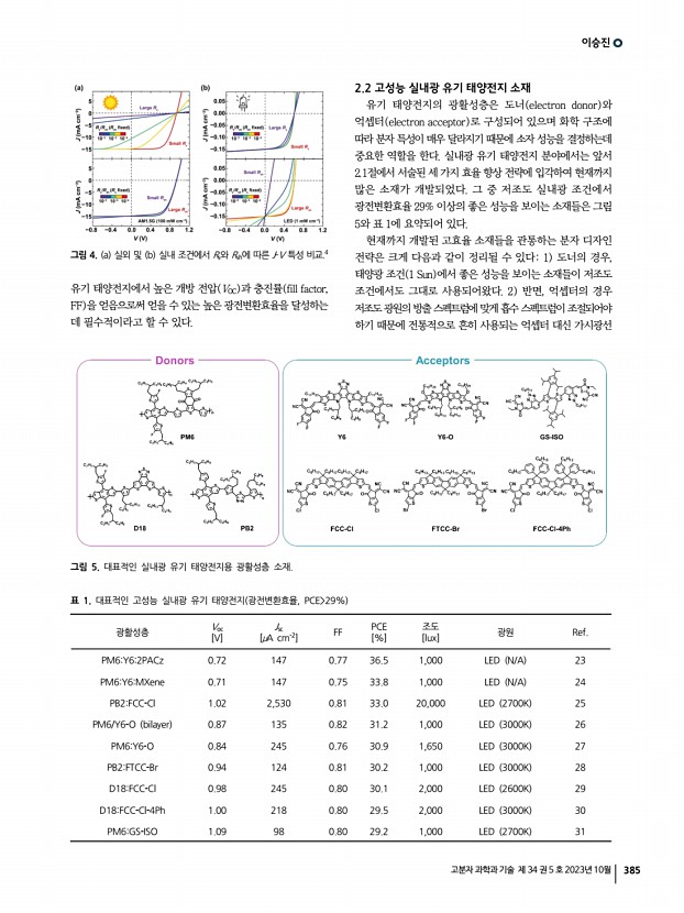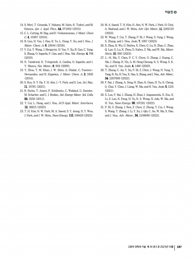 이승진 고분자 과학과 기술 제 34 권 5 호 2023년 10월 387 14. S. Mori, T. Gotanda, Y. Nakano, M. Saito, K. Todori, and M. Hosoya, Jpn. J. Appl. Phys., 54, 071602 2015 15. C. L. Cutting, M. Bag, and D. Venkataraman, J. Mater. Chem C, 4, 10367 2016 16. B. Gao, H. Yao, J. Hou, R. Yu, L. Hong, Y. Xu, and J. Hou, J. Mater. Chem. A, 6, 23644 2018 17. Y. Cui, Y. Wang, J. Bergqvist, H. Yao, Y. Xu, B. Gao, C. Yang, S. Zhang, O. Ingan s, F. Gao, and J. Hou, Nat. Energy, 4, 768 2019 18. K. Vandewal, K. Tvingstedt, A. Gadisa, O. Ingan s, and J. V. Manca, Nat. Mater., 8, 904 2009 19. Y. Zhou, T. M. Khan, J. W. Shim, A. Dindar, C. Fuentes- Hernandez, and B. Kippelen, J. Mater. Chem. A, 2, 3492 2014 20. S. Ryu, N. Y. Ha, Y. H. Ahn, J.-Y. Park, and S. Lee, Sci. Rep., 11, 16781 2021 21. R. Steim, T. Ameri, P. Schilinsky, C. Waldauf, G. Dennler, M. Scharber, and C. J. Brabec, Sol. Energy Mater. Sol. Cells, 95, 3256 2011 22. Y. Cui, L. Hong, and J. Hou, ACS Appl. Mater. Interfaces, 12, 3881...
