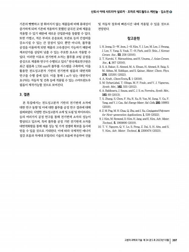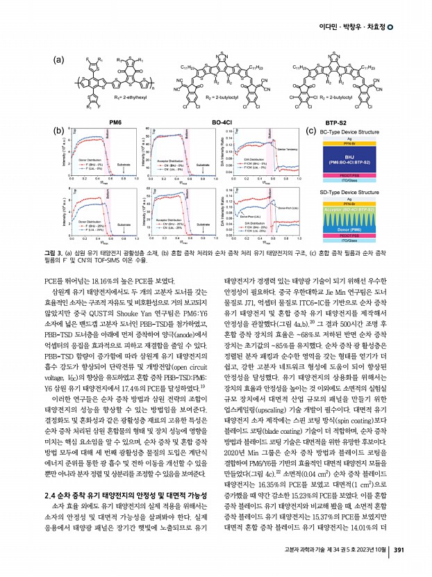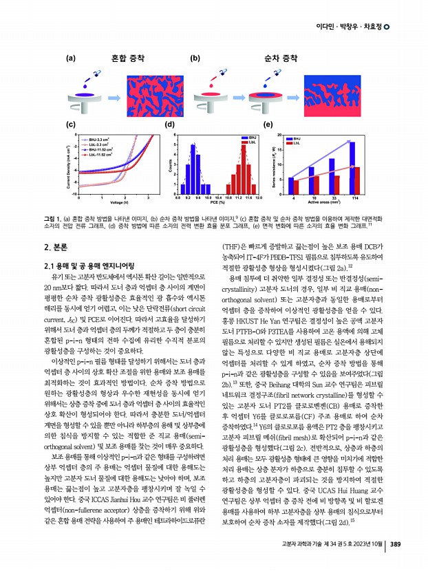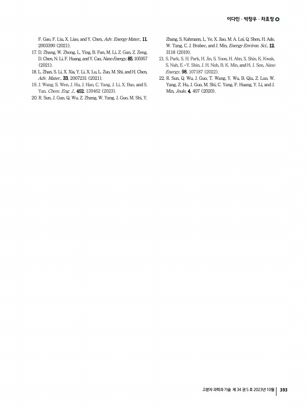 이다민ㆍ박창우ㆍ차효정 고분자 과학과 기술 제 34 권 5 호 2023년 10월 393 F. Gao, F. Liu, X. Liao, and Y. Chen, Adv. Energy Mater., 11, 2003390 2021 17. D. Zhang, W. Zhong, L. Ying, B. Fan, M. Li, Z. Gan, Z. Zeng, D. Chen, N. Li, F. Huang, and Y. Cao, Nano Energy, 85, 105957 2021 18. L. Zhan, S. Li, X. Xia, Y. Li, X. Lu, L. Zuo, M. Shi, and H. Chen, Adv. Mater., 33, 2007231 2021 19. J. Wang, S. Wen, J. Hu, J. Han, C. Yang, J. Li, X. Bao, and S. Yan, Chem. Eng. J., 452, 139462 2023 20. R. Sun, J. Guo, Q. Wu, Z. Zhang, W. Yang, J. Guo, M. Shi, Y. Zhang, S. Kahmann, L. Ye, X. Jiao, M. A. Loi, Q. Shen, H. Ade, W. Tang, C. J. Brabec, and J. Min, Energy Environ. Sci., 12, 3118 2019 21. S. Park, S. H. Park, H. Jin, S. Yoon, H. Ahn, S. Shin, K. Kwak, S. Nah, E.-Y. Shin, J. H. Noh, B. K. Min, and H. J. Son, Nano Energy, 98, 107187 2022 22. R. Sun, Q. Wu, J. Guo, T. Wang, Y. Wu, B. Qiu, Z. Luo, W. Yang, Z. Hu, J. Guo, M. Shi, C. Yang, F. Huang, Y. Li, and J. Min, Joule, 4, ...