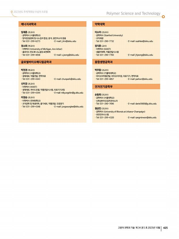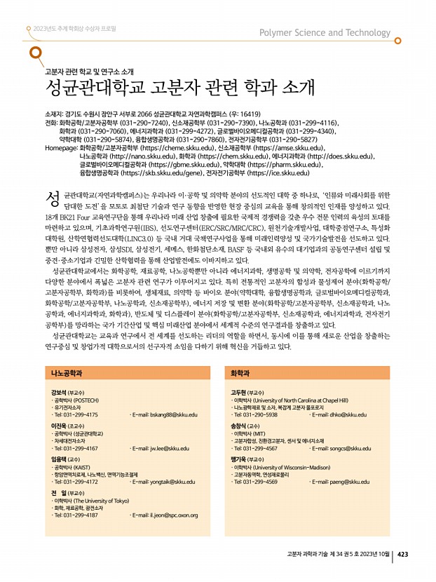 2023년도 추계 학회상 수상자 프로필 고분자 과학과 기술 제 34 권 5 호 2023년 10월 423 고분자 관련 학교 및 연구소 소개 성균관대학교 고분자 관련 학과 소개 소재지경기도 수원시 장안구 서부로 2066 성균관대학교 자연과학캠퍼스 우16419 전화화학공학/고분자공학부 031-290-7240 , 신소재공학부 031-290-7390 , 나노공학과 031-299-4116 , 화학과 031-290-7060 , 에너지과학과 031-299-4272 , 글로벌바이오메디컬공학과 031-299-4340 , 약학대학 031-290-5874 , 융합생명공학과 031-290-7860 , 전자전기공학부 031-290-5827 Homepage화학공학/고분자공학부 https//cheme.skku.edu , 신소재공학부 https//amse.skku.edu , 나노공학과 http//nano.skku.edu , 화학과 https//chem.skku.edu , 에너지과학과 http//does.skku.edu , 글로벌바이오메디컬공학과 https//gbme.skku.edu , 약학대학 https//pharm.skku.edu , 융합생명공학과 https//skb.skku.edu/gene ...