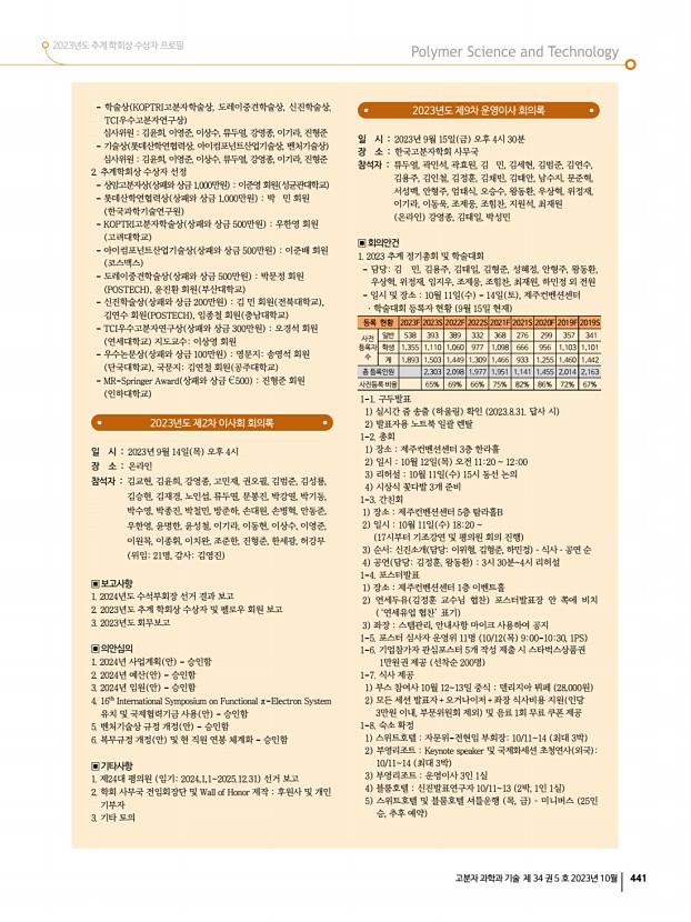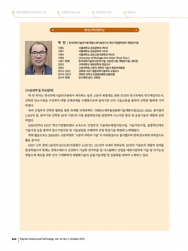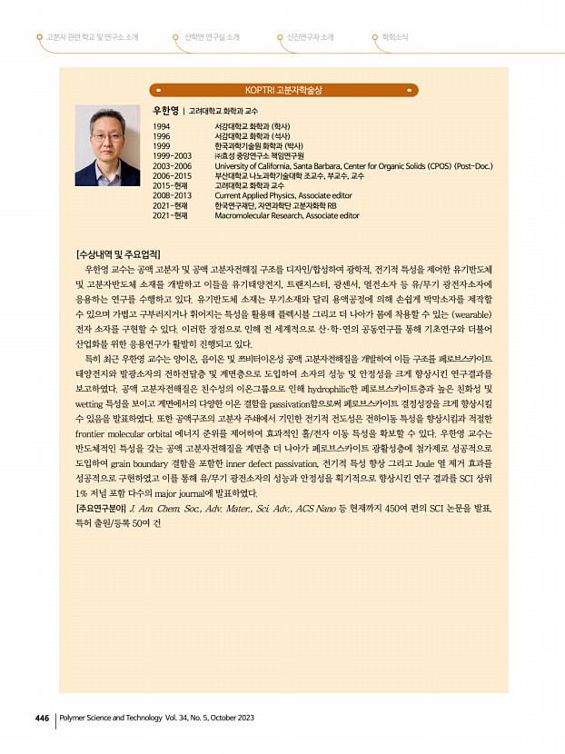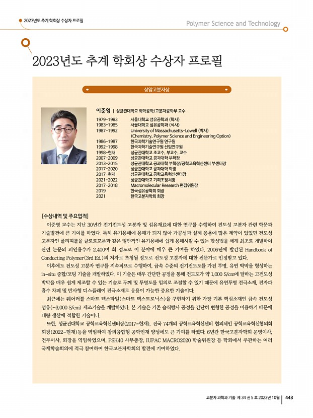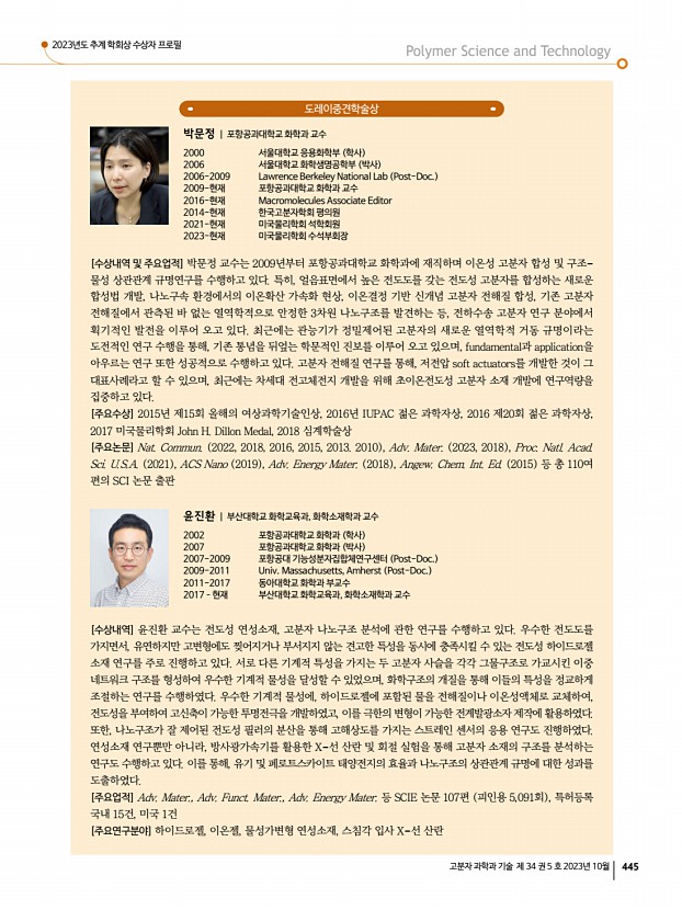 2023년도 추계 학회상 수상자 프로필 고분자 과학과 기술 제 34 권 5 호 2023년 10월 441 학술상 KOPTRI고분자학술상, 도레이중견학술상, 신진학술상, TCI우수고분자연구상 심사위원 김윤희, 이영준, 이상수, 류두열, 강영종, 이기라, 진형준 기술상 롯데산학연협력상, 아이컴포넌트산업기술상, 벤처기술상 심사위원 김윤희, 이영준, 이상수, 류두열, 강영종, 이기라, 진형준 2. 추계학회상 수상자 선정 상암고분자상 상패와 상금 1,000만원 이준영 회원 성균관대학교 롯데산학연협력상 상패와 상금 1,000만원 박 민 회원 한국과학기술연구원 KOPTRI고분자학술상 상패와 상금 500만원 우한영 회원 고려대학교 아이컴포넌트산업기술상 상패와 상금 500만원 이준배 회원 코스맥스 도레이중견학술상 상패와 상금 500만원 박문정 회원 POSTECH , 윤진환 회원 부산대학교 신진학술...