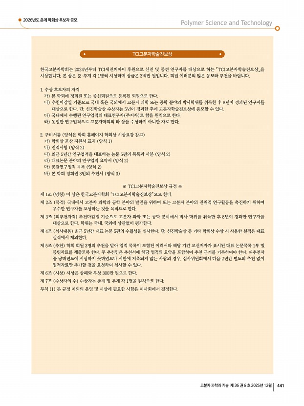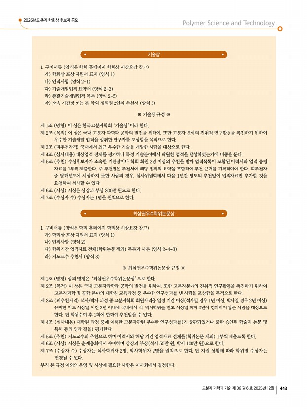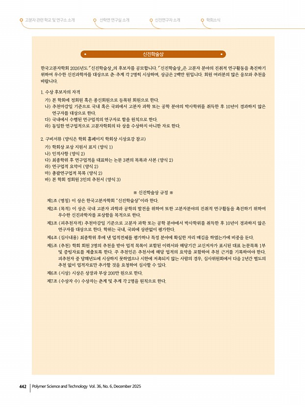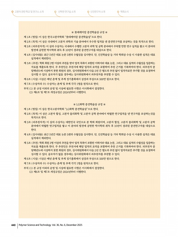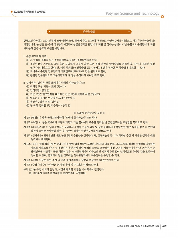 2026년도 춘계 학회상 후보자 공모 고분자 과학과 기술 제 36 권 6 호 2025년 12월 439 중견학술상 한국고분자학회는 2024년부터 도레이첨단소재, 롯데케미칼, LG화학 후원으로 중견연구자를 대상으로 하는 「중견학술상」을 시상합니다. 본 상은 춘·추계 각 3명씩 시상하며 상금은 5백만 원입니다. 지원 및 심사는 상별이 아닌 통합으로 운영합니다. 회원 여러분의 많은 응모와 추천을 바랍니다. 1. 수상 후보자의 자격 가 본 학회에 정회원 또는 종신회원으로 등록된 중견회원으로 한다. 나 추천마감일 기준으로 국내 혹은 국외에서 고분자 과학 또는 공학 분야의 박사학위를 취득한 후 10년이 경과된 중견 연구자를 대상으로 한다. 단, 이전 학회상 신진학술상 등 수상자는 5년이 경과한 후 학술상에 응모할 수 있다. 다 국내에서 수행된 연구업적의 대표연구자 주...