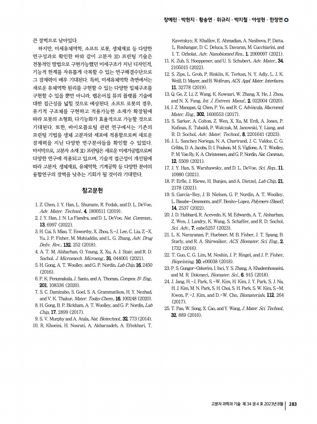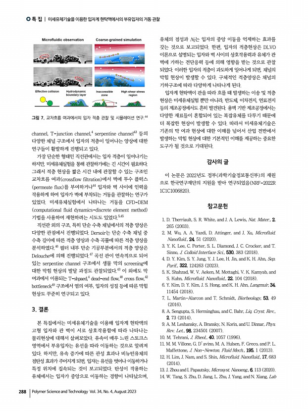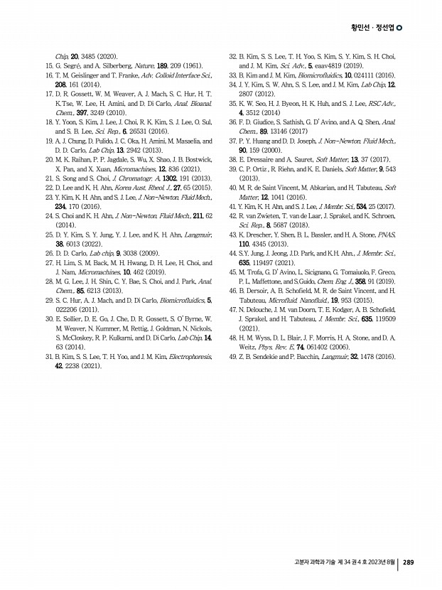 황민선ㆍ정선엽 고분자 과학과 기술 제 34 권 4 호 2023년 8월 289 Chip, 20, 3485 2020 15. G. Segr , and A. Silberberg, Nature, 189, 209 1961 16. T. M. Geislinger and T. Franke, Adv. Colloid Interface Sci., 208, 161 2014 17. D. R. Gossett, W. M. Weaver, A. J. Mach, S. C. Hur, H. T. K.Tse, W. Lee, H. Amini, and D. Di Carlo, Anal. Bioanal. Chem., 397, 3249 2010 18. Y. Yoon, S. Kim, J. Lee, J. Choi, R. K. Kim, S. J. Lee, O. Sul, and S. B. Lee, Sci. Rep., 6, 26531 2016 19. A. J. Chung, D. Pulido, J. C. Oka, H. Amini, M. Masaelia, and D. D. Carlo, Lab Chip, 13, 2942 2013 20. M. K. Raihan, P. P. Jagdale, S. Wu, X. Shao, J. B. Bostwick, X. Pan, and X. Xuan, Micromachines, 12, 836 2021 21. S. Song and S. Choi, J. Chromatogr. A, 1302, 191 2013 22. D. Lee and K. H. Ahn, Korea Aust. Rheol. J., 27, 65 2015 23. Y. Kim, K. H. Ahn, and S. J. Lee, J. Non-Newton. Fluid Mech., 234, 170 2016 24. S. Choi and K. H. Ahn, J. Non-Newton. Fluid Mech., 211, 62 2014 25. D. Y. Kim, S. Y. Jung, Y. ...