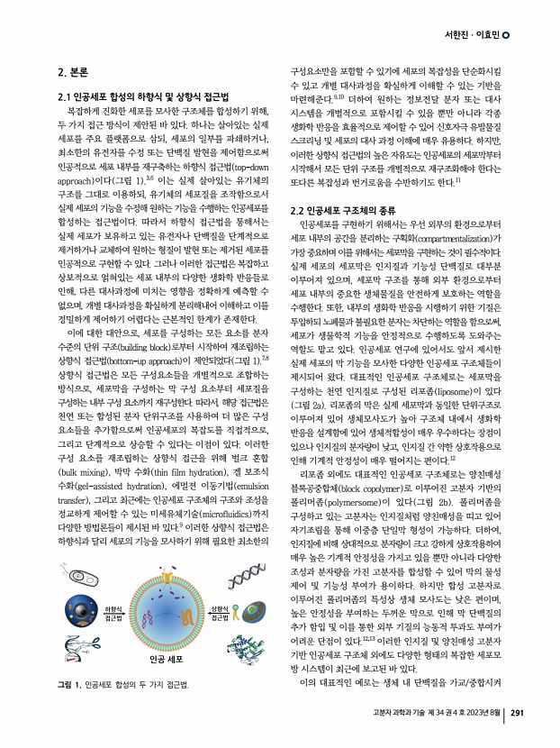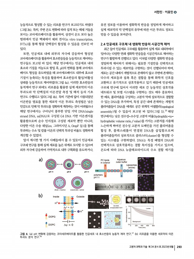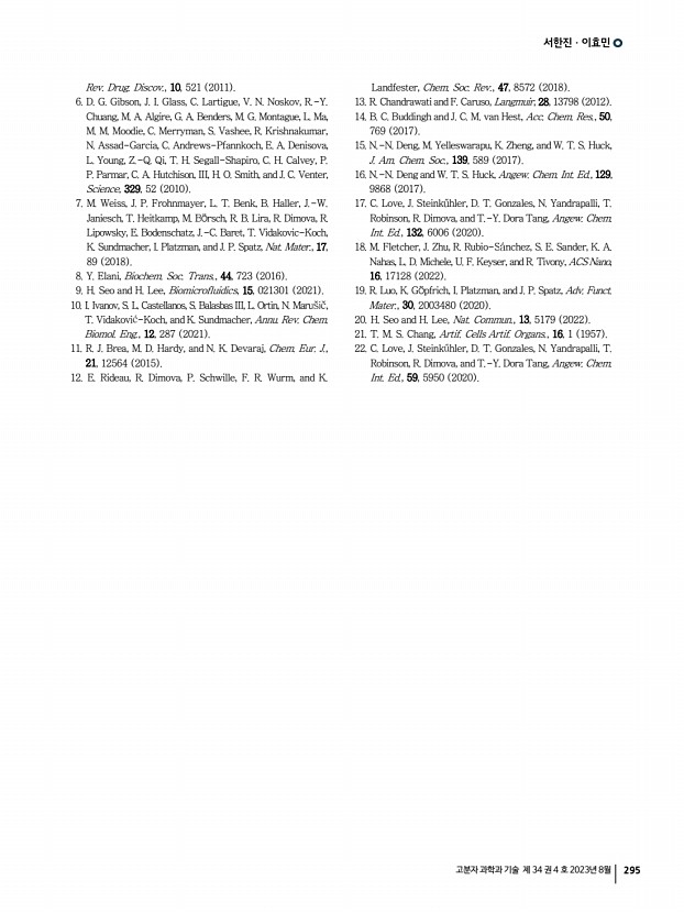 서한진ㆍ이효민 고분자 과학과 기술 제 34 권 4 호 2023년 8월 295 Rev. Drug. Discov., 10, 521 2011 6. D. G. Gibson, J. I. Glass, C. Lartigue, V. N. Noskov, R.-Y. Chuang, M. A. Algire, G. A. Benders, M. G. Montague, L. Ma, M. M. Moodie, C. Merryman, S. Vashee, R. Krishnakumar, N. Assad-Garcia, C. Andrews-Pfannkoch, E. A. Denisova, L. Young, Z.-Q. Qi, T. H. Segall-Shapiro, C. H. Calvey, P. P. Parmar, C. A. Hutchison, III, H. O. Smith, and J. C. Venter, Science, 329, 52 2010 7. M. Weiss, J. P. Frohnmayer, L. T. Benk, B. Haller, J.-W. Janiesch, T. Heitkamp, M. B rsch, R. B. Lira, R. Dimova, R. Lipowsky, E. Bodenschatz, J.-C. Baret, T. Vidakovic-Koch, K. Sundmacher, I. Platzman, and J. P. Spatz, Nat. Mater., 17, 89 2018 8. Y. Elani, Biochem. Soc. Trans., 44, 723 2016 9. H. Seo and H. Lee, Biomicrofluidics, 15, 021301 2021 10. I. Ivanov, S. L. Castellanos, S. Balasbas III, L. Ortin, N. Maru i , T. Vidakovi -Koch, and K. Sundmacher, Annu. Rev. Chem. Biomol. Eng., 12, 287 2021...