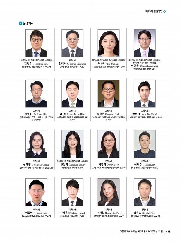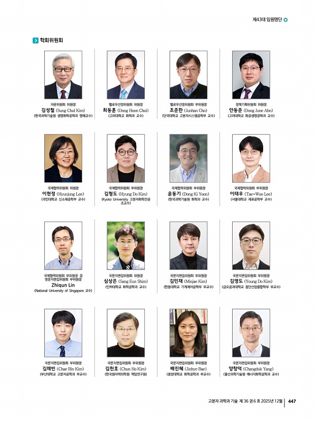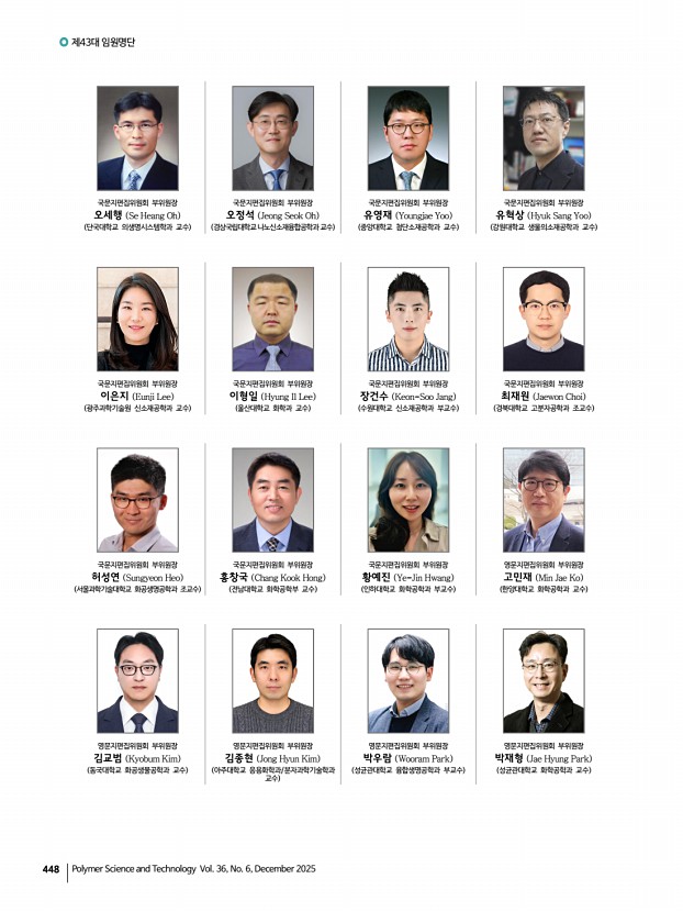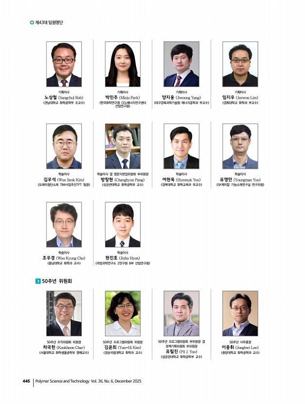 444 Polymer Science and Technology Vol. 36, No. 6, December 2025 제43대 회장 김영섭 Young Seop Kim 도레이첨단소재 대표이사 사장 수석부회장 겸 학회발전위원회 위원장 이택승 Taek Seung Lee 충남대학교 유기재료공학과 교수 부회장 김동욱 Dong Wook Kim 한국화학연구원 화학소재연구본부 책임연구원 부회장 겸 산학협동위원회 위원장 김동하 Dong Ha Kim 이화여자대학교 화학나노과학과 교수 부회장 겸 영문지편집위원회 위원장 김승현 Seung Hyun Kim 인하대학교 화학공학과 교수 부회장 겸 홍보재정위원회 위원장 박천호 Chun Ho Park 코스맥스BTI㈜ R&I 부원장 부회장 양성윤 Sung Yun Yang 충남대학교 유기재료공학과 교수 부회장 겸 학술교육위원회 위원장, 50주년 특집위원회 위원장 이승우 Seung Woo Lee 영남대학교 화학공학부 교수 부회장 정일두 Ildoo Chung 부산대학교 고분자공학과 교수 ...