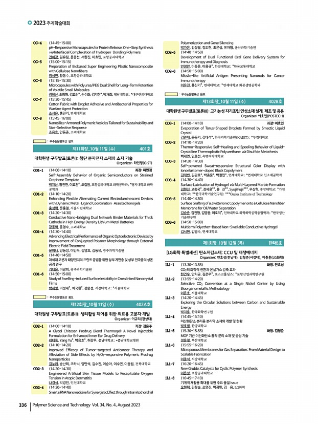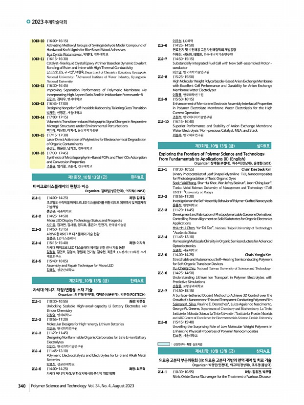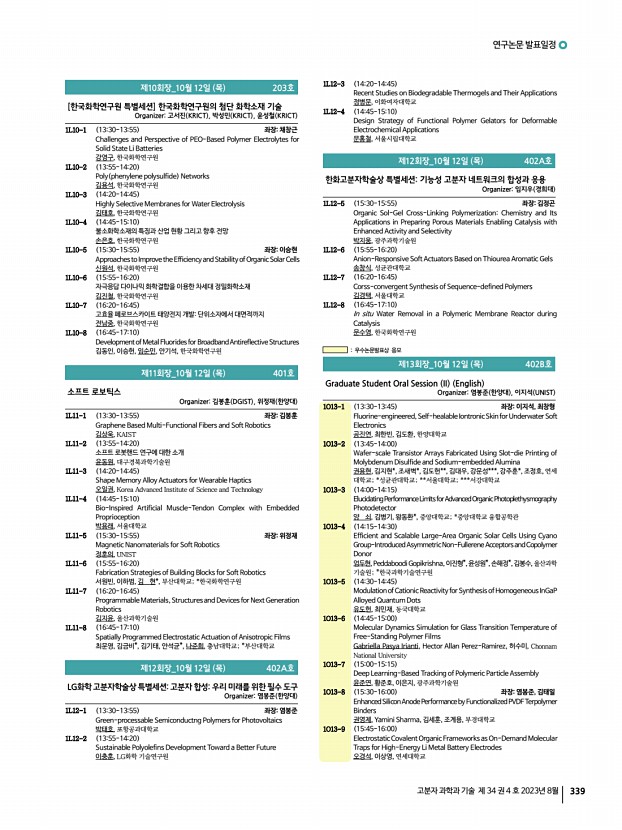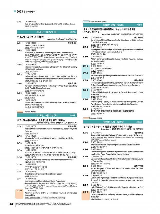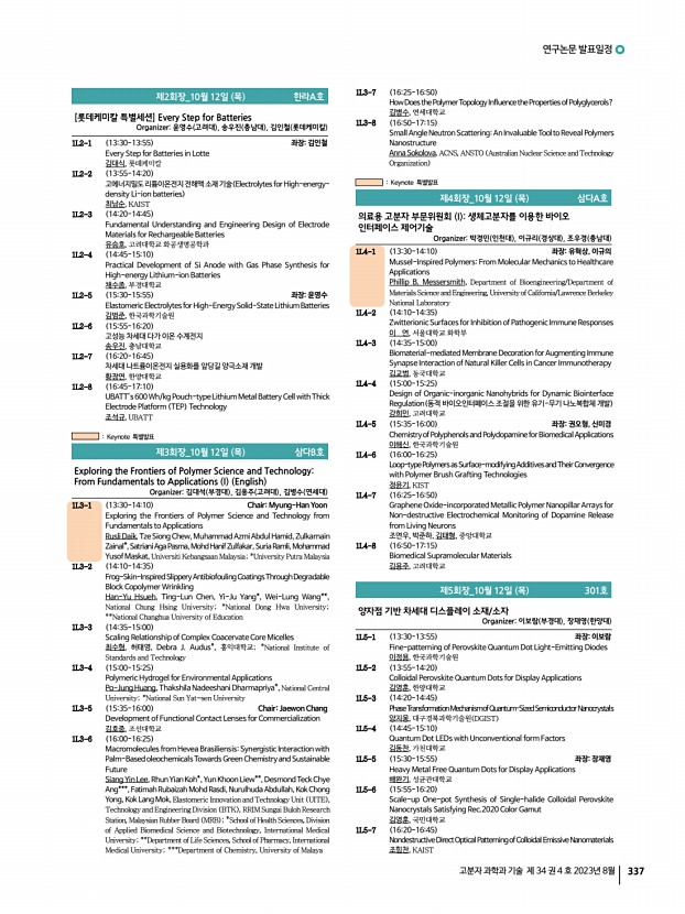 2023 추계학술대회 338 Polymer Science and Technology Vol. 34, No. 4, August 2023 1L5-8 1645-1710 Blue-Emissive Perovskite Quantum Dot for Light-Emitting Diodes 박종현, 전남대학교 제6회장_10월 12일 목 302호 미래소재 심포지엄 과기정통부 Organizer정승준 KIST , 윤성철 KRICT 1L6-1 1330-1355 좌장정승준 100대 미래소재 및 기술로드맵 최부용, 과학기술정보통신부 1L6-2 1355-1420 Multi-layer PCB Materials for Fifth-generation Communication 원종찬, 최영민, 정성묵, 김현기*, 이계웅**, 김복현***, 김진호****, 오승근*****, 권 신******, 윤동기*******, 한국화학연구원; *㈜디엔에프신소재; **㈜아이피 아이테크; ***광주과학기술원; ****한국세라믹기술원; *****엠피닉스㈜; ******한국기계연구원; *******한국과학기술원 1L6-3 1420-1445 Silicone-integrated Anisotropic Lithography for Ultrahigh-density RGB OLED Microdisplay 김도환, 한양대학교 1L6-4 1445-1510 Pre...