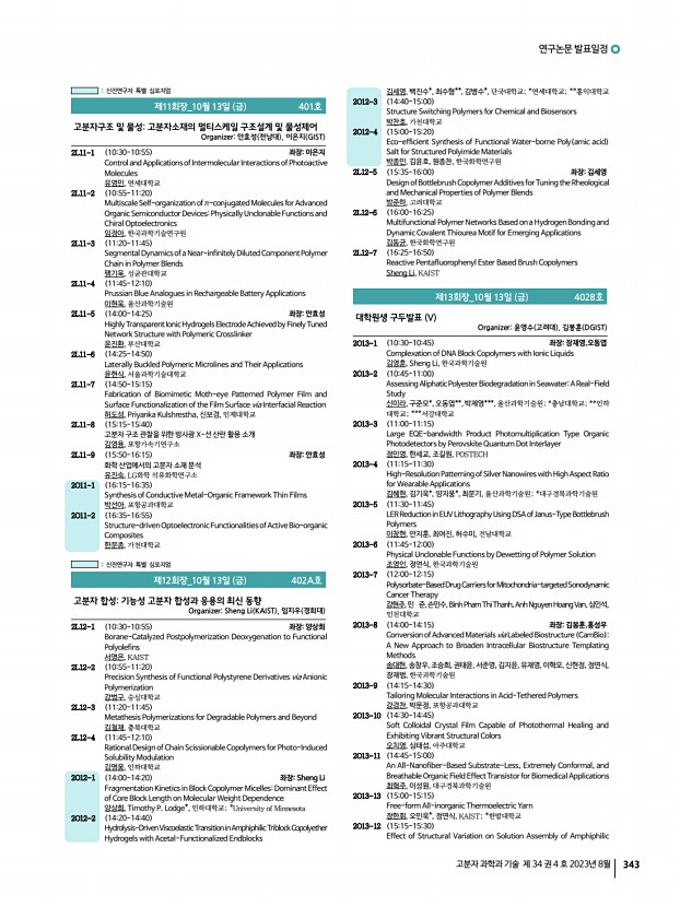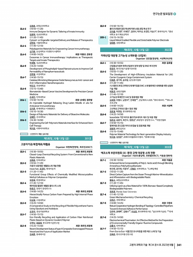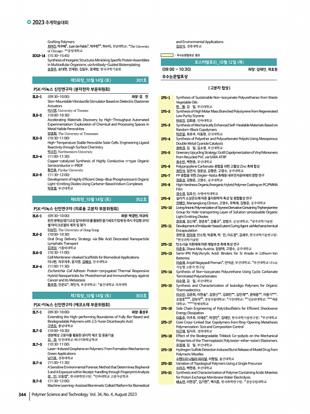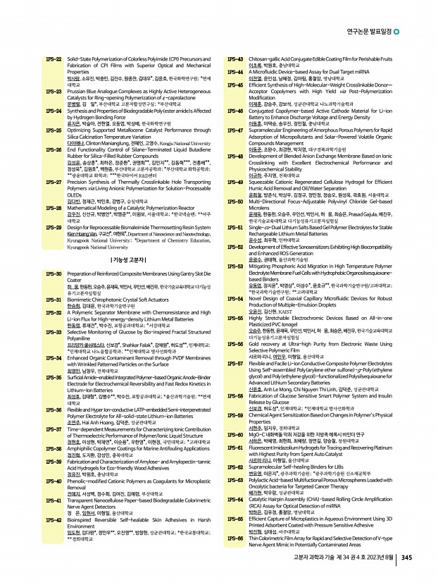 연구논문 발표일정 고분자 과학과 기술 제 34 권 4 호 2023년 8월 345 1PS-22 Solid-State Polymerization of Colorless Polyimide CPI Precursors and Fabrication of CPI Films with Superior Optical and Mechanical Properties 박사랑, 소유진, 박종민, 김진수, 원종찬, 김대우*, 김윤호, 한국화학연구원; *연세 대학교 1PS-23 Prussian Blue Analogue Complexes as Highly Active Heterogeneous Catalysts for Ring-opening Polymerization of ε-caprolactone 문병렬, 김 일*, 부산대학교 고분자합성연구실; *부산대학교 1PS-24 Synthesis and Properties of Biodegradable Poly ester amide s Affected by Hydrogen Bonding Force 류지은, 박슬아, 전현열, 오동엽, 박성배, 한국화학연구원 1PS-25 Optimizing Supported Metallocene Catalyst Performance through Silica Calcination Temperature Variation 다이애나, Clinton Manianglung, 전혜인, 고영수, Kongju National University 1PS-26 End Functionality Control of Silane-Terminated Liqui...