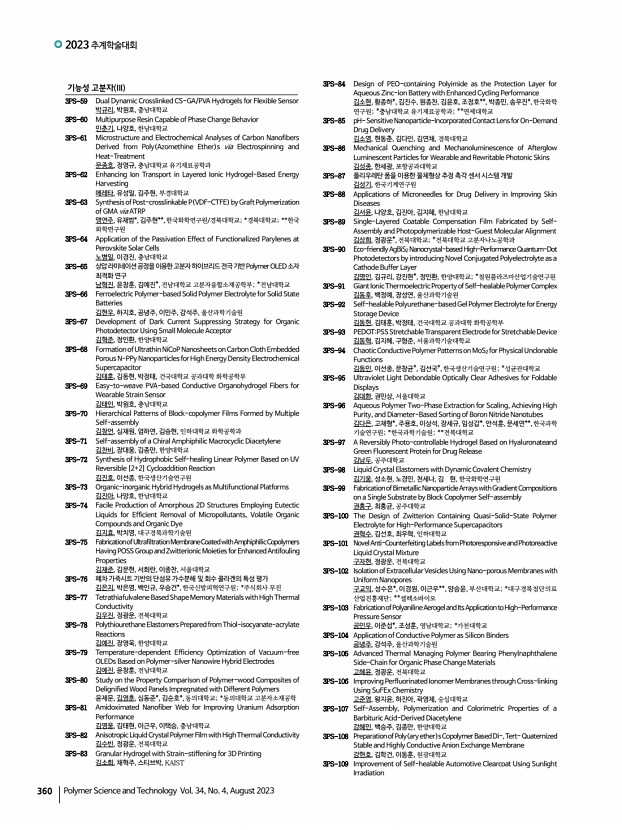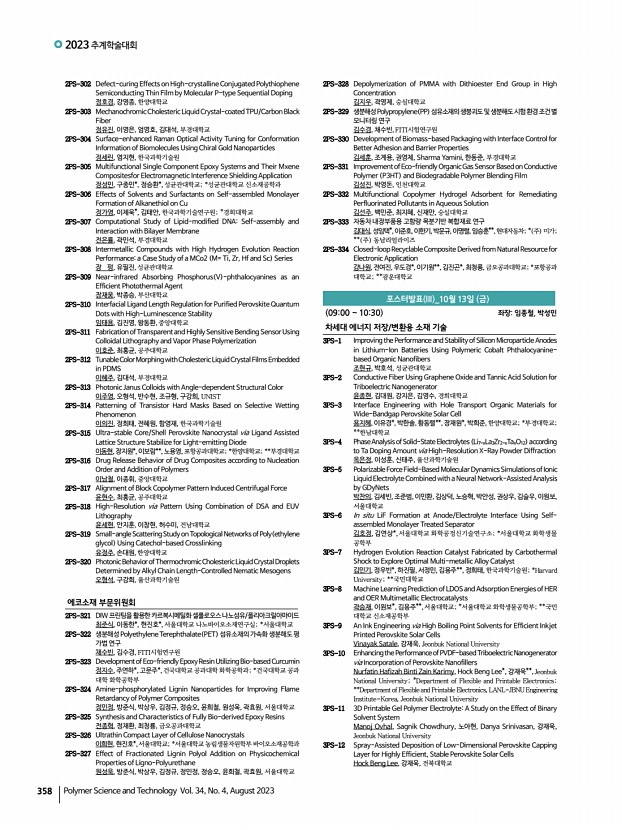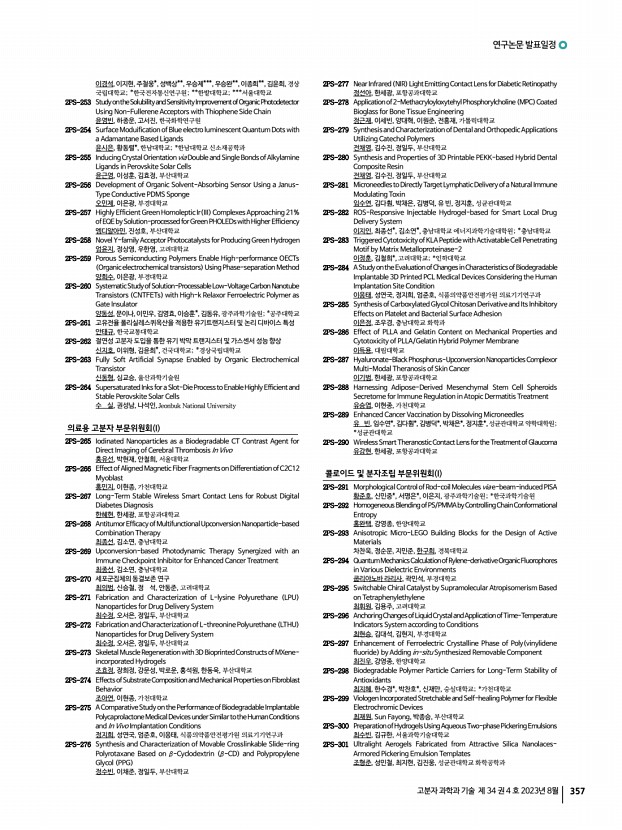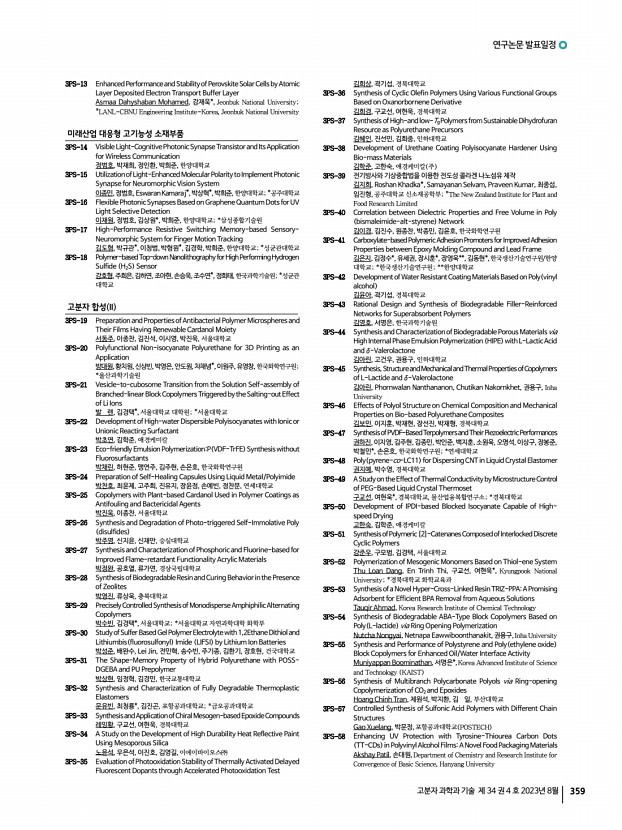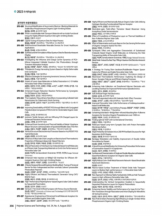 연구논문 발표일정 고분자 과학과 기술 제 34 권 4 호 2023년 8월 357 이경석, 이지현, 주철웅*, 성백상**, 우승제***, 우승완**, 이종희**, 김윤희,경상 국립대학교; *한국전자통신연구원; **한밭대학교; ***서울대학교 2PS-253 StudyontheSolubilityandSensitivityImprovementofOrganicPhotodetector Using Non-Fullerene Acceptors with Thiophene Side Chain 윤영빈, 하종운, 고서진, 한국화학연구원 2PS-254 Surface Moduification of Blue electro luminescent Quantum Dots with a Adamantane Based Ligands 윤시은, 황동렬*,한남대학교; *한남대학교 신소재공학과 2PS-255 Inducing Crystal Orientation via Double and Single Bonds of Alkylamine Ligands in Perovskite Solar Cells 윤근영, 이성훈, 김효정, 부산대학교 2PS-256 Development of Organic Solvent-Absorbing Sensor Using a JanusType Conductive PDMS Sponge 오민제, 이은광, 부경대학교 2PS-257 Highly Efficient Green Homoleptic Ir III Complexes App...